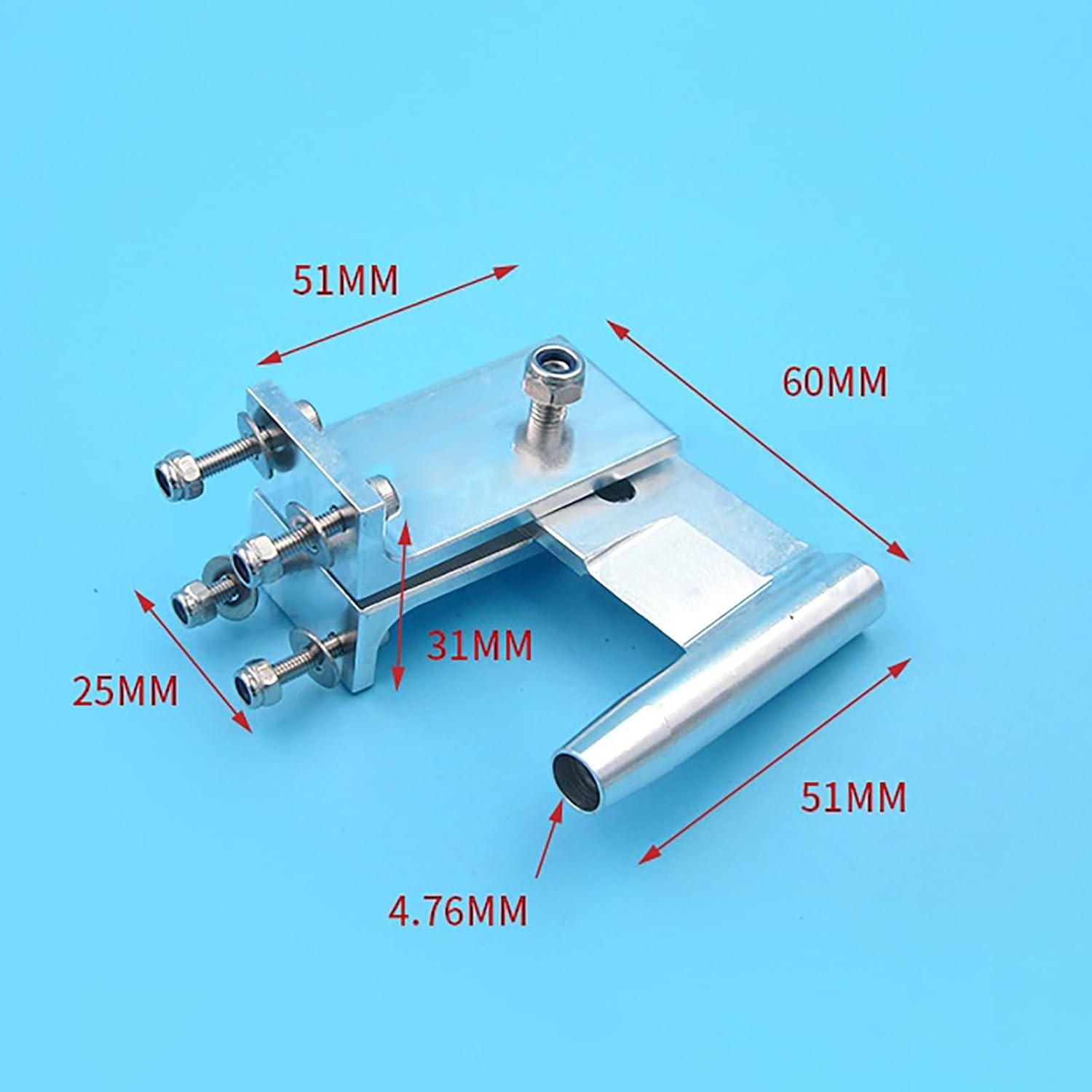 Staffa in alluminio lavorata a CNC for alberi flessibili da 4,76 mm Misura 60 mm di altezza e 51 mm di larghezza con base di montaggio 25×31 mm Garantisce un allineamento stabile e preciso dell'albero nelle barche RC Materiale durevole, leggero e resistente alla corrosione Adatto for barche da regata, barche da esca e modelli personalizzati con scafo a V