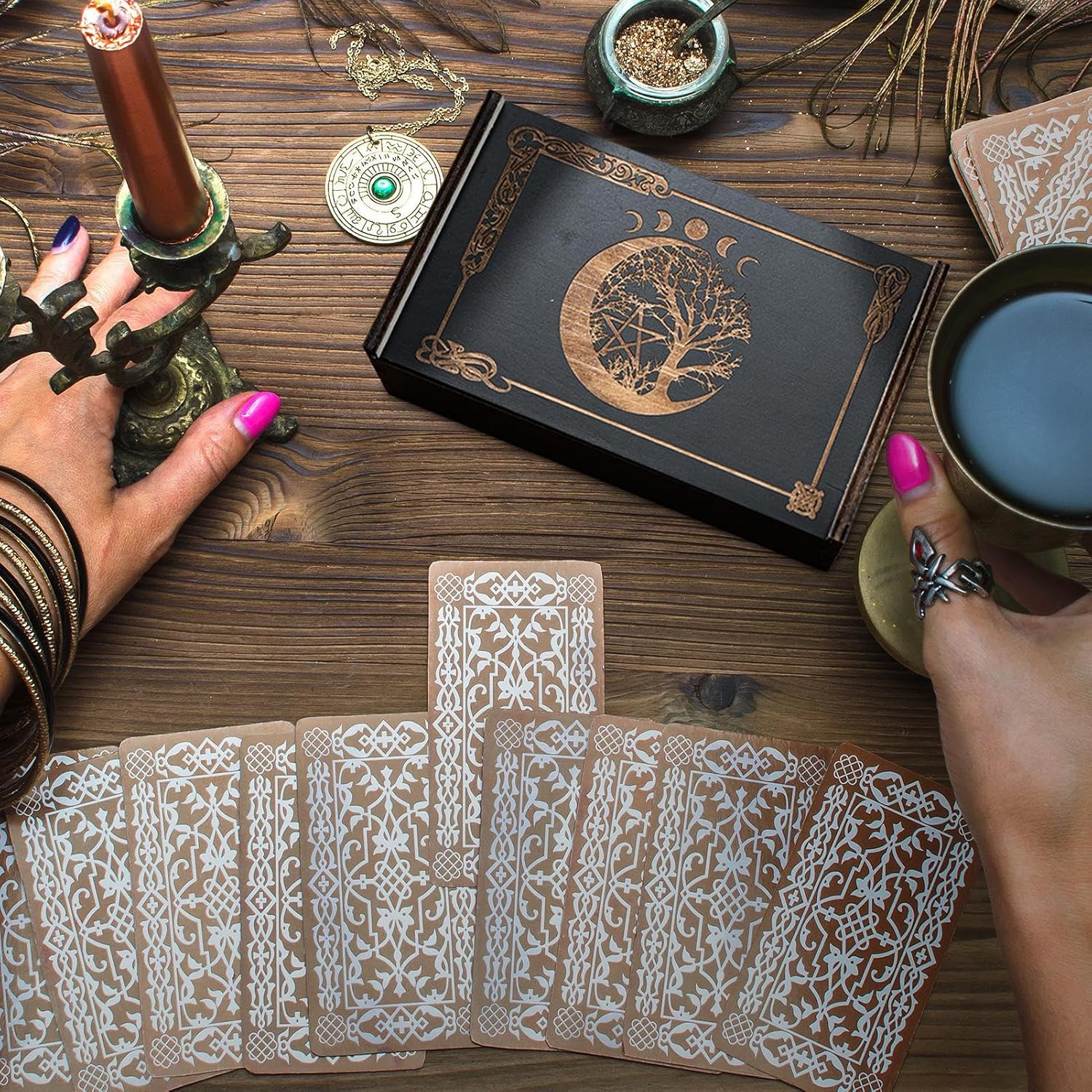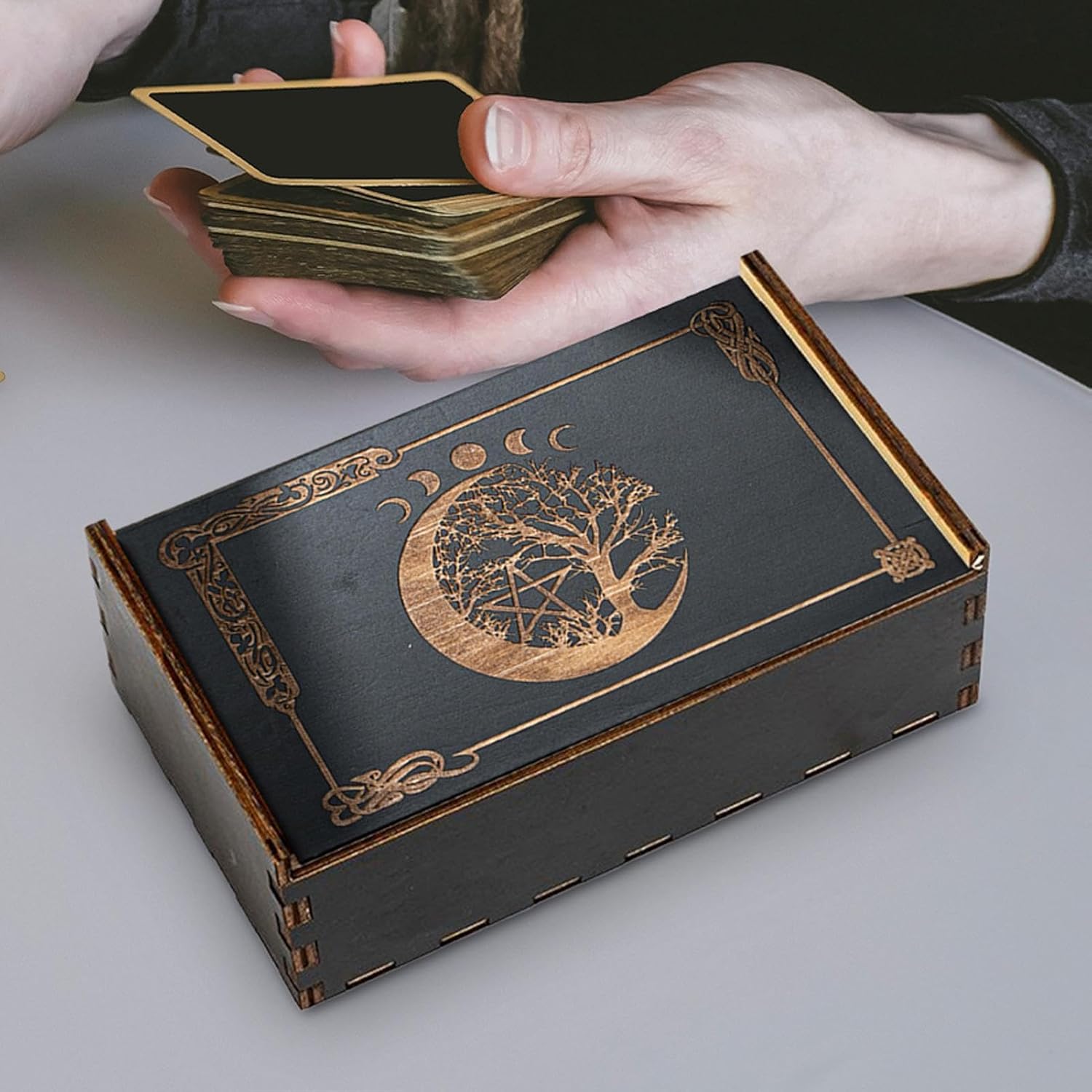 Servizio di lunga durata: realizzato con materiale in legno robusto, garantendo una forte durata che resiste alla rottura o alla deformazione, assicurando che le tue carte dei tarocchi siano spesso protette, ideali per un uso duraturo Molto spazio: progettato con una capacità di archiviazione perfetta per ospitare senza sforzo più tarocchi, assicurando che tutte le tue esigenze di archiviazione siano completamente soddisfatte; aprire e chiudere la scatola è molto facile con la sua funzione di spinta o rimozione facile Altre funzioni: mostra un sofisticato design della scatola di legno di spinta nera, duplicando come una soluzione di archiviazione elegante e una scatola presente unica per le carte dei tarocchi. Fusione ideale di funzionalità ed estetica Delicate decorazioni fatte in casa: solleva l'interno con la nostra custodia per tarocchi dei tarocchi. Aggiungi stile e calore al tuo spazio per una spinta di atmosfera artistica festiva e quotidiana Ampia gamma di applicazioni: solleva il tuo spazio con questo astuccio versatile, perfetto per mostrare oggetti apprezzati e migliorare l'arredamento della stanza, mostrare diversi e praticità