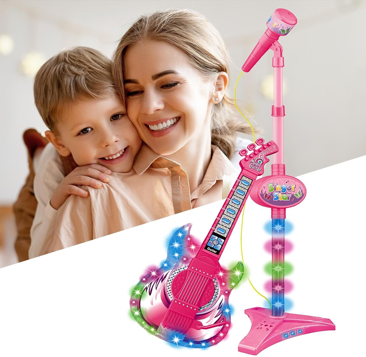Funzioni multiple: con 6 pulsanti musicali e 4 modalità di funzione, puoi goderti diverse canzoni o creare la tua musica, rendendo questa chitarra un hub di intrattenimento multifunzione Potenziale musicale realizzato: con il set di chitarra e microfono del nostro bambino, i bambini possono affinare il loro interesse musicale e nutrire il loro senso musicale in modo divertente e coinvolgente. Questa è un'opportunità unica per lo sviluppo delle abilità e il miglioramento del talento. Divertimento musicale migliorato: con un design versatile del microfono, collegalo facilmente a un lettore MP3 o un telefono cellulare, arricchendo il tempo di riproduzione mentre il microfono cambia in modo intelligente Funzione di illuminazione: Il set per chitarra e microfono dei nostri bambini è dotato di effetti di luce colorati e accattivanti che migliorano la creatività musicale e forniscono uno strumento entusiasmante per i bambini per mostrare il loro talento, aumentando così la loro fiducia nelle prestazioni Meraviglioso regalo: inizia l'amore di tuo figlio per la musica con questo set di chitarra e microfono per bambini. Un regalo perfetto, ideale per bambini dai 3 agli 8 anni per festeggiare ogni occasione