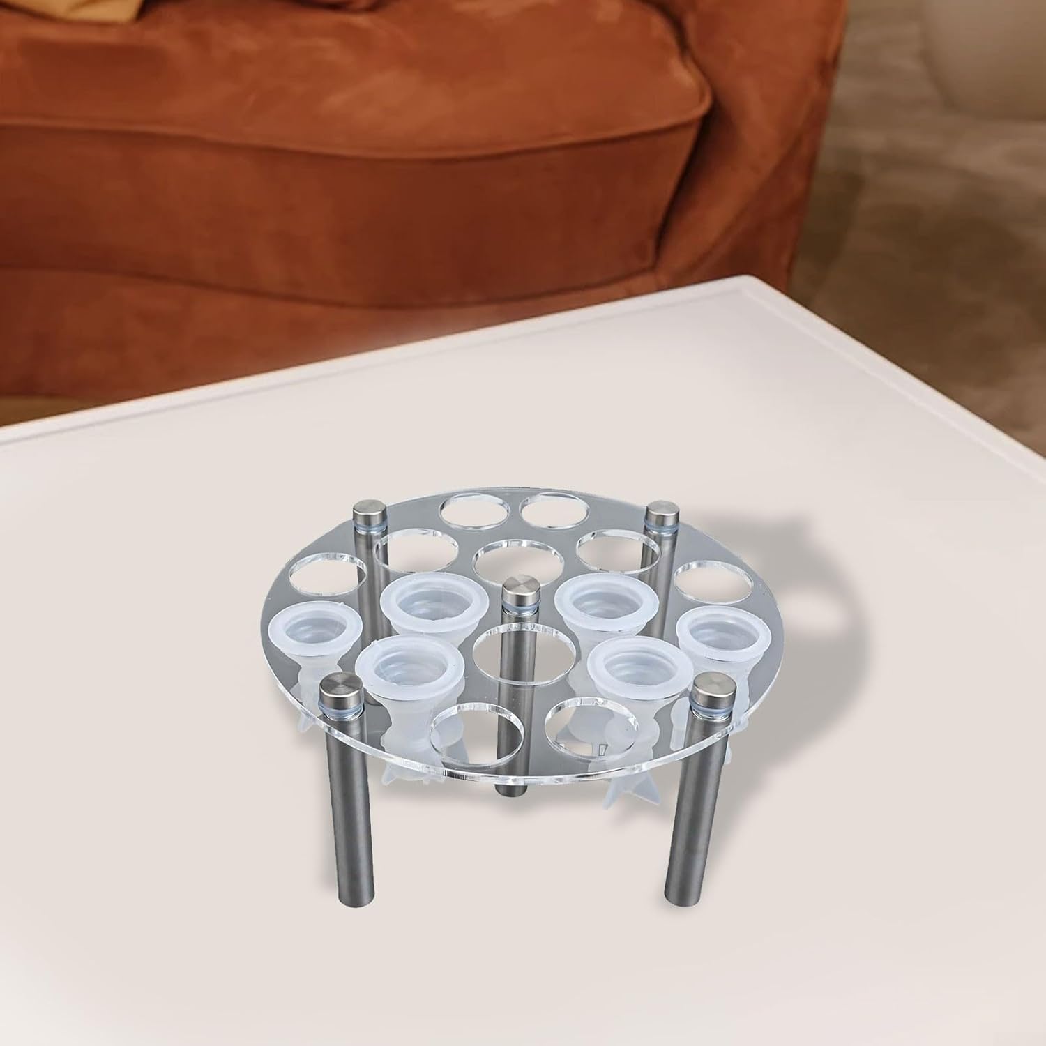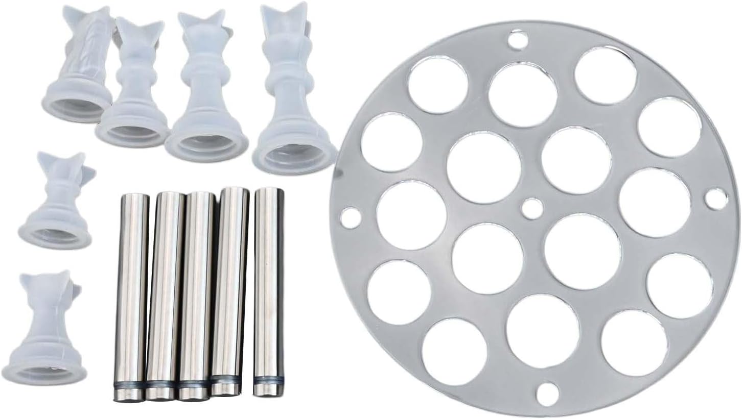 [Robusto materiale acrilico] Realizzato in acrilico, questo supporto per stampi garantisce affidabilità mantenendo i tuoi pezzi degli scacchi al sicuro e . [Spazio singolo pezzo] Con 16 fori dedicati, ogni pezzo degli scacchi può essere conservato separatamente per evitare graffi e danni, rimane in condizioni incontaminate. Supporto con 5 gambe: l'innovativo design a cinque gambe offre un'eccellente stabilità, rendendo facile organizzare i materiali di fusione e gli stampi in modo efficiente. Installazione senza attrezzi: monta senza sforzo il supporto degli stampi senza bisogno di attrezzi, perfetto sia per principianti che per esperti artigiani fai da te.