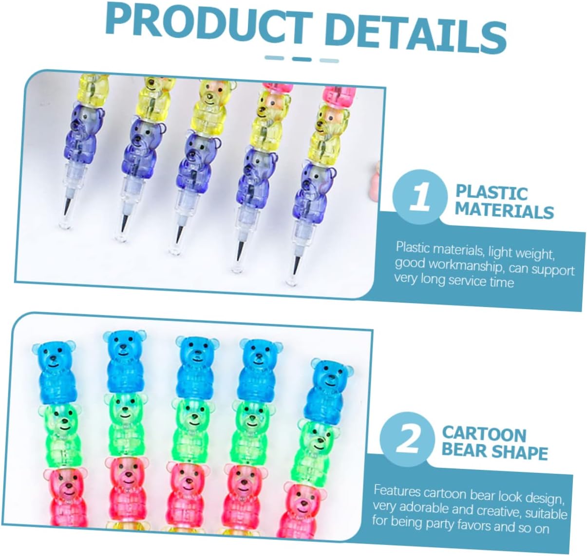 Matita a forma di orsetto per bambini: può essere un bel per i tuoi bambini a cui piace disegnare o scrivere, il che li rende felici, matite impilabili a forma di orsetto Matite a forma di orso per bambini: molteplici usi, come pittura, esami, compiti, schizzi o usi di scrittura in generale, soddisfano le tue esigenze, matite per bomboniere per bambini Matita impilabile per bambini: adorabili elementi dell'aspetto dell'orso dei cartoni animati, molto creativi, possono darti una sensazione di soddisfazione nell'uso, matite impilabili a forma di orso Matite impilabili a forma di orso: puoi smontarle e rimontarle in diverse lunghezze e che ricordano l'infanzia, matite per feste per bambini Matite carine per bambini: queste matite sono pratiche e adatte a insegnanti, artisti, contabili o ingegneri.