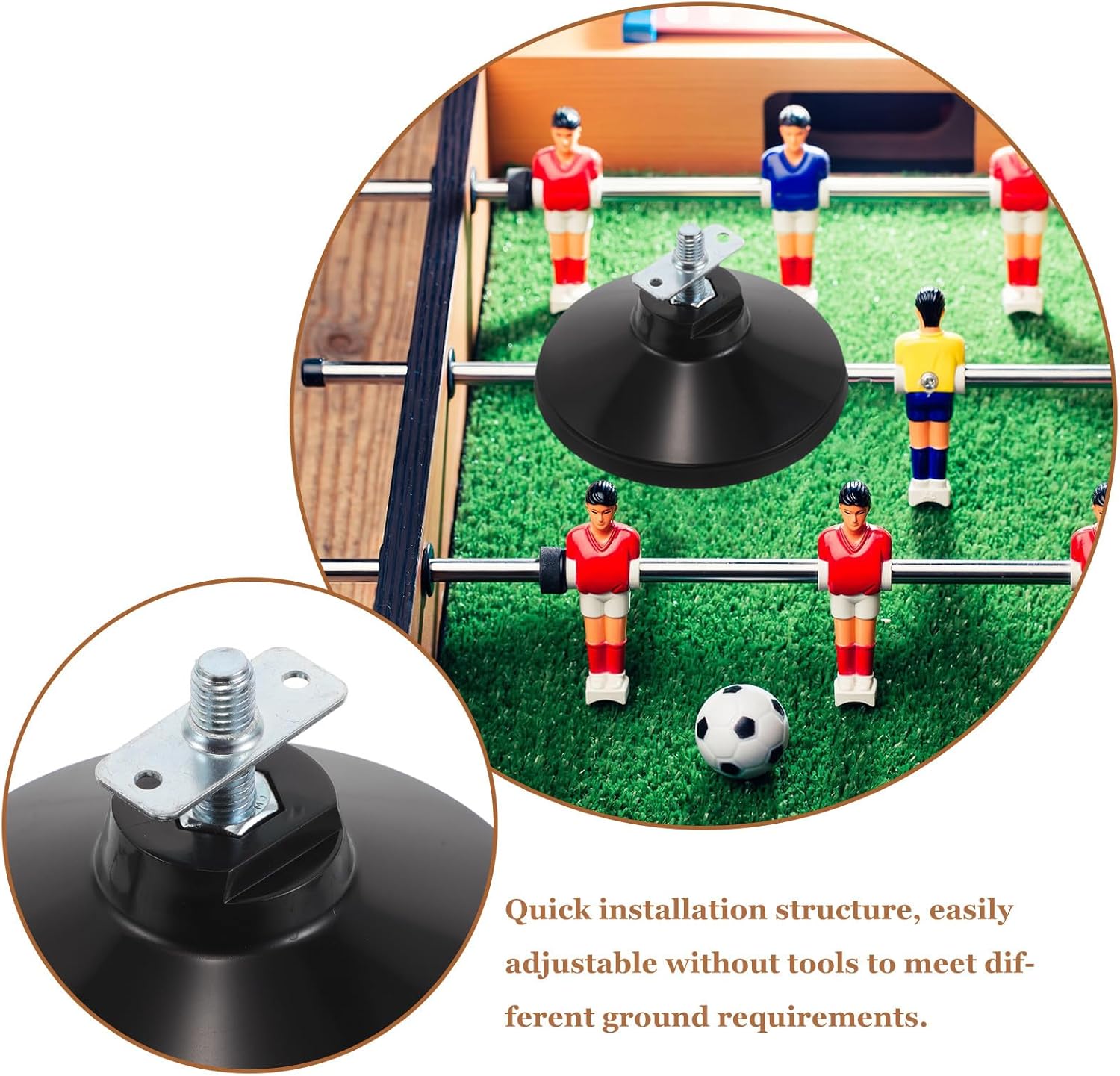 Stabilità migliorata: i rialzi di livellamento del biliardino aumentano la stabilità del tuo biliardino, garantendo una sessione di gioco stabile e divertente Gamma regolabile: si adatta a diverse superfici del pavimento con un'ampia gamma di regolazione, risolvendo qualsiasi problema di livellamento del tavolo Installazione semplice: facile da installare, senza bisogno di strumenti professionali, rendendo le regolazioni dell'altezza fai da te un gioco da ragazzi Utilizzo multi-scena: i rialzi di livellamento del tavolo da calcio balilla sono ideali per vari contesti, dall'intrattenimento domestico ai locali commerciali, adattandosi perfettamente a qualsiasi spazio Con durata: progettato per durare a lungo e resistere all'usura, riducendo al minimo i danni e prolungando la vita del tuo tavolo da gioco