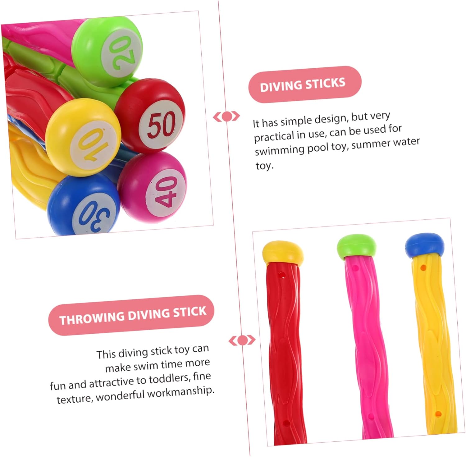 Giocattoli da piscina per bambini: il giocattolo per bambini con da sub può aumentare il divertimento in piscina con i tuoi bambini, giocattoli da sub per piscina per bambini Bastoncini da tuffo per piscina: questo giocattolo da tuffo può essere più divertente e attraente per i più piccoli, con una consistenza fine e una lavorazione meravigliosa, giocattoli per bambini Bastoncini da immersione per piscina per bambini: design compatto e raffinato, comodi e semplici da riporre, pratici da usare per i tuoi bambini, giocattoli da piscina per bambini da immersione: il design colori vivaci può aiutare a stimolare la vista del tuo , incoraggiandolo a toccare ed esplorare, giocattoli per bambini Bastoncini da sub giocattolo per bambini: mentre divertono, i bambini possono anche godersi il divertimento in piscina e migliorare le loro abilità natatorie, giocattoli per piscina