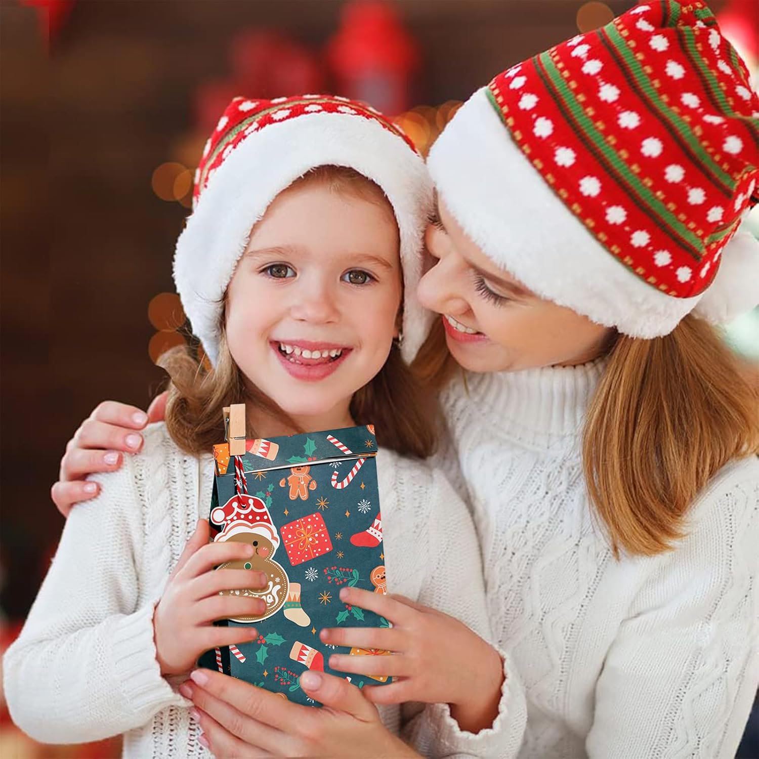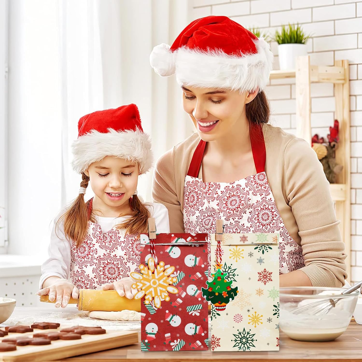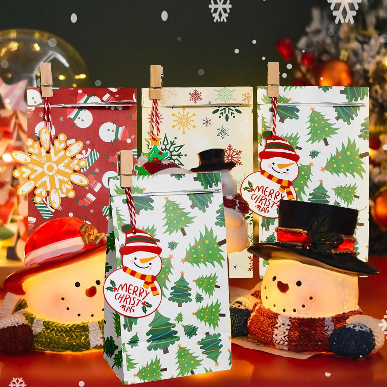 [Set di sacchetti di carta natalizi]: il set è composto da un totale di 24 sacchetti di carta, 24 clip di legno, 24 etichette natalizie, 24 cordoncini e 24 adesivi con cui è possibile chiudere i sacchetti; la quantità è sufficiente per soddisfare tutte le esigenze di confezionamento delle feste di Natale. [Sacchetti regalo natalizi ideali]: questi piccoli e delicati sacchetti regalo natalizi in carta sono adatti per bomboniere e piccoli regali come caramelle, biscotti, cioccolato, snack, premi, artigianato, ecc., ideali per artigianato o decorazioni natalizie. [Sacchetti regalo di Natale di alta qualità]: i sacchetti regalo di Natale in carta Kraft sono realizzati in materiale cartaceo di alta qualità, ben realizzati e durevoli; la base piatta e solida lo rende facile da posizionare; colori vivaci, design unico e bellissimo, creano una felice atmosfera natalizia per te. [Design natalizio]: le nostre borse natalizie sono stampate su entrambi i lati con vivaci motivi natalizi, come omini di pan di zenzero, alberi di Natale, fiocchi di neve, pupazzi di neve, bastoncini, scatole regalo e così via. Questo esclusivo set regalo di Natale creerà un'atmosfera allegra per la tua festa di Natale. [Ampia applicazione]: la dimensione del sacchetto di carta è di ca. 4,72 x 3,15 x 8,27 pollici / 12 x 8 x 21 cm. Le nostre borse natalizie sono adatte per regali di Natale, biscotti, dolci, cioccolatini, ecc. Queste graziose borse sono adatte per feste di Natale, decorazioni natalizie, feste di Capodanno e così via.