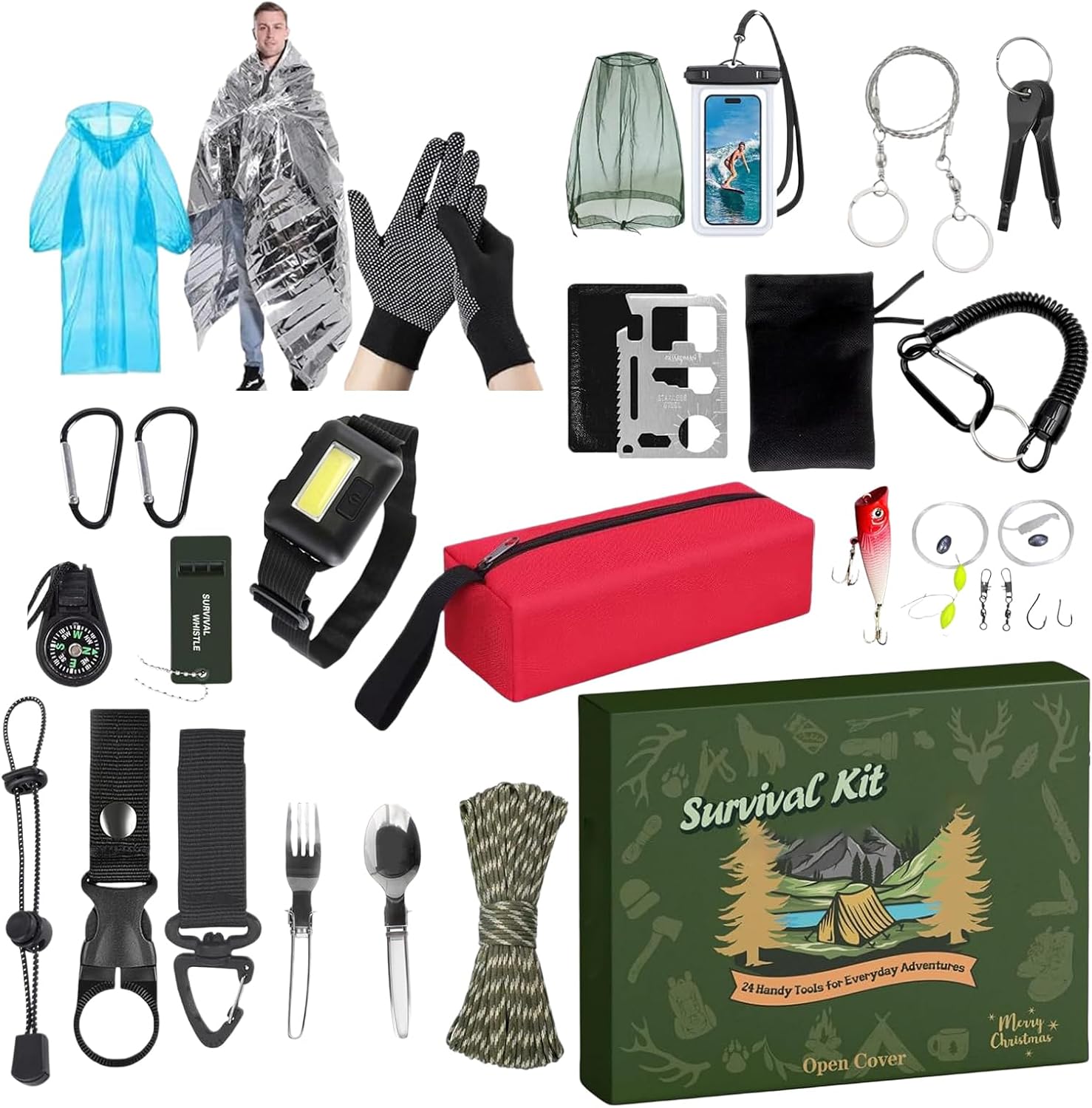 Strumenti versatili: questo kit garantisce la prontezza per le avventure all'aria aperta e affronta le esigenze di varie emergenze con strumenti funzionali per gli avventurieri che cercano affidabilità Compagno di viaggio: un ottimo regalo per le vacanze, adatto per uomini e appassionati di outdoor che apprezzano l'affidabile Survival Kit Countdown Calendario per i loro viaggi. Comodo da trasportare: il design portatile e il peso ridotto consentono di riporlo facilmente nello zaino. Questo fornisce un supporto affidabile in campeggio o in situazioni impreviste. Uso comune: adatto per backpacking, escursionismo, campeggio, pesca e caccia. Fornisce strumenti indispensabili per avventure selvatiche e all'aria aperta e migliora la preparazione in diverse situazioni. Calendario con conto alla rovescia festivo: goditi il magico periodo prenatalizio con questo kit creativo di sopravvivenza e aumenta l'anticipazione della festa attraverso nuove sorprese e momenti indimenticabili ogni giorno