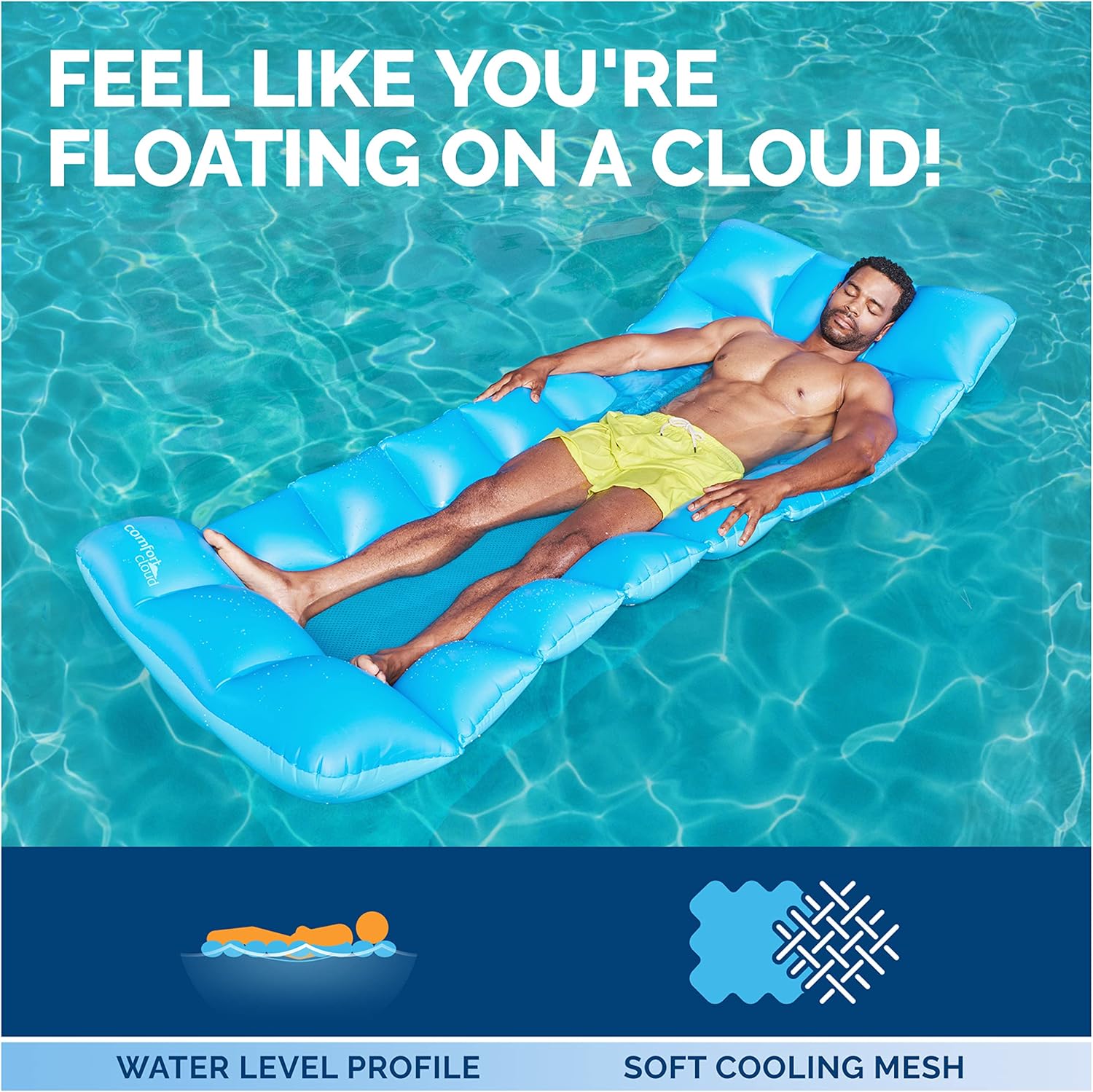 Comfort simile a una nuvola: galleggia comodamente con il morbido PVC strutturato, mantenendoti appena sotto la superficie dell'acqua per rimanere fresco e galleggiare nel massimo relax a bordo piscina Design oversize: questo galleggiante gigante per piscina è dotato di un cuscino di supporto simile a una nuvola, con un poggiapiedi e un poggiatesta sovradimensionati, che ti cullano per offrire un'esperienza galleggiante simile a una nuvola Letto a rete rinfrescante: l'esclusivo letto a rete di questo galleggiante per piscina all'aperto si adatta alla forma del corpo di ogni persona, espandendosi e contraendosi per adattarsi alla galleggiabilità dell'acqua, permettendoti di galleggia per ore in tutta comodità nelle calde giornate estive Costruito per supportare: progettato pensando al completo relax, misura 74 "x 34" e supporta fino a 250 libbre. Gonfia e sgonfia 3 volte più velocemente: l'esclusiva valvola Hyper-Flate in attesa di brevetto elimina lo stress dall'installazione e dalla conservazione della sedia da piscina galleggiante più velocemente che mai, senza bisogno di pompa, quindi c'è più tempo per rilassarsi e divertirsi Include 1 lettino Comfort Cloud coperto dall'impegno Spin Master Care. Vedi sotto per maggiori dettagli