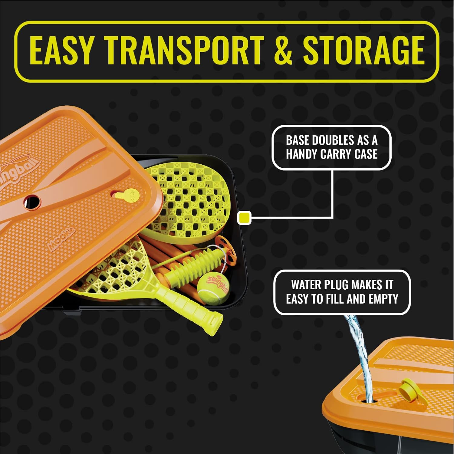 Entra in azione con il set Tournament All Surface Swingball, completo di asta regolabile in altezza, palla da tennis in gomma e 2 pipistrelli. Swingball è il gioco perfetto per tutte le fasce d'età per diventare competitivi. Colpisci la palla di schiuma per inviarla girando intorno al palo. Sarai il primo a raggiungere la fine della spirale? Riempi la base su tutta la superficie con acqua o sabbia per impostare il tuo gioco. I piedini di bilanciamento mantengono la base stabile su qualsiasi superficie, mentre un tappo d'acqua aiuta a evitare fuoriuscite. Una volta svuotata la base, può essere utilizzata come pratica custodia per portare il tuo gioco Swingball in viaggio. Contenuto della confezione: asta oscillante, palla da tennis in gomma e 2 pipistrelli