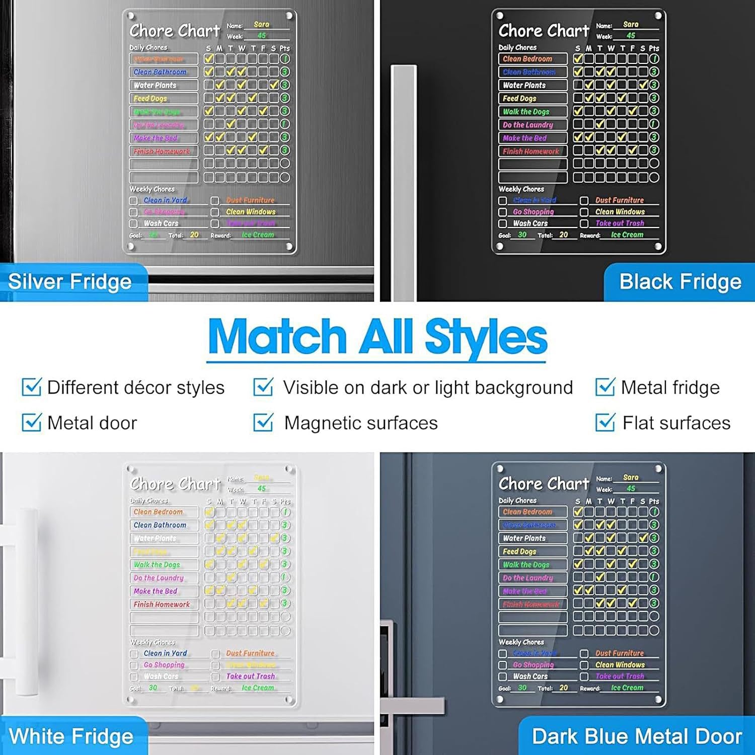Compatibilità Dimensionale: Dimensionato per porte frigorifero standard, combina adsorbimento magnetico con soluzioni antiscivolo all'avanguardia, mantenendo posizione fissa e sicura in condizioni d'uso normale Protezione Graffi: Resiste agli graffi senza sforzo mantenendo un aspetto impeccabile, salvaguarda il rivestimento frigorifero senza lasciare segni o nel Tracciamento Dinamico: Design coinvolgente promuove l'impegno dei bambini, utilizzando codici colore vivaci su una lavagna compiti chiara per una pianificazione delle attività quotidiane. Manutenzione Semplice: La superficie opaca si pulisce senza sforzo con panno, affiancata da 8 pennarelli vivaci per scrittura uniforme, mantenendo la tabella organizzativa chiara e pronta all'uso quotidiano Presente :: Questo organizzatore acrilico per faccende domestiche offre packaging festivo pronto per regalo e uso domestico, migliorando l'organizzazione diffondendo gioia in eventi speciali come compleanni o Natale.