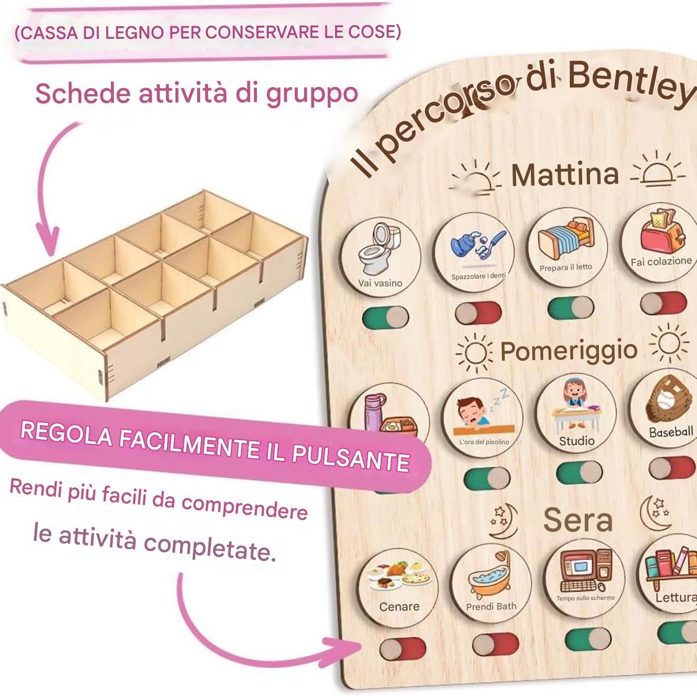 Regalo Educativo Speciale: Giocattolo didattico per la prima infanzia che sostiene l'apprendimento precoce, ideale come regalo compleanno o Natale. allo sviluppo prescolare che crea ricordi preziosi attraverso il gioco attivo stimolando la crescita naturale del bambino. Visivo per Routine: Offre un metodo organizzato con telaio circolare, carte riutilizzabili, contenitore in legno e borsa in tela per gestire in autonomia le attività a giornata. Adattabilità ottimale: Progettato con altezza -friendly, si adatta perfettamente a parete o su superficie piana. Soluzione organizzativa flessibile per ambienti domestici, scolastici e camerette con integrazione immediata Design Interattivo Bambini: Combina una lavagna in legno con apprendimento visivo a routine sostenendo lo sviluppo a struttura giornaliera per attività mattutine pomeridiane e serali coinvolgendo efficacemente i bambini grazie al design interattivo a misura di bambino Sviluppo Integrale: Rafforza lo sviluppo del pensiero logico e 'immaginazione nei bambini, supportando contemporaneamente l'acquisizione linguistica, il miglioramento e capacità visive e lo sviluppo motorio attraverso metodi interattivi e creativi.