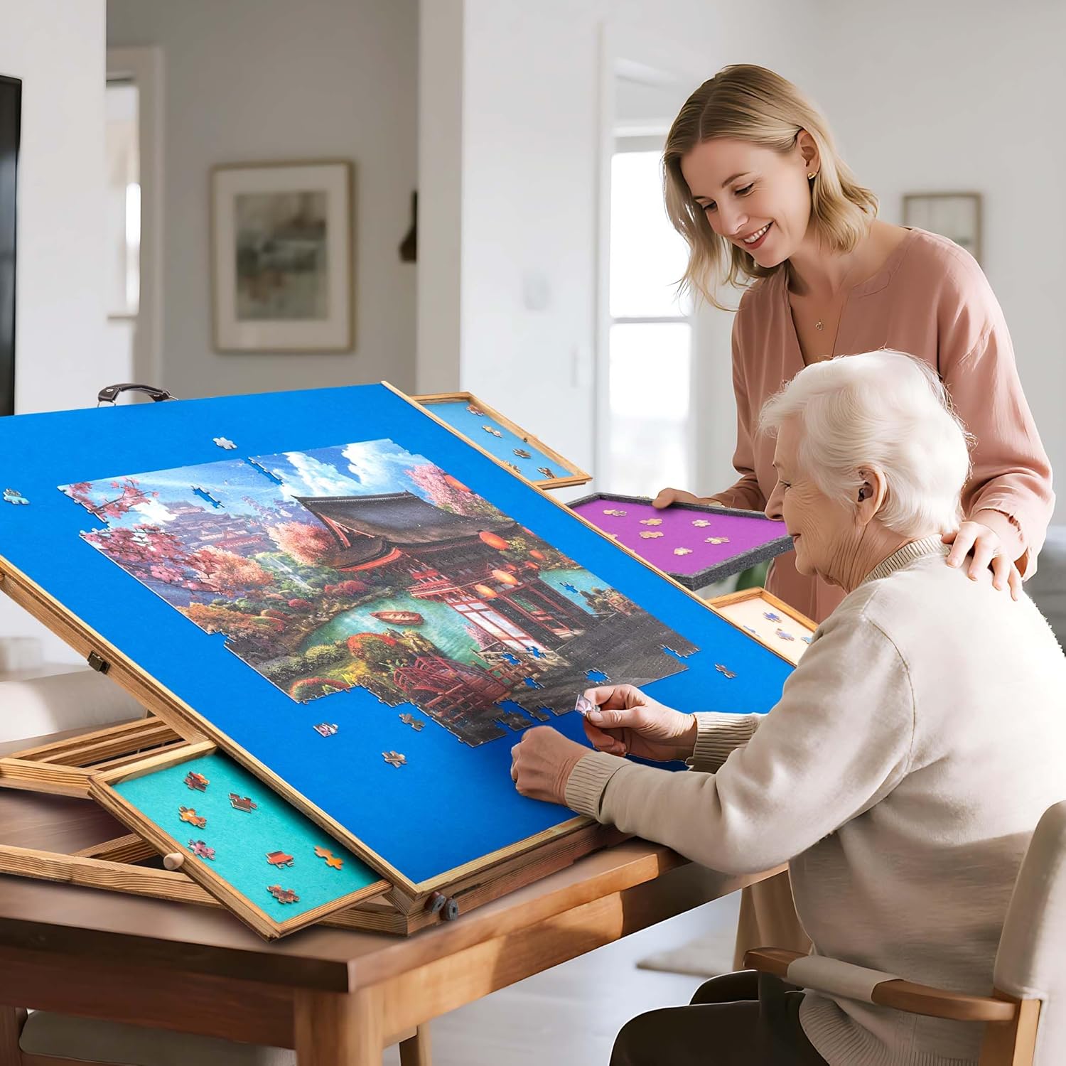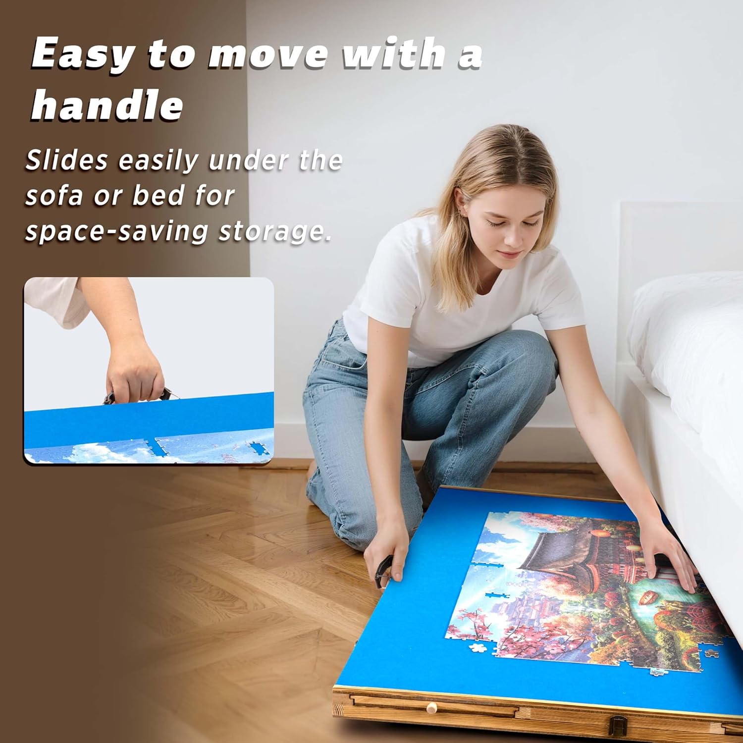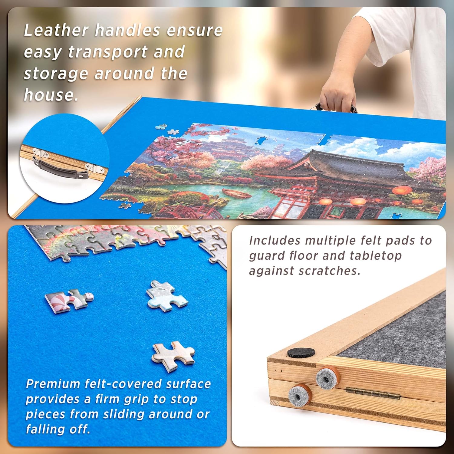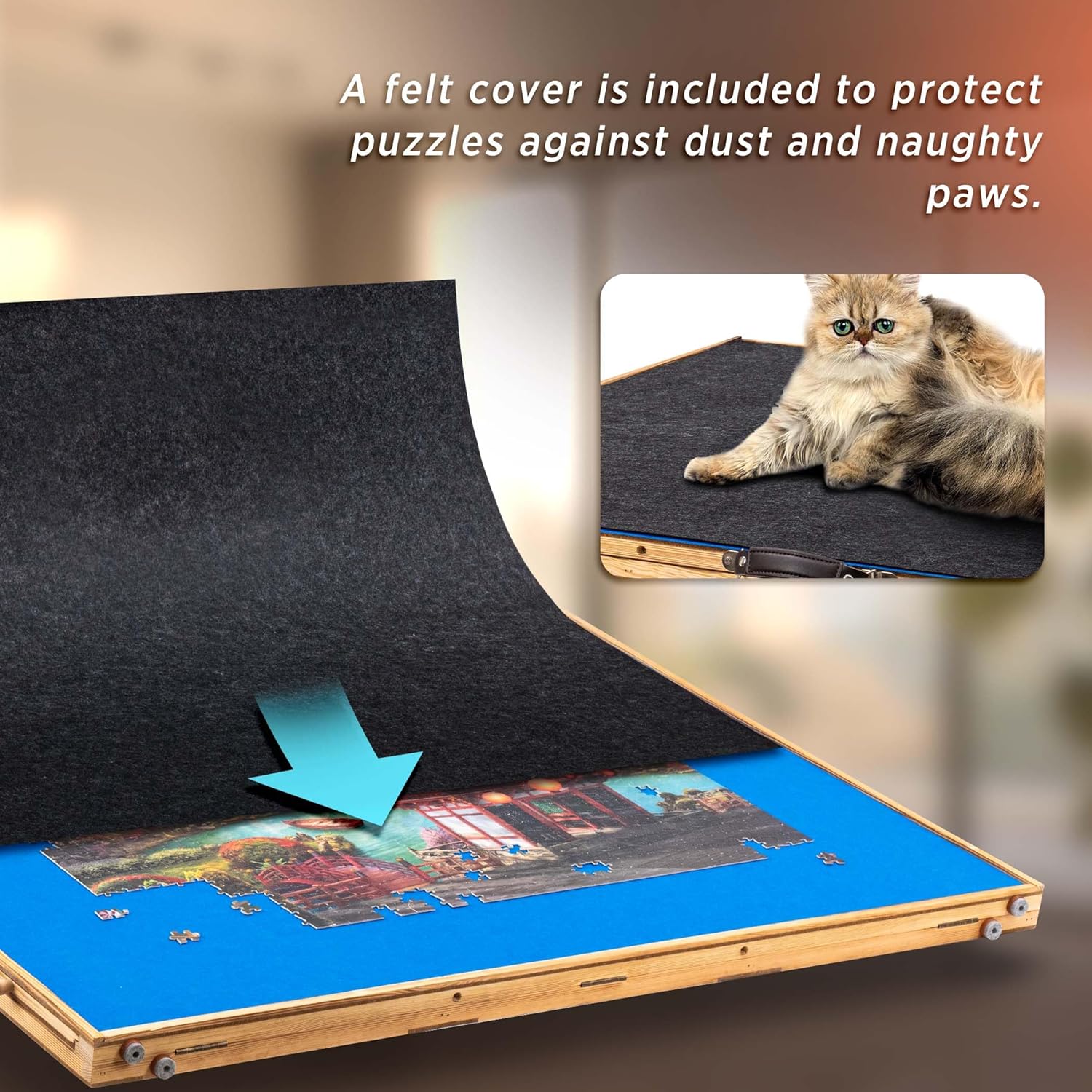 4 regolazioni di inclinazione: la tavola del puzzle ha quattro angoli di inclinazione regolabili (31°, 26°, 21°, 17°). Basta sollevare il pannello per regolare l'angolo di lavoro desiderato per un comfort ottimale. Questo design ergonomico aiuta a prevenire tensioni al collo e mal di schiena, così puoi goderti appieno i puzzle. 4 cassetti in legno di pino e 5 vassoi in feltro: due cassetti rimovibili in legno di pino su ciascun lato (con maniglie intercambiabili) forniscono accesso immediato allo spazio di archiviazione. Cinque vassoi rivestiti in feltro sotto il piano consentono una facile organizzazione grazie alla codifica a colori dei pezzi. Semplifica l'assemblaggio del puzzle e memorizza in modo efficiente i pezzi non finiti. Copertura protettiva in feltro: la copertura in feltro protegge i puzzle non finiti dalla polvere e dagli animali domestici curiosi. Metti semplicemente in pausa il gioco e riponi la tavola coperta sotto divani o letti finché non sei pronto per continuare. La superficie lavabile garantisce una facile manutenzione. Maniglia e poggiapiedi in pelle: la maniglia in metallo rivestita in pelle montata sulla parte superiore consente una facile movimentazione e stoccaggio da una stanza all'altra. Diversi feltrini nella parte inferiore proteggono i pavimenti e le superfici del tavolo dai graffi durante l'uso/lo stoccaggio. Realizzato appositamente per gli amanti dei giochi puzzle: realizzato in legno di pino resistente ed ecologico con una superficie in feltro antiscivolo che impedisce ai pezzi di scivolare. Può ospitare la maggior parte dei puzzle da 2000 pezzi con una superficie di lavoro di 103 × 76 cm.