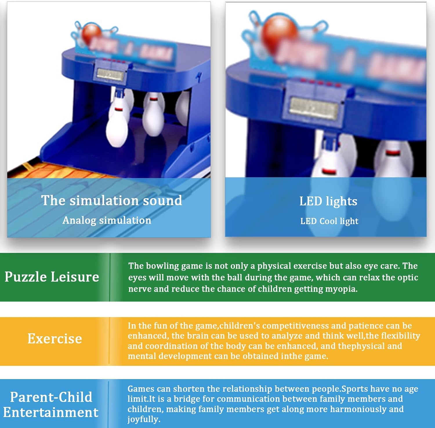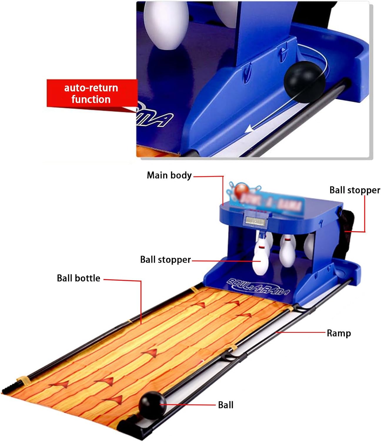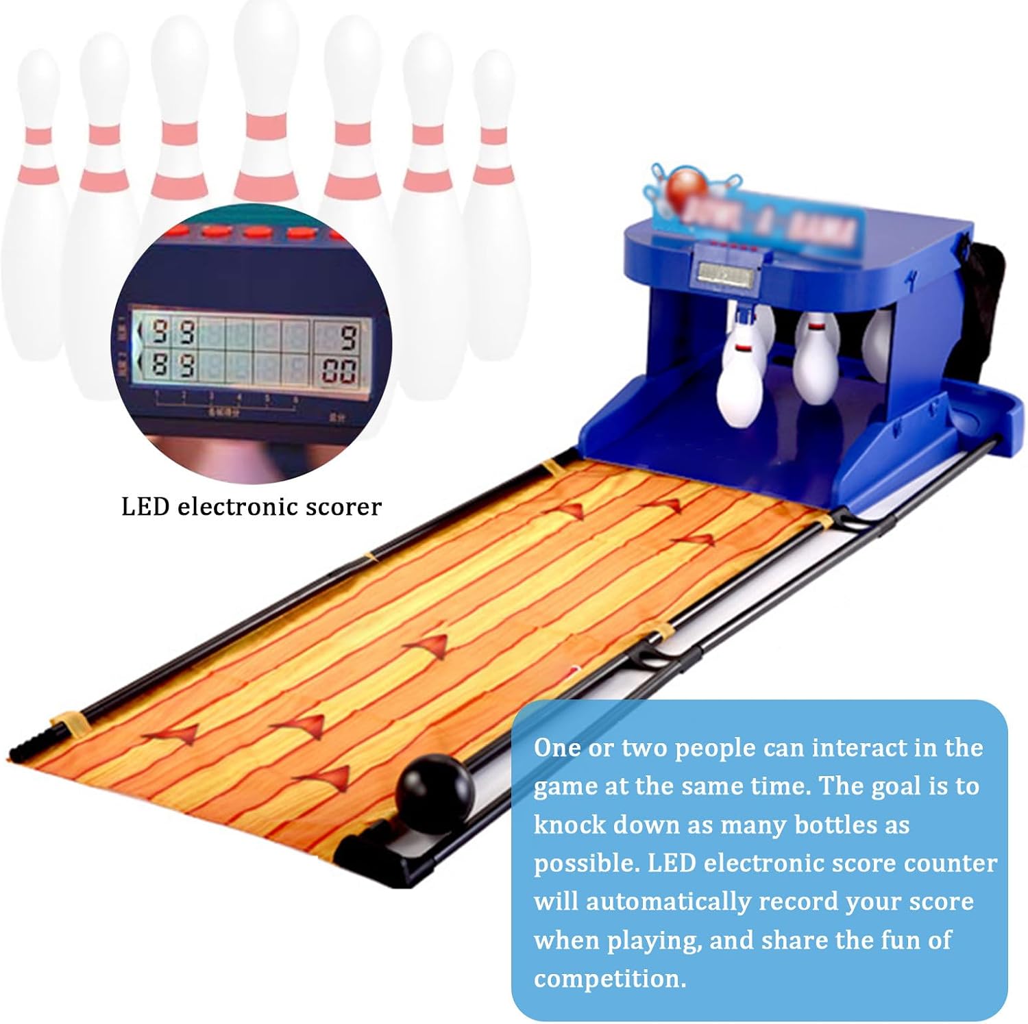 【DISPOSITIVO DI PUNTEGGIO ELETTRONICO A LED】Il set da bowling supporta una o due persone che possono interagire contemporaneamente. L'obiettivo è abbattere il maggior numero possibile di birilli. Durante il gioco, il segnapunti elettronico a LED registrerà automaticamente il punteggio e condividerà il divertimento della competizione. 【SET DA BOWLING DI ALTA QUALITÀ】Macchina da bowling elettrica con 6 birilli pieni in plastica e 2 palle da bowling. Birilli e palle da bowling sono realizzati in plastica di alta qualità, atossica e sicura per i bambini. 【ARCO DI RITORNO AUTOMATICO DELLA PALLA】Gioco da bowling elettronico. La bottiglia si ripristinerà automaticamente quando colpisce la bottiglia dopo averla lanciata in mano ed emetterà un suono simulato di reset per rendere il gioco più realistico e pratico. 【FACILE DA INSTALLARE】Set da bowling elettrico portatile per uso domestico, che semplifica e velocizza l'installazione del gioco, simula bene il peso relativo della palla ed è sufficientemente scorrevole da poter essere ripiegato quando non in uso, senza lasciare angoli o spazi vuoti. 【INTRATTENIMENTO GENITORI-BAMBINI】Il bowling è divertente, interessante, competitivo e stimola l'abilità. Il gioco può accorciare le distanze tra le persone. È un ponte di comunicazione tra famiglie e bambini, rendendo le famiglie più armoniose e felici.