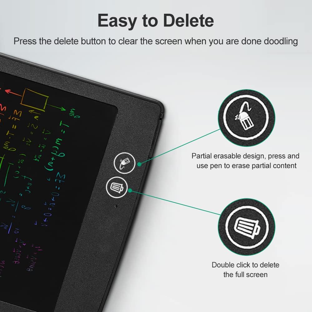 Premi il pulsante Elimina per cancellare lo schermo quando hai finito di scarabocchiare, mentre il blocco sul retro può cancellare accidentalmente il tuo lavoro. Lo schermo LCD della lavagna senza radiazioni e nessun abbagliamento, comodo da usare anche per un lungo periodo. Design parzialmente cancellabile, può cancellare pagine parziali, comodo e veloce. Dotato di slot per penna, non facile da perdere, facile da usare e riporre. Scrivere e disegnare su questo tablet è come scrivere e disegnare su carta, crea linee di diverso spessore in base alla forza che spingi.