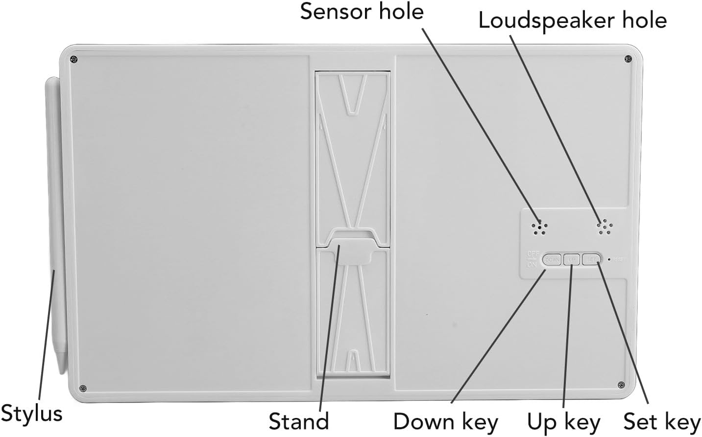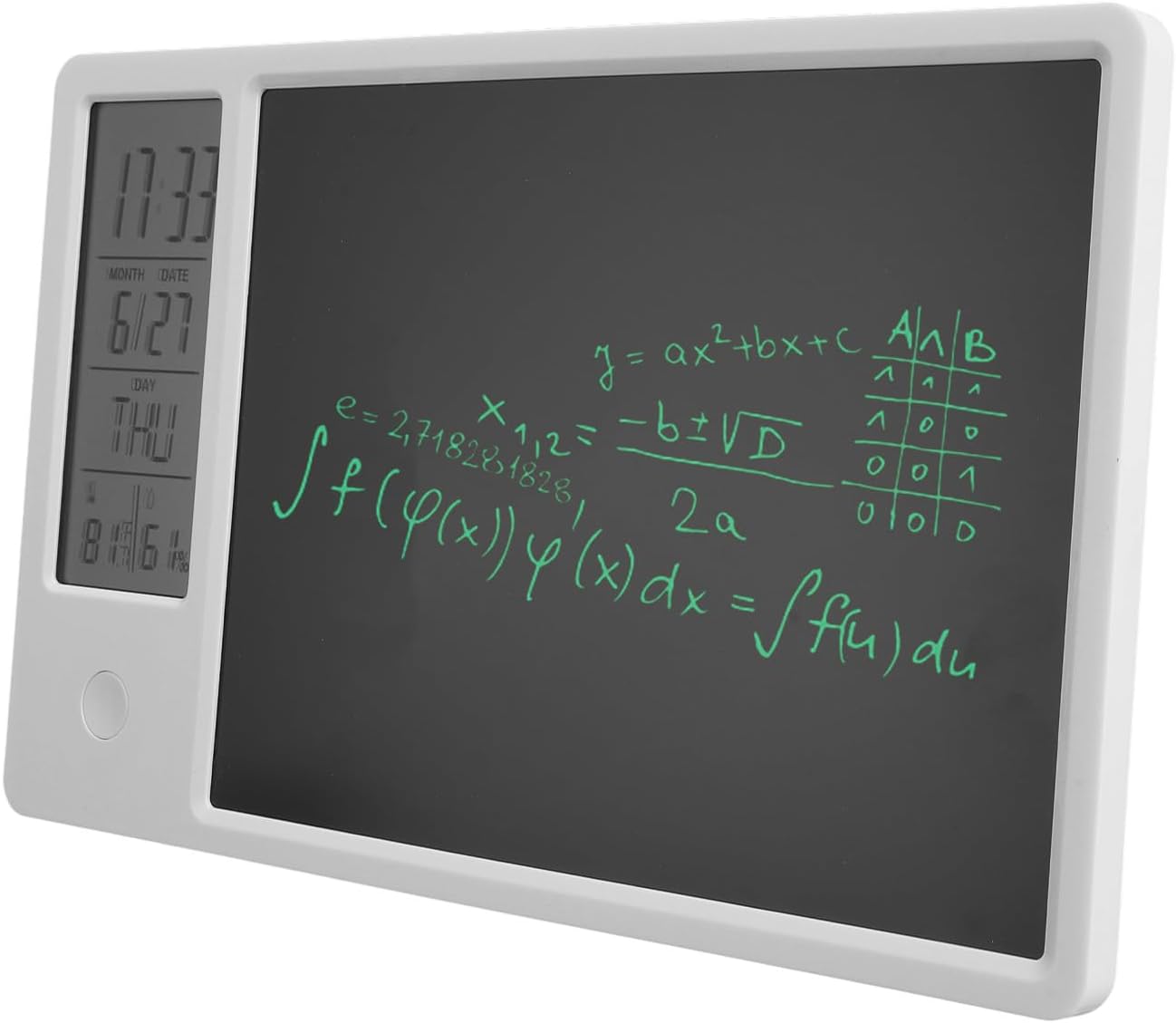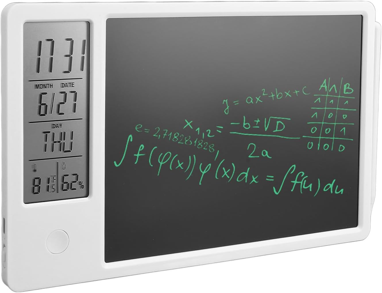 DESIGN CANCELLABILE E STILO: blocco note elettronico da 10 pollici con funzione di cancellazione di un tasto. Lo stilo è magnetico e può essere posizionato sulla parte superiore o laterale del blocco note per un facile accesso. PORTATILE E RICARICABILE: questa tavoletta grafica LCD entra facilmente in una valigetta, borsa o zaino, così puoi portarla con te ovunque tu vada. Design ricaricabile, non è necessario sostituire le batterie, può essere caricato con cavo di ricarica di tipo C, una carica può fornire 3-6 mesi di utilizzo. OROLOGIO DIGITALE CON TEMPERATURA E UMIDITÀ: Visualizza ora, data, giorno della settimana, temperatura e umidità sullo schermo LCD sinistro. commutabile 12/24 ore secondo necessità. Fahrenheit e Celsius sono liberamente convertibili. Facile da usare per tutte le età. TAPPETINO PER SCRITTURA: una combinazione di calendario da tavolo con funzioni standard e blocco per appunti, non può salvare efficacemente carta e penna, ma può anche calcolare e registrare ciò che desideri. Dotato di supporto pieghevole, può essere posizionato stabilmente sulla scrivania, sul banco da lavoro, sul comodino. AMPIO UTILIZZO: puoi scrivere il tuo itinerario sulla lavagna elettronica e impostare allarmi per risolvere il fastidio che tendi a dimenticare. per l'ufficio e l'uso domestico. Può essere utilizzato come promemoria sveglia, orologio intelligente, lavagna per appunti, lavagna, ecc.