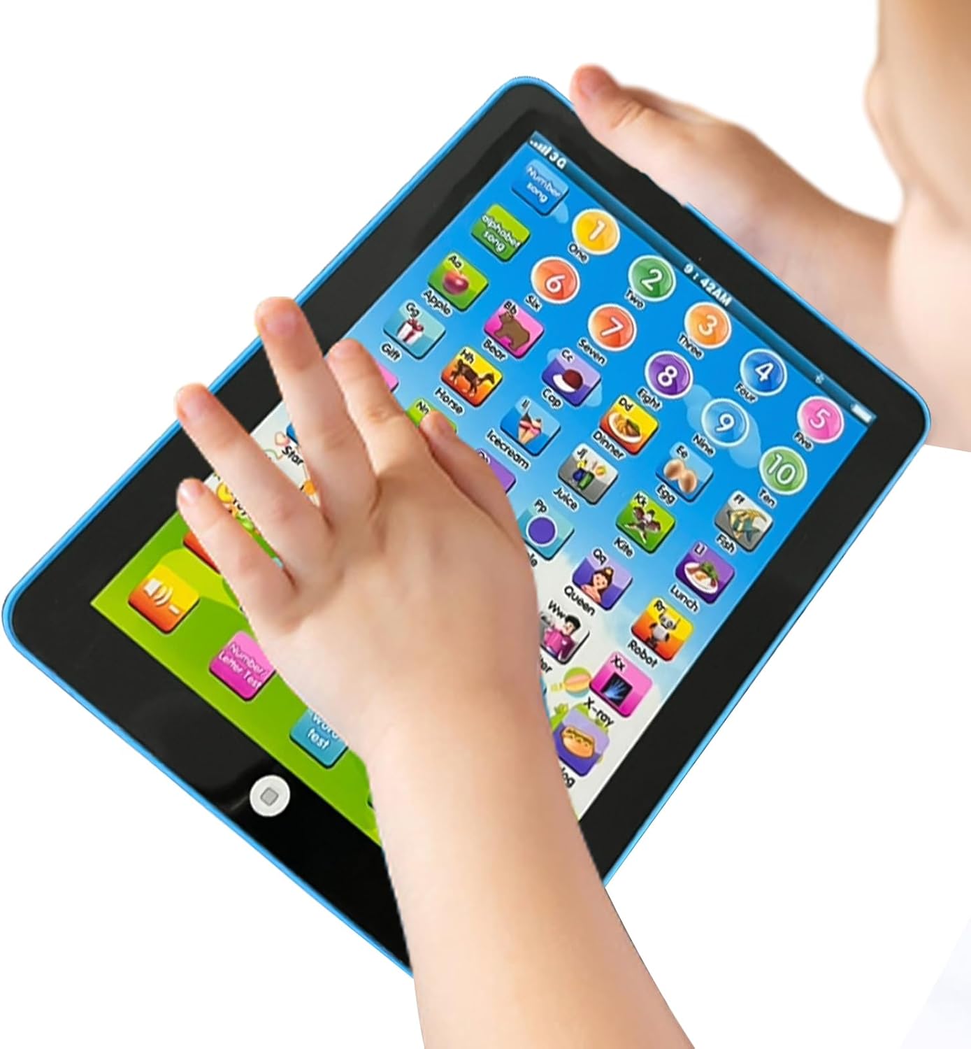 Modalità multiple: questo bambino per bambini è progettato per consentire ai bambini di imparare l'alfabeto in modo interessante, poiché può riprodurre canzoni, musica e parole incantesimi. Ha più modalità per adattarsi a diversi livelli e preferenze di apprendimento e una funzione di regolazione del volume per controllare il suono. Richiede 3 batterie AAA che non sono incluse per funzionare. Esperienza di apprendimento interattivo: con questo tablet per bambini per bambini, promuovi l'apprendimento precoce del tuo bambino attraverso un'esperienza interattiva. L'apprendimento giocoso con pronunce chiare e immagini accattivanti è garantito per aumentare l'interesse e l'energia del bambino. Tablet di apprendimento musicale: migliora l'apprendimento del tuo bambino con questo tablet musicale progettato per i bambini piccoli. Con le sue interessanti melodie e il suo stile di apprendimento attivo, incoraggia il pensiero unico e pone domande per sfidare le conoscenze e il set di abilità di tuo figlio. Facilità di trasporto: incoraggia la curiosità e la creatività del tuo bambino con i nostri bambini sul tablet. È un dispositivo educativo portatile che fornisce una varietà di giochi e applicazioni progettate per ammorbidire gli occhi dei bambini mentre si pongono le basi per l'educazione all'asilo. Buono per dare regali: aumentare l'apprendimento e il tempo di gioco del tuo bambino con questo tablet per bambini. Un perfetto regalo di Natale o di compleanno, è adatto per bambini di oltre 3 anni e viene fornito con app e giochi preinstallati che si rivolgono a ragazzi e ragazze.