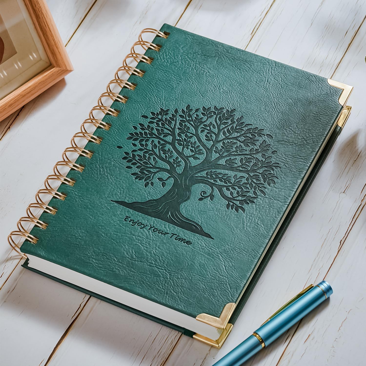Taccuino A5, 300 pagine/150 fogli, copertina rigida, copertina in pelle goffrata albero, diario a righe con doppia spirale per uomini e donne, carta a righe da 100 g/m², senza sbavature, verde, 14,7 x 21 cm