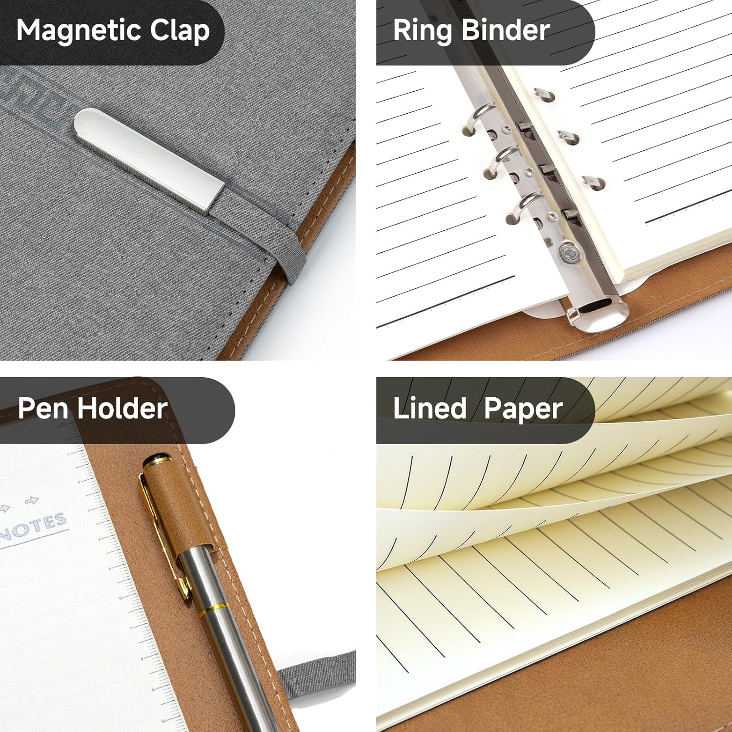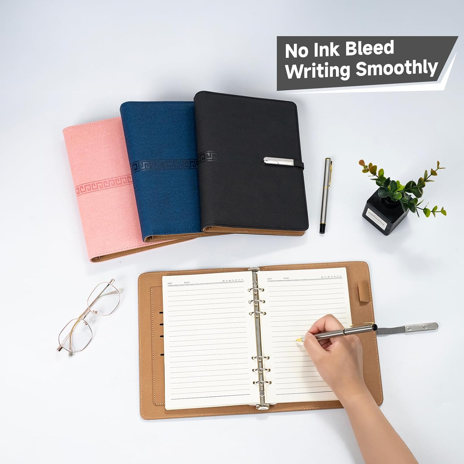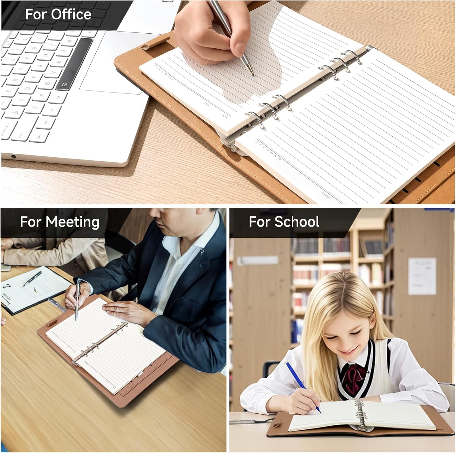 Finta pelle e portapenne: il taccuino con copertina rigida è realizzato con copertina in finta pelle di alta qualità, l'interno è dotato di 4 scomparti per carte e una tasca, chiusura magnetica in metallo, portapenne ad anello Taccuino a 6 anelli: il design funzionale del raccoglitore ad anelli può essere rimosso e riempito con carta in formato A5; Il vassoio a 180° facilita la scrittura, la lettura e la presa di appunti. Blocco note A5 a righe spesse: il diario ha 200 pagine/100 fogli con carta avorio premium, a righe e priva di acidi, senza perdita di inchiostro. Dimensioni rivestimento in pelle: 22,8 cm*17 cm*3,4 cm; dimensioni della carta: 21 cm*14,2 cm Scelta regalo: il taccuino e la penna sono confezionati in una scatola, rendendolo un regalo ideale per compleanno, vacanze, Natale, pensione o rientro a scuola per te, la famiglia, gli amici, i compagni di classe, ecc. Uso pratico: il taccuino a righe è perfetto per dirigenti aziendali, agenti d'affari, studenti, ma può anche essere utilizzato come diario personale, taccuino da viaggio, verbali di riunioni o per prendere appunti quotidiani