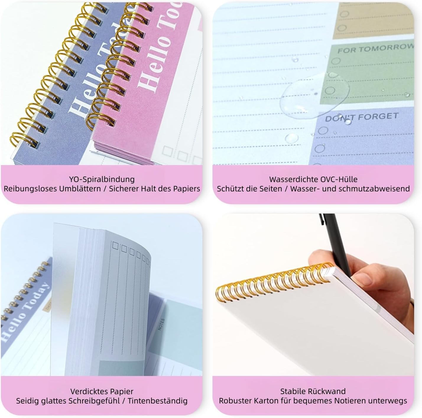 🎨 Quattro opzioni di colore chic: rosa dolce, fresco azzurro cielo, misterioso viola blu e verde profondo e duraturo. Le copertine ispirate ai macarons si adattano a diverse personalità e soddisfano le esigenze di visual design e di abbinamento con diversi scenari. 📏 Formato A5 portatile: dimensioni moderate 148×210 mm, peso solo 233 g. Leggero e facile da trasportare, transizione senza soluzione di continuità tra pendolarismo, studio e vita in ufficio. 📝 Interior design professionale: 104 pagine con sezioni per date, liste di cose da fare e note. La carta a doppio rivestimento da 100 g/m² garantisce una scrittura confortevole e dispone di un pannello posteriore rinforzato per impedire la fuoriuscita dell'inchiostro. 🔗 Resistente rilegatura Wire-O: doppio filo metallico serie YO, testato per 2000 operazioni di apertura/chiusura. Si piega fino a 180° senza staccarsi, garantendo una rotazione fluida e una lunga durata senza che le pagine cadano. 🎁 Garanzia di qualità: confezionato singolarmente con copertura in PVC opaco + supporto in cartone rinforzato. La consegna diretta dal produttore garantisce durata e un buon rapporto qualità-prezzo.