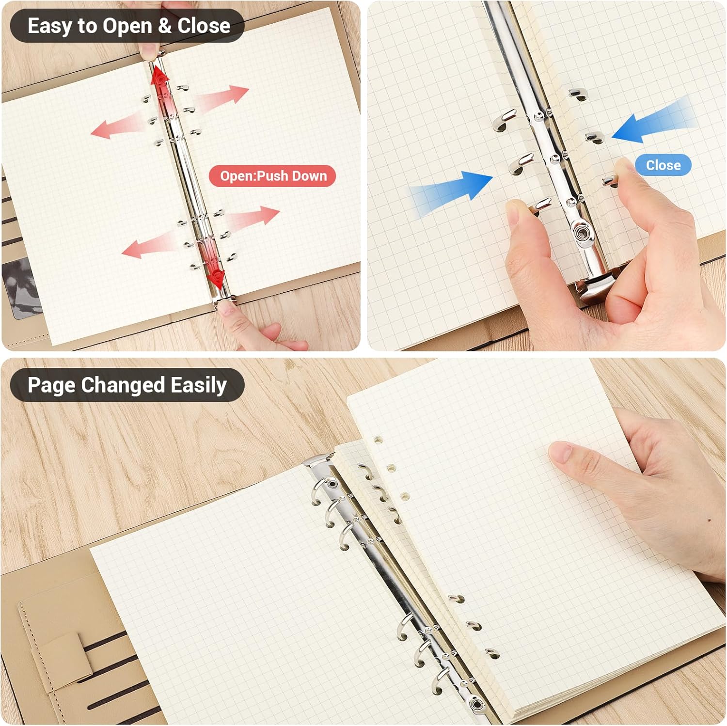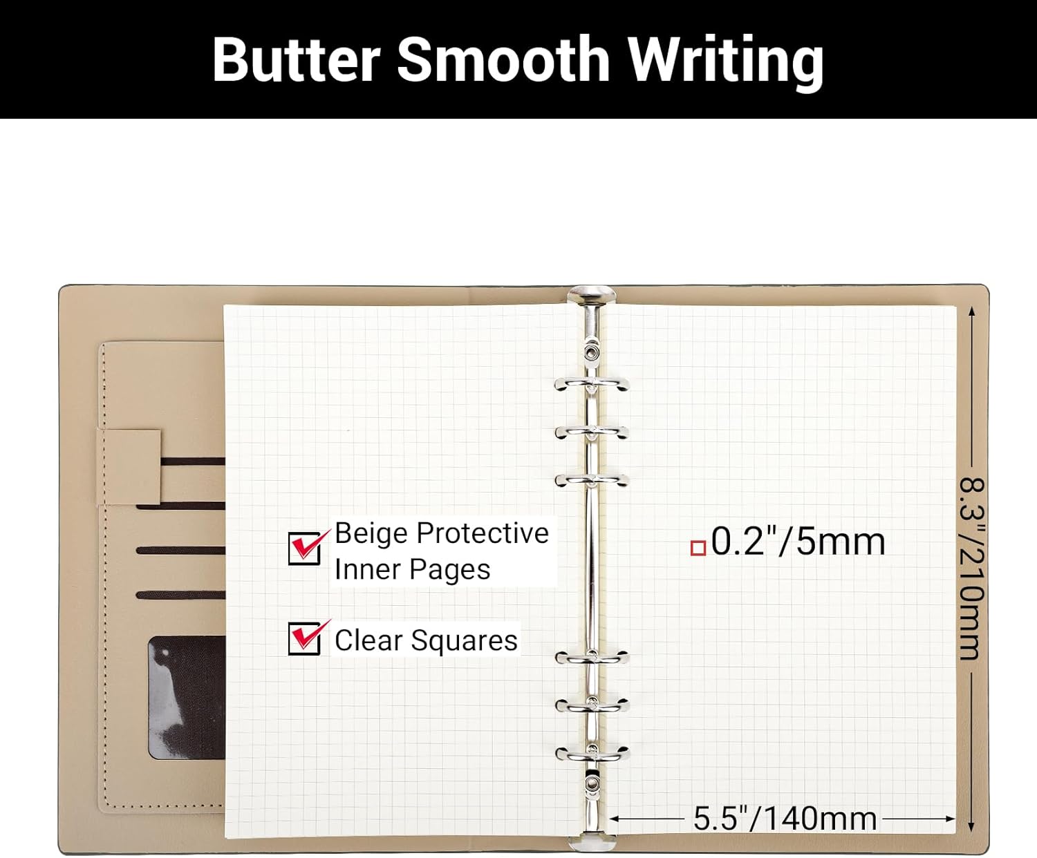 Quaderno ad anelli A5 --- Questo quaderno a spirale nero con copertina A5 (17,8x23,3 cm), carta (14x21 cm) è composto da un set di copertine ad anelli in morbida pelle, fogli sciolti ricaricabili, una tasca per carte, una tasca portaoggetti e un portapenne. Include 300 pagine/150 fogli di carta spessa da 100 g/m² con griglia da 5 mm. Notebook in pelle PU --- Questo notebook a spirale A5 a 6 fori è realizzato in materiale di alta qualità e protegge i tuoi oggetti da acqua e polvere. Si tratta di un quaderno in morbida pelle, resistente agli strappi e riutilizzabile, morbido al tatto e durevole. Carta a quadretti spessa 100 GSM --- Questo taccuino a quadretti da 5 mm è realizzato in carta bianca cremosa spessa 100 GSM che impedisce alle penne di sanguinare o scomparire ed è adatto per matite, penne, matite colorate e pastelli a olio. Ricaricabile e riutilizzabile --- Questo diario per notebook ricaricabile A5 a 6 anelli ti consente di sostituire o aggiungere facilmente nuove pagine per prendere facilmente appunti, rendendolo durevole e praticabile per un uso continuato. Ampio utilizzo --- Che tu stia prendendo appunti, disegnando o creando un elenco di cose da fare, il nostro quaderno di diario è perfetto per le tue esigenze creative e organizzative. È adatto anche per riunioni di lavoro, promemoria, appunti di studio e diari di viaggio. Ideale come regalo.