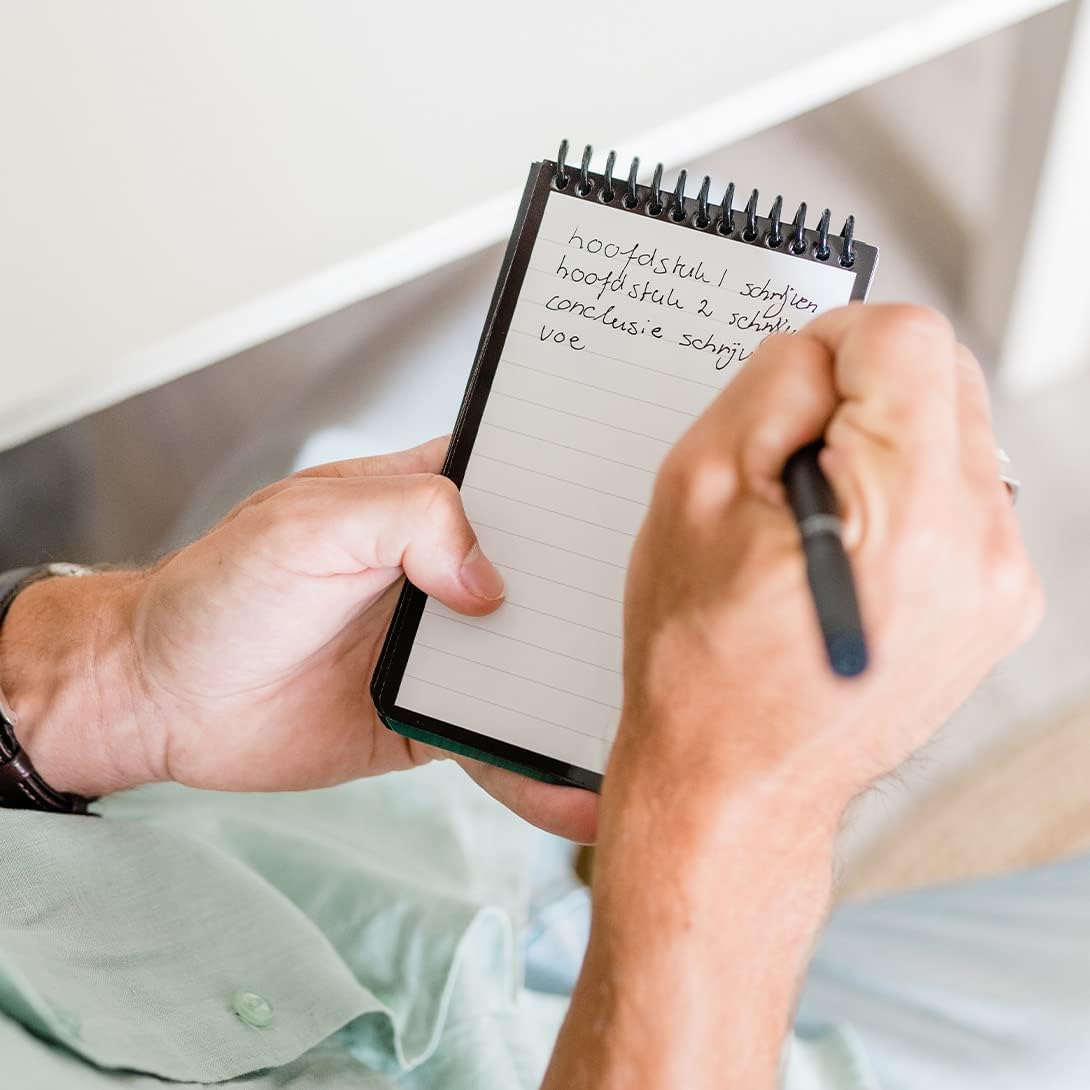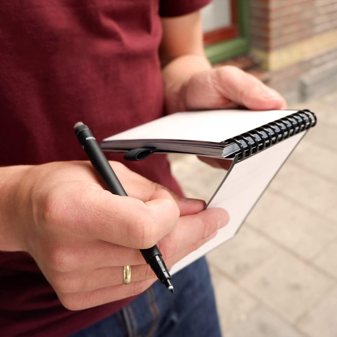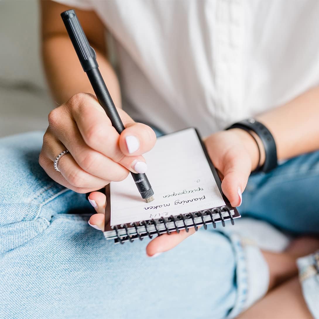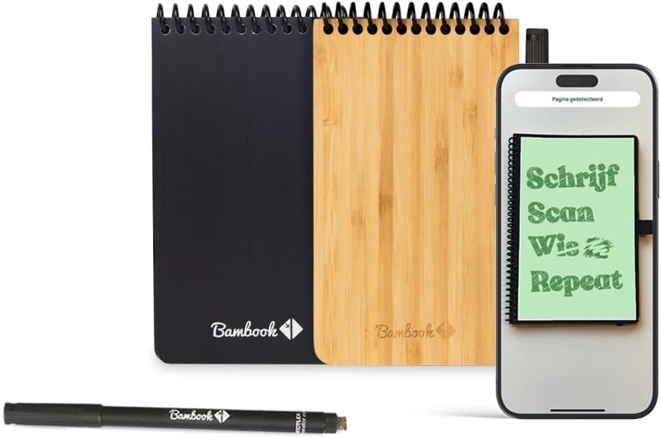 Il taccuino Bambook è un taccuino con pagine cancellabili. Ideale per schizzi, appunti ed elenchi temporanei di cose da fare. Completamente cancellabile e riutilizzabile. Pianta 1 albero per ogni Bambook. Contiene una penna Bambook gratuita. Queste penne hanno uno spessore di scrittura di 0,6 mm e l'inchiostro è nero. Sul retro della penna è presente una gomma per piccole correzioni nei tuoi taccuini. Scansiona e digitalizza i tuoi appunti con l'applicazione Bambook. Archivia istantaneamente tutte le tue informazioni importanti e contribuisci a un futuro sostenibile e senza carta. Personalizzato, pratico ed ecologico. Nero