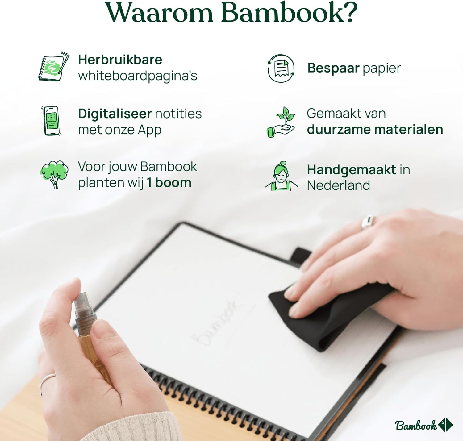 Il taccuino Bambook è un taccuino con pagine cancellabili. Ideale per schizzi, appunti ed elenchi temporanei di cose da fare. Completamente cancellabile e riutilizzabile. Pianta 1 albero per ogni Bambook. Contiene una penna Bambook gratuita. Queste penne hanno uno spessore di scrittura di 0,6 mm e l'inchiostro è nero. Sul retro della penna è presente una gomma per piccole correzioni nei tuoi taccuini. Scansiona e digitalizza i tuoi appunti con l'applicazione Bambook. Archivia istantaneamente tutte le tue informazioni importanti e contribuisci a un futuro sostenibile e senza carta. Personalizzato, pratico ed ecologico. bambù