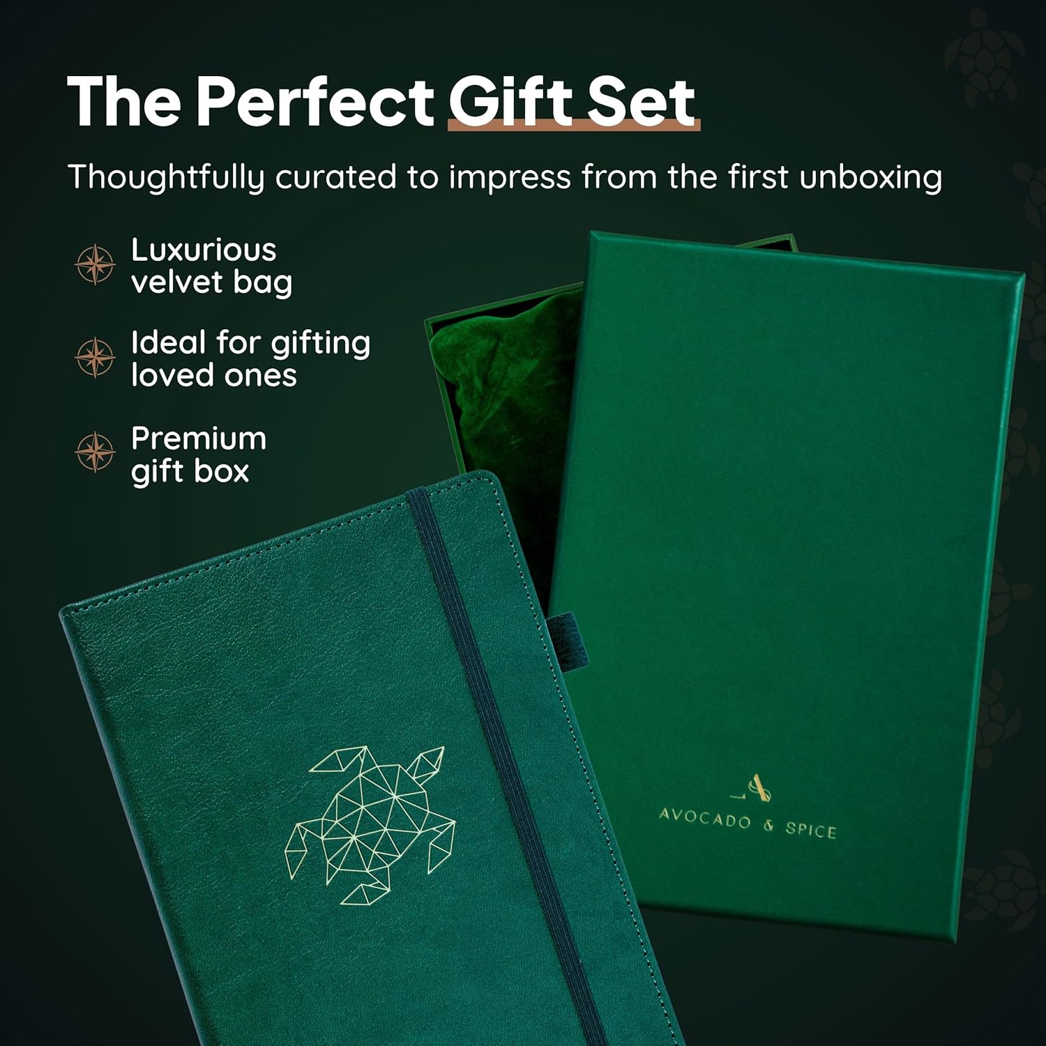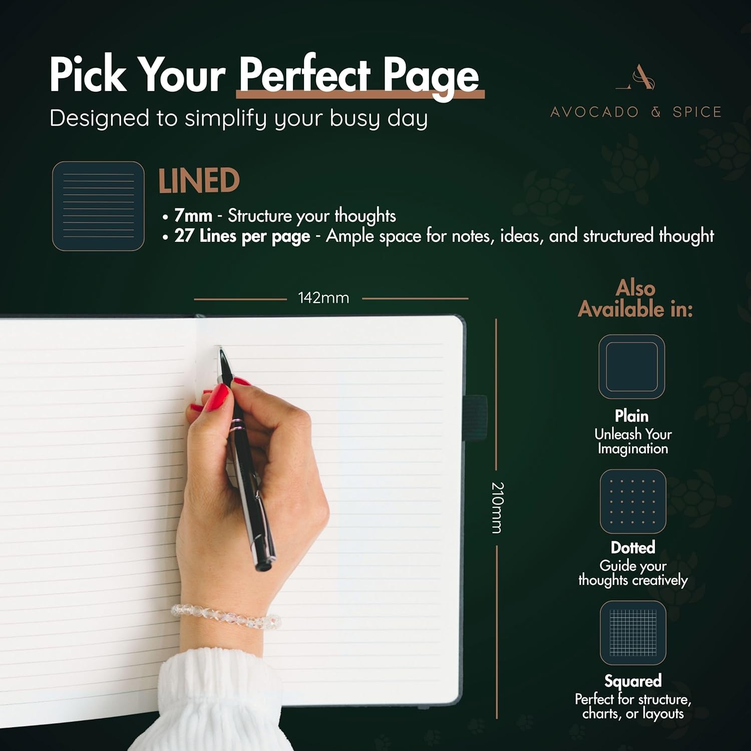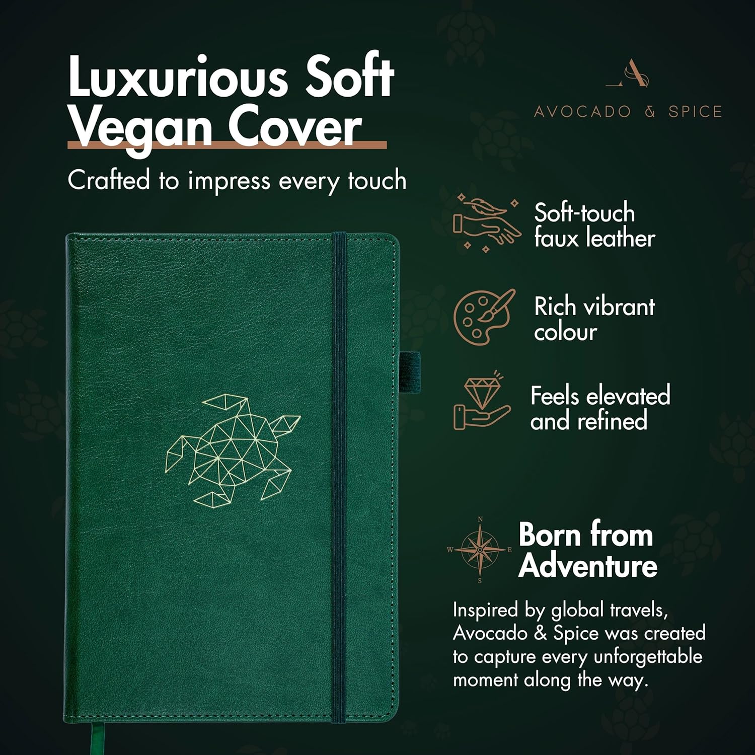 Organizza la tua vita: raccogli i tuoi pensieri e scrivili nel nostro quaderno a righe A5. Il nostro attraente taccuino rilegato in ecopelle ti aspetta per riempire le sue 200 pagine a righe da 120 g/m² con storie, attività quotidiane, obiettivi, elenchi, ecc. Tutti i taccuini A5 Avocado & Spice sono disponibili in 4 diversi tipi di carta: a righe, a punti, a tinta unita o a quadretti. Che tu stia cercando un quaderno in carta millimetrata o un album da disegno, abbiamo quello che fa per te. Pieno di bonus: il nostro diario in carta spessa viene fornito con tutti gli aggiornamenti di cui un giornalista ha bisogno. Il diario è dotato di segnalibro a nastro, portapenne integrato e elastico. Sono inclusi anche una confezione regalo premium e un sacchetto di velluto, che lo rendono un regalo meraviglioso per amici o familiari. Il diario a righe ha 7 mm di spazio tra le righe, offrendo a te o al destinatario del regalo uno spazio più che sufficiente per scrivere i tuoi pensieri. Dimensioni: formato medio A5+ (142 x 210 mm). Scatena la tua creatività: è stato scoperto che il journaling riduce lo stress, allenta la tensione e mette le cose in prospettiva. Usa il nostro taccuino A5 come diario, diario di viaggio o diario di consapevolezza. 100% Cruelty-Free: Realizzata in pelle sintetica, la copertina dei quaderni Avocado & Spice A5 è morbida e liscia come la pelle. Ogni copertina rigida in ecopelle è stampata con l'emblema di una tartaruga in lamina d'oro. Bella idea regalo: questi quaderni A5 sono un regalo premuroso per gli scrittori, i poeti o i viaggiatori della tua vita. Il taccuino A5 con copertina rigida è perfetto sia per le donne che per gli uomini. Regala il nostro bellissimo quaderno come regalo di laurea, regalo per insegnanti, regalo di compleanno, regalo di ringraziamento.