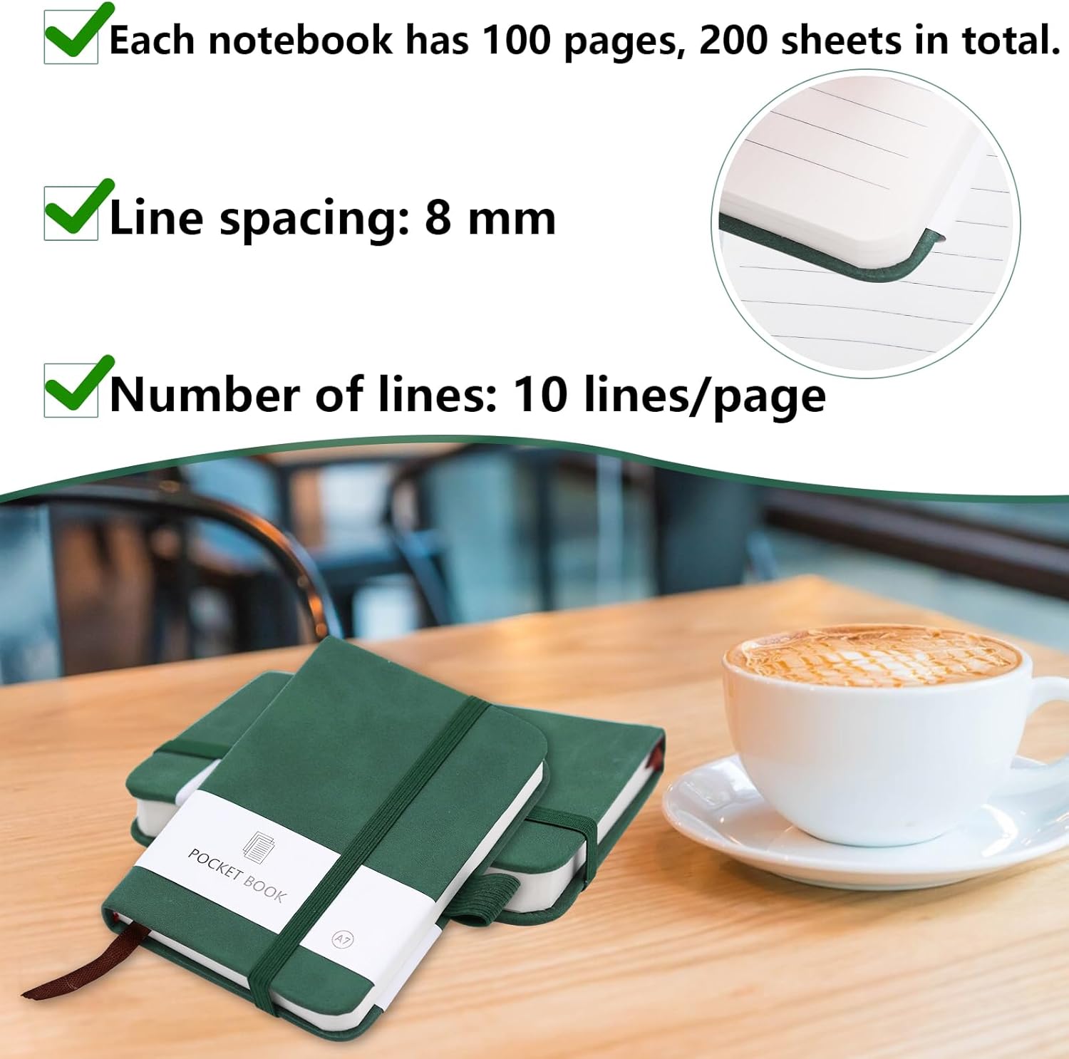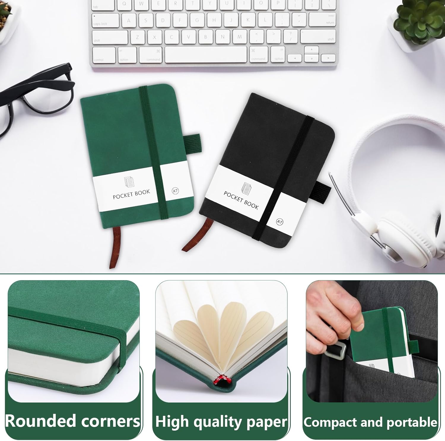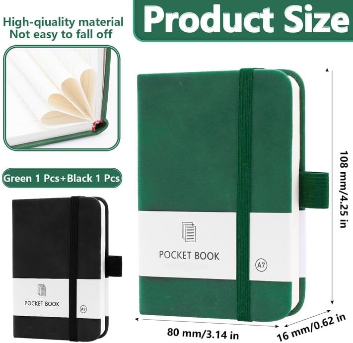 PICCOLO E TRASPORTABILE: La dimensione del piccolo notebook portatile è 10,8 × 8 × 1,6 cm, perfetta per il trasporto e può essere facilmente infilata in tasca o in borsa senza occupare troppo spazio e peso ed è adatta per un uso quotidiano continuo. Il taccuino è dotato di un portapenne, molto pratico per posizionare le penne DESIGN PRATICO: la fascia di chiusura elastica ben progettata tiene insieme le singole pagine in modo affidabile e protegge efficacemente il taccuino dalla piegatura. Il quaderno A7 è dotato di pratici segnalibri tessili che permettono di segnare le diverse pagine per facilitarne la ricerca e l'apertura. NOTEBOOK DI ALTA QUALITÀ: la morbida copertina in ecopelle conferisce al mini notebook personalizzato una qualità superiore. Disponibile in due colori classici (nero, verde), dona il giusto look&feel. Quaderni per la scuola, i festival e il lavoro, ottimi regali anche per la famiglia, gli amici, i compagni di classe e i colleghi CONFEZIONE: Il set contiene due mini quaderni da 200 pagine ciascuno (100 fogli) e 80 g/m². La carta è abbastanza spessa, resiste alle forature e alle perdite di inchiostro, perfetta per l'uso quotidiano AMPIO UTILIZZO: I nostri piccoli quaderni sono adatti a studenti, uomini d'affari o persone in altri campi come quaderno, blocco note, libro da disegno o diario per annotare ispirazioni o cose importanti in qualsiasi momento