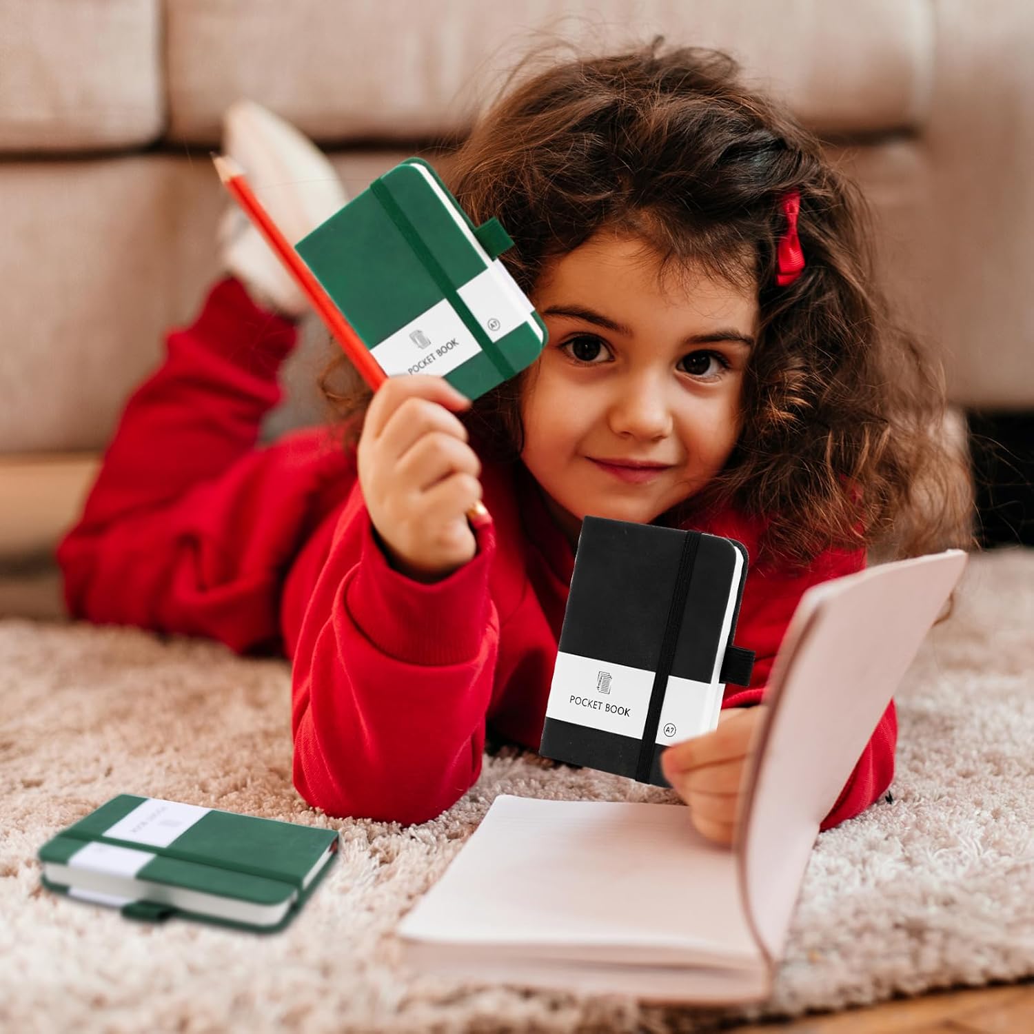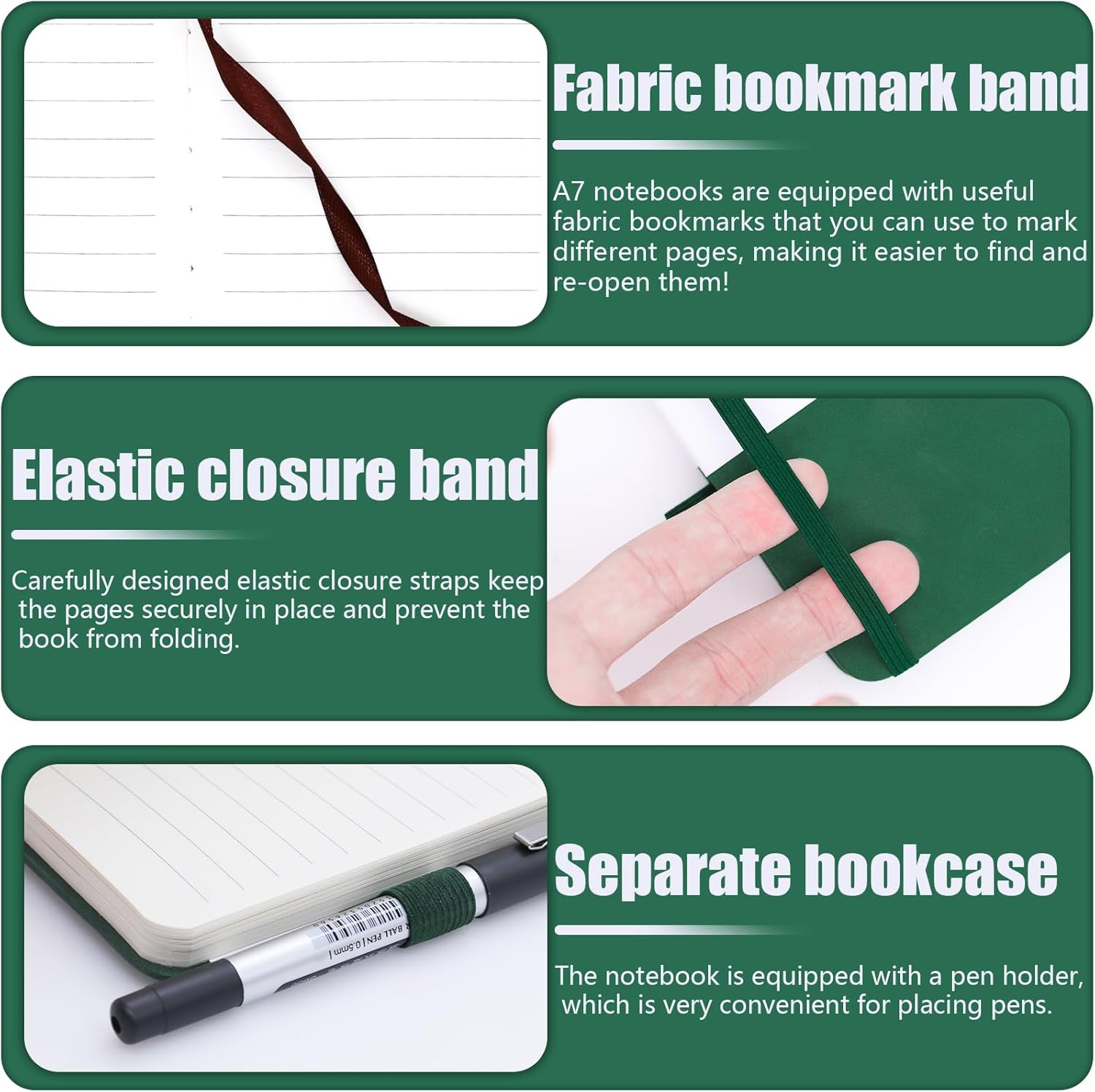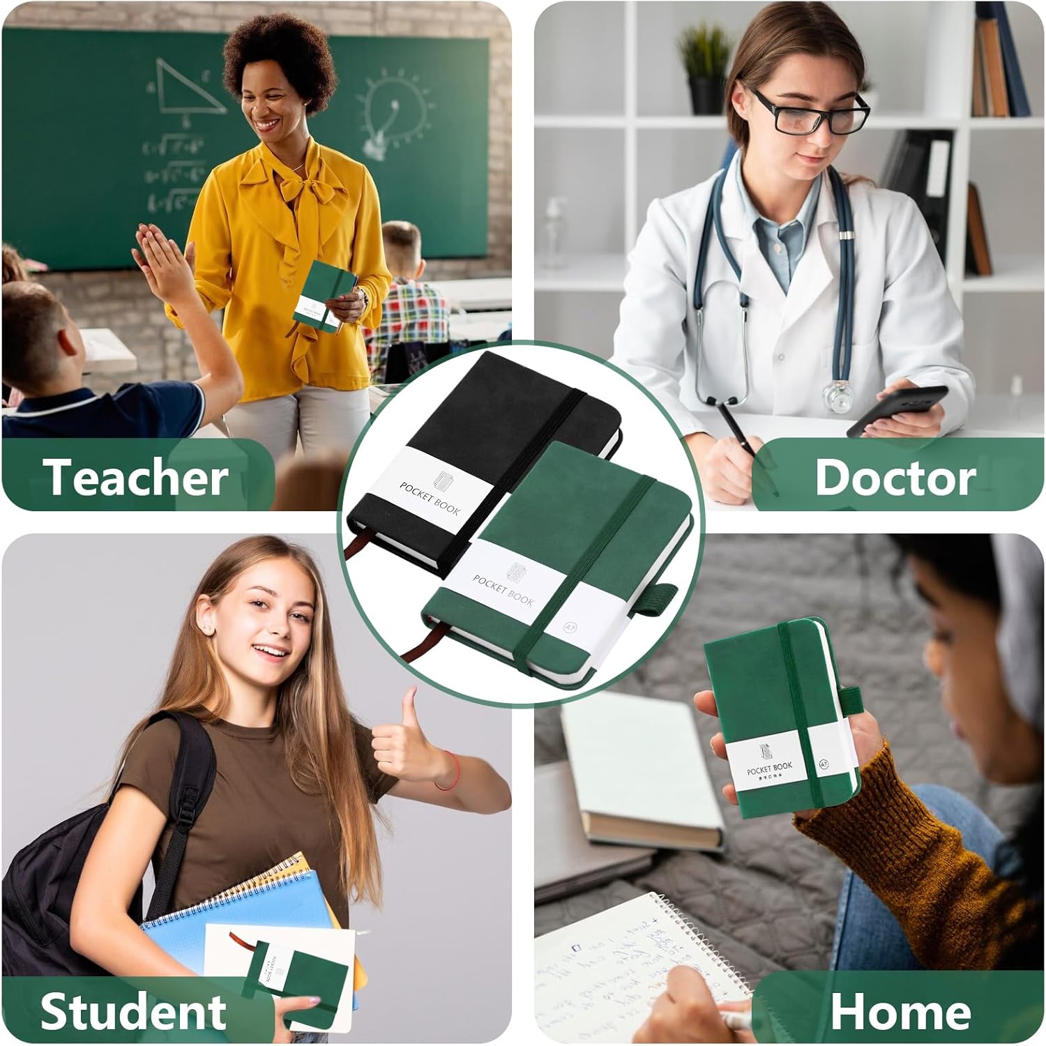 PICCOLO E TRASPORTABILE: La dimensione del piccolo notebook portatile è 10,8 × 8 × 1,6 cm, perfetta per il trasporto e può essere facilmente infilata in tasca o in borsa senza occupare troppo spazio e peso ed è adatta per un uso quotidiano continuo. Il taccuino è dotato di un portapenne, molto pratico per posizionare le penne DESIGN PRATICO: la fascia di chiusura elastica ben progettata tiene insieme le singole pagine in modo affidabile e protegge efficacemente il taccuino dalla piegatura. Il quaderno A7 è dotato di pratici segnalibri tessili che permettono di segnare le diverse pagine per facilitarne la ricerca e l'apertura. NOTEBOOK DI ALTA QUALITÀ: la morbida copertina in ecopelle conferisce al mini notebook personalizzato una qualità superiore. Disponibile in due colori classici (nero, verde), dona il giusto look&feel. Quaderni per la scuola, i festival e il lavoro, ottimi regali anche per la famiglia, gli amici, i compagni di classe e i colleghi CONFEZIONE: Il set contiene due mini quaderni da 200 pagine ciascuno (100 fogli) e 80 g/m². La carta è abbastanza spessa, resiste alle forature e alle perdite di inchiostro, perfetta per l'uso quotidiano AMPIO UTILIZZO: I nostri piccoli quaderni sono adatti a studenti, uomini d'affari o persone in altri campi come quaderno, blocco note, libro da disegno o diario per annotare ispirazioni o cose importanti in qualsiasi momento