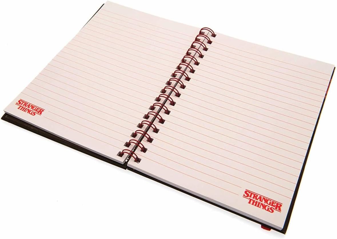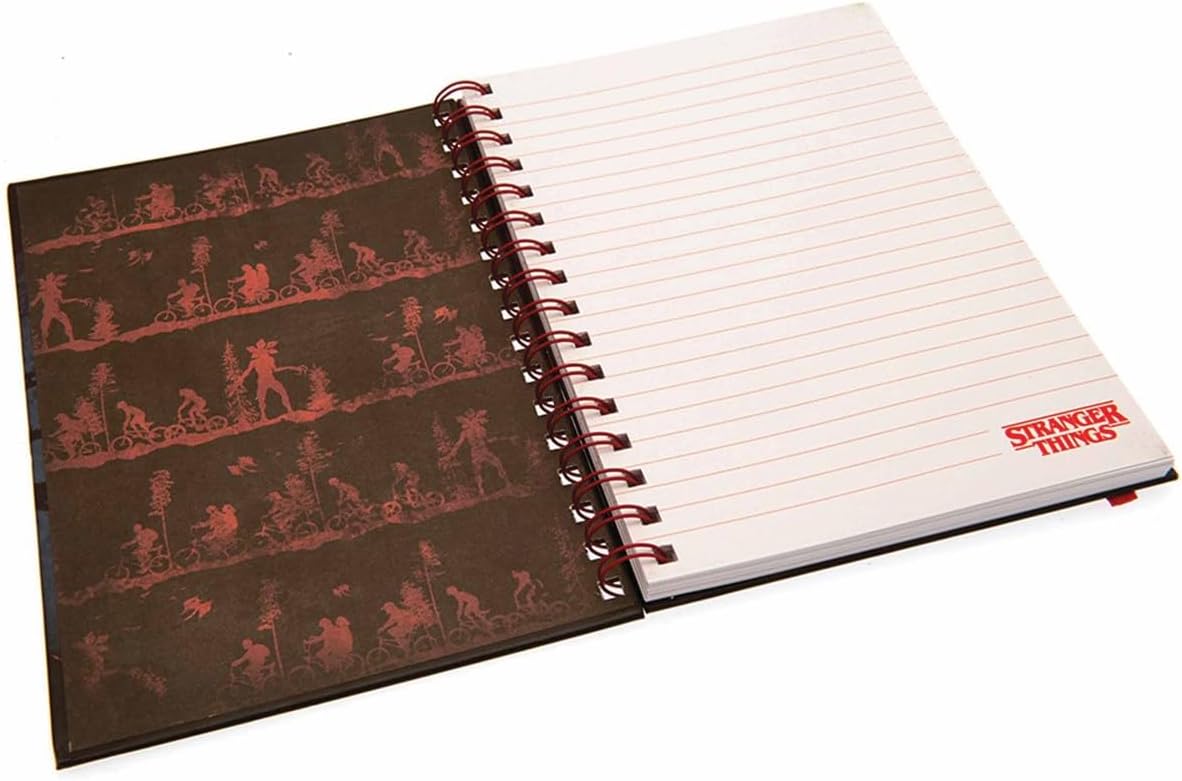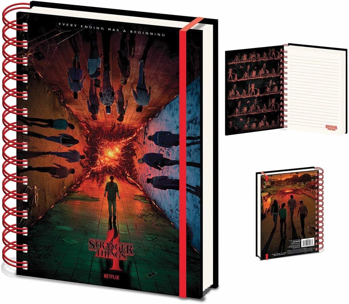 Quaderno a spirale con copertina rigida di alta qualità Il taccuino mostra l'artwork ufficiale di Stranger Things 4, con Eleven e la banda di Hawkin, Jim Hopper, Joyce e Murray, che camminano con cautela verso una delle porte che conducono al sottosopra Lo slogan ufficiale utilizzato per annunciare Stranger Things 4, la stagione che spiega le origini degli eventi soprannaturali attorno ai quali ruota la serie