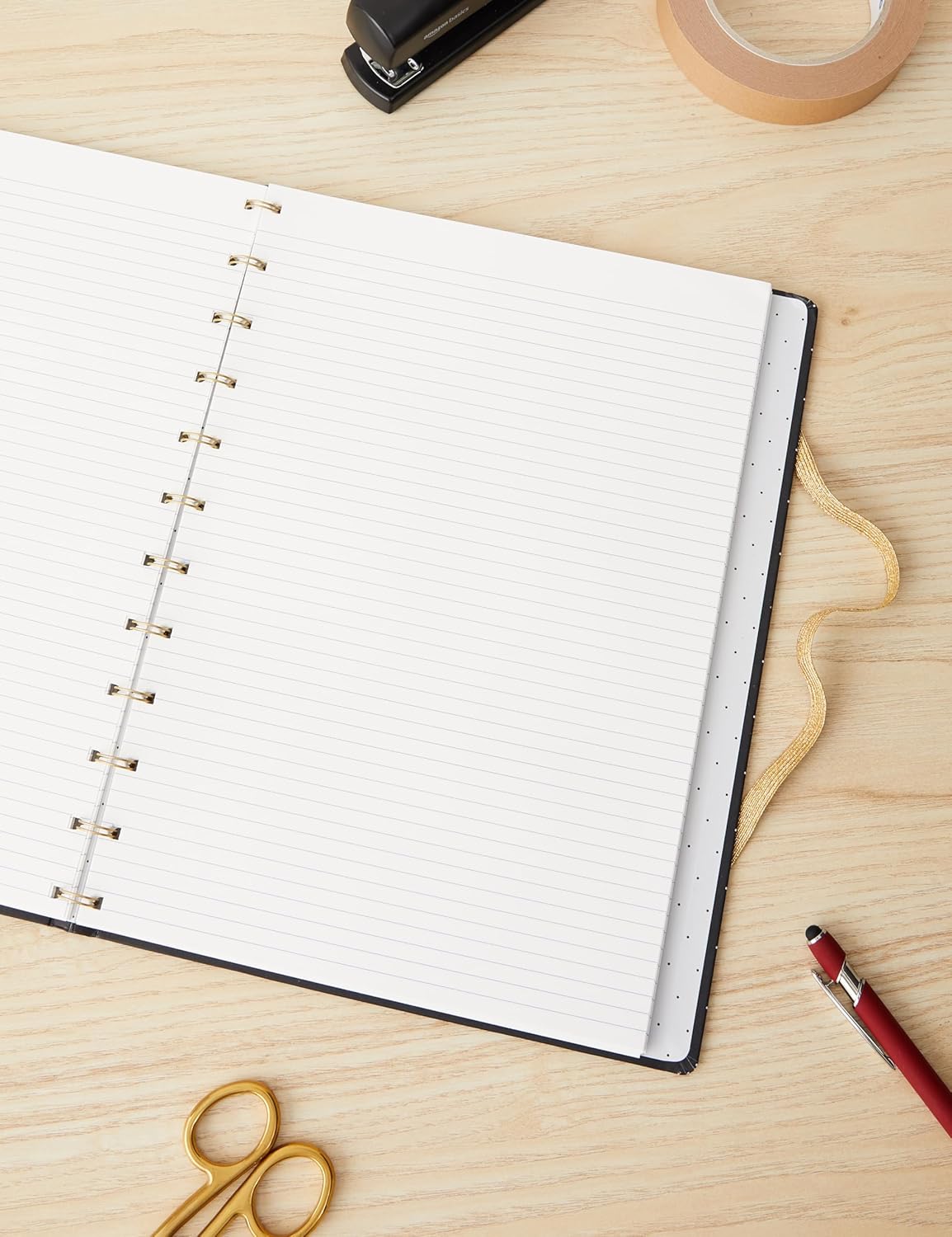 Copertina fantasia con accenti bianchi e dorati Chiusura con elastico Le pagine possono essere aggiunte, rimosse o riposizionate Si piega completamente in piano e si piega schiena contro schiena 56 fogli di carta adatta per penne stilografiche da 100 g/m²