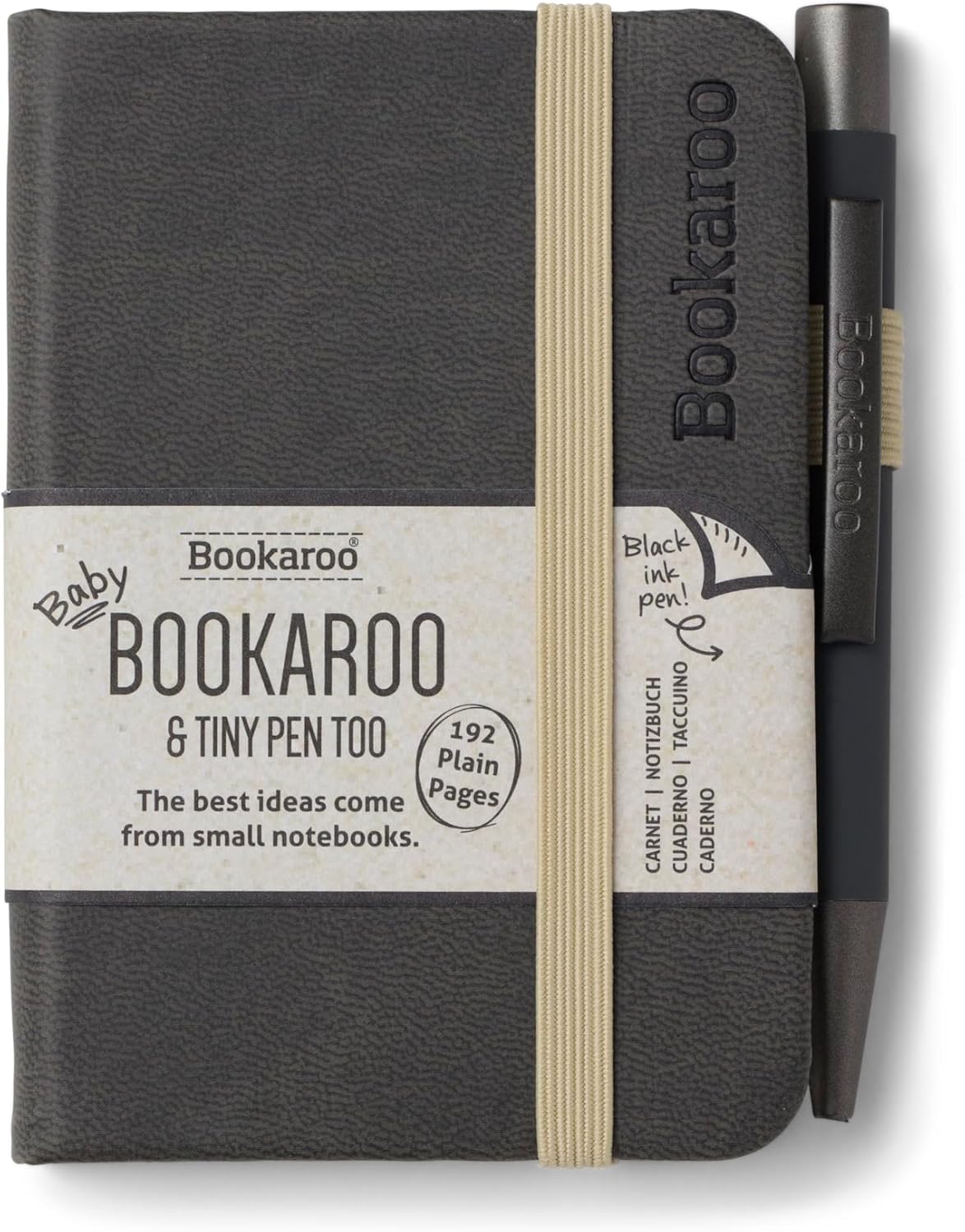 Un piccolo taccuino A7 con copertina rigida e morbida copertina in poliuretano stampato 192 pagine bianche di carta avorio da 70 g/m² Con elastico, nastro e portapenna abbinati Penna a sfera nera di dimensioni perfette