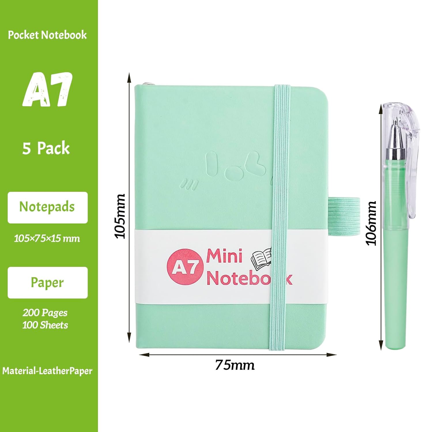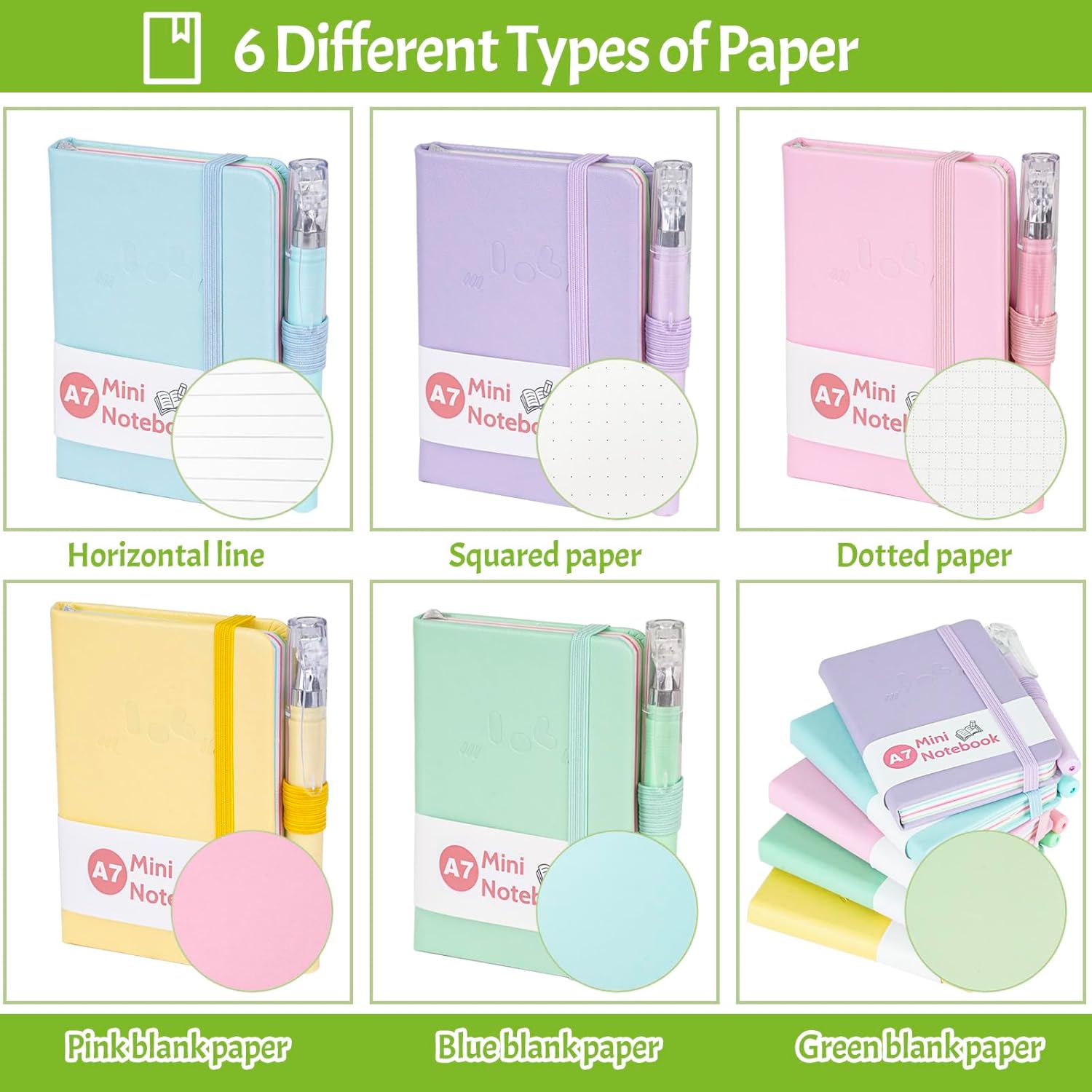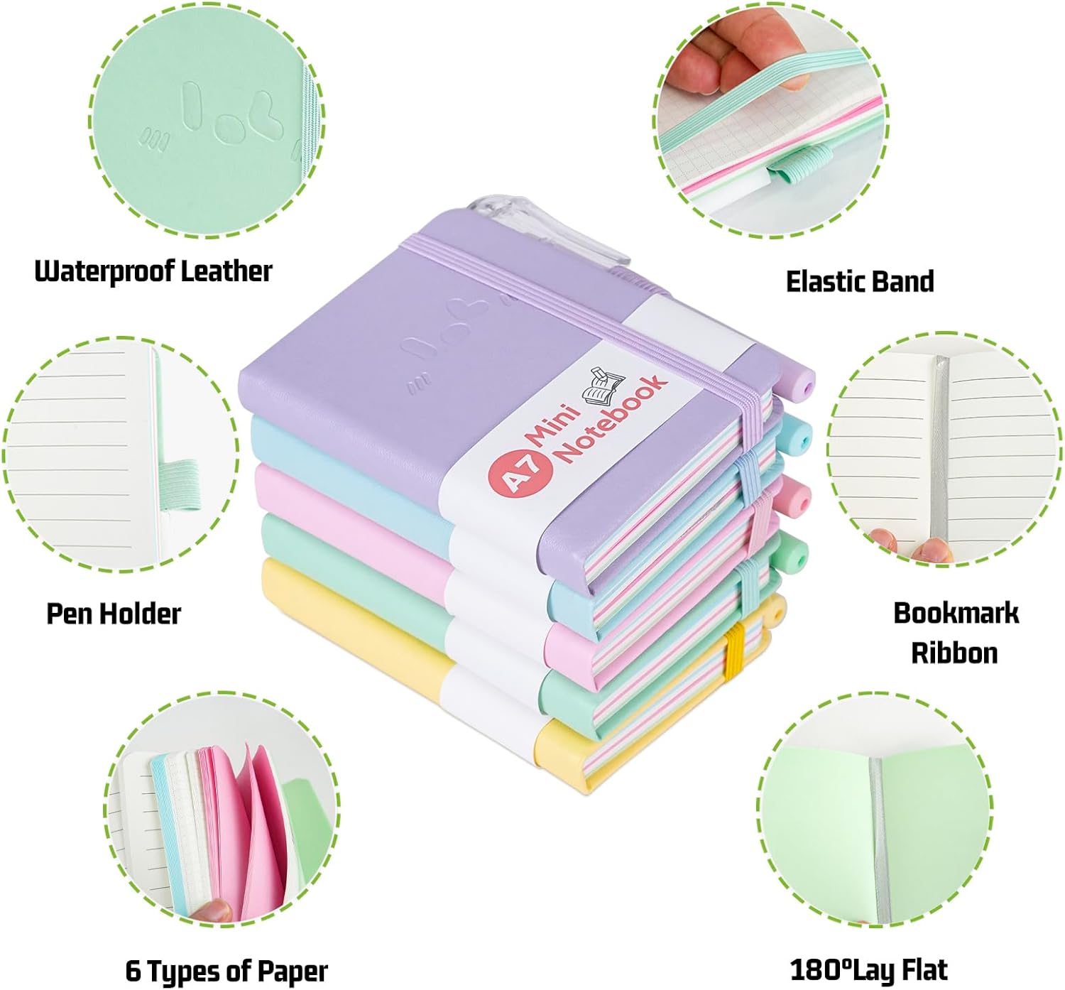 👉Contenuto della confezione: riceverai 5 piccoli quaderni tascabili in diversi colori e 5 penne tascabili. La dimensione di questo taccuino è 10,5 cm*7,5 cm, che non è solo piccola e carina, ma anche la dimensione perfetta da portare con te o mettere in tasca, così puoi scrivere ciò che vedi e senti sempre e ovunque. 👉Design fantastico: questo piccolo taccuino ha un motivo carino sulla copertina e una robusta rilegatura in ecopelle che protegge intatte le pagine interne pur essendo resistente all'usura e allo sporco; il taccuino viene fornito anche con un elastico, un segnalibro con nastro e un portapenne, che ti offrono un'esperienza più personale e umana. 👉Carta personalizzata: questo blocco note A7 tascabile contiene 200 pagine/100 fogli che ti offrono molto spazio per scrivere, permettendoti di scrivere liberamente con penna e inchiostro e dare libero sfogo alla tua creatività. Il piccolo taccuino portatile contiene 6 diversi tipi di carta: linee orizzontali, carta a pois, carta millimetrata e 3 diversi colori di carta bianca, che ti offrono più scelte per la tua scrittura e ti fanno sentire la connessione silenziosa tra penna e carta. 👉Penna tascabile gratuita: questo piccolo blocco note viene fornito con 5 matite tascabili colorate da 0,5 mm e 5 mine sostitutive, realizzate con inchiostro di nuova generazione e sfera in carburo di tungsteno, con flusso di inchiostro regolare e scrittura più fluida, l'abbinamento perfetto ti offre una migliore esperienza di scrittura, permettendoti di registrare la tua vita sempre e ovunque. 👉Ampio utilizzo: questo mini set di custodie per quaderni da viaggio dai colori vivaci è perfetto per l'ufficio, la casa, la scuola e altre aree. Può essere utilizzato come diario, blocco note, manuale di viaggio, agenda ecc. Questo delizioso piccolo taccuino può essere portato con te in modo da poter scrivere la tua vita in qualsiasi momento, ma è anche un regalo ideale per i tuoi amici e familiari. E con i suoi colori vivaci e le fantasie carine, puoi anche infilarlo nel tuo sacchetto delle feste per sorprendere i tuoi bambini!