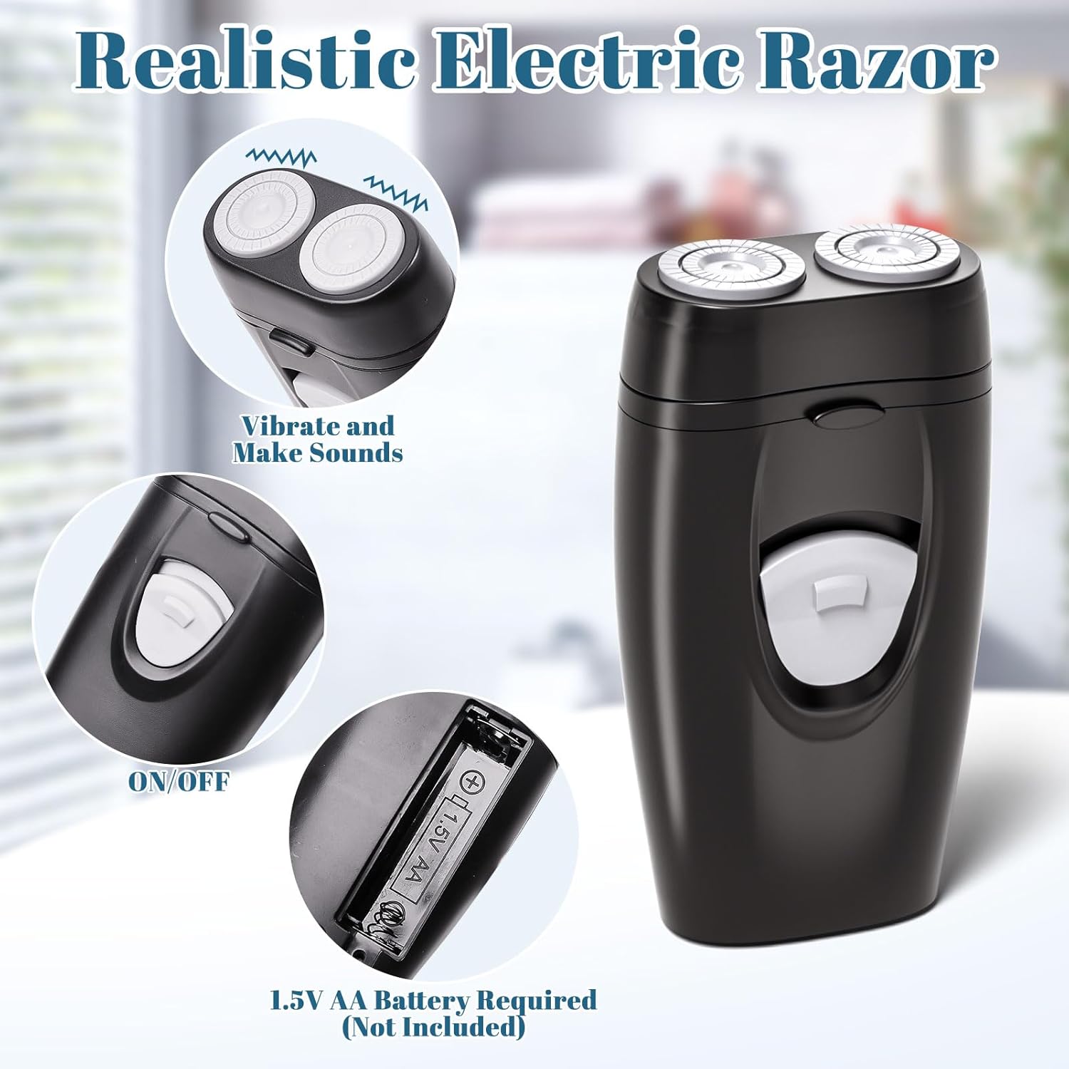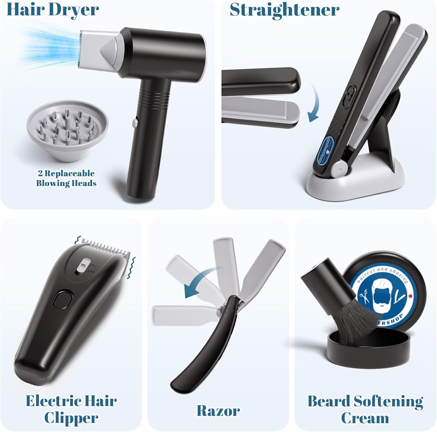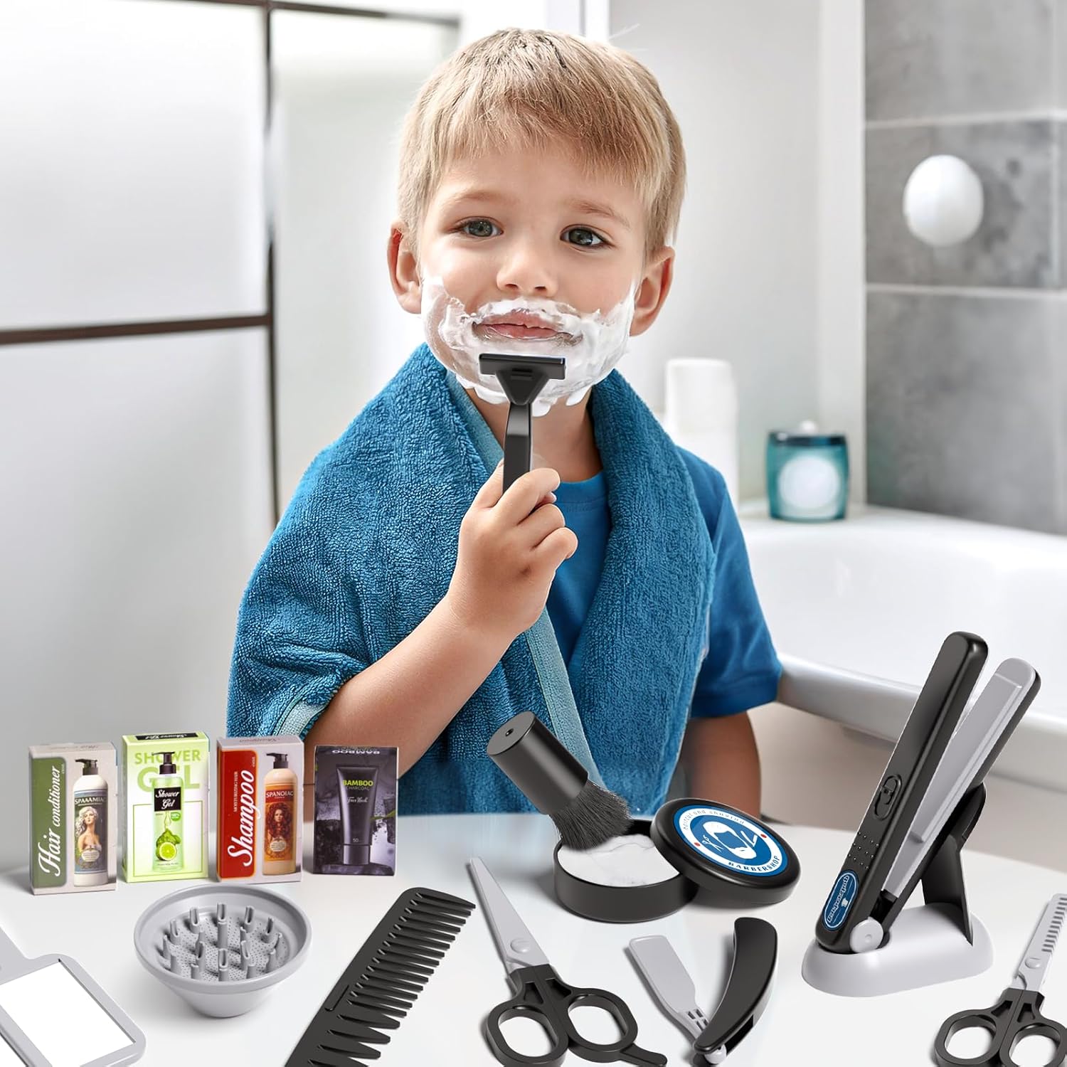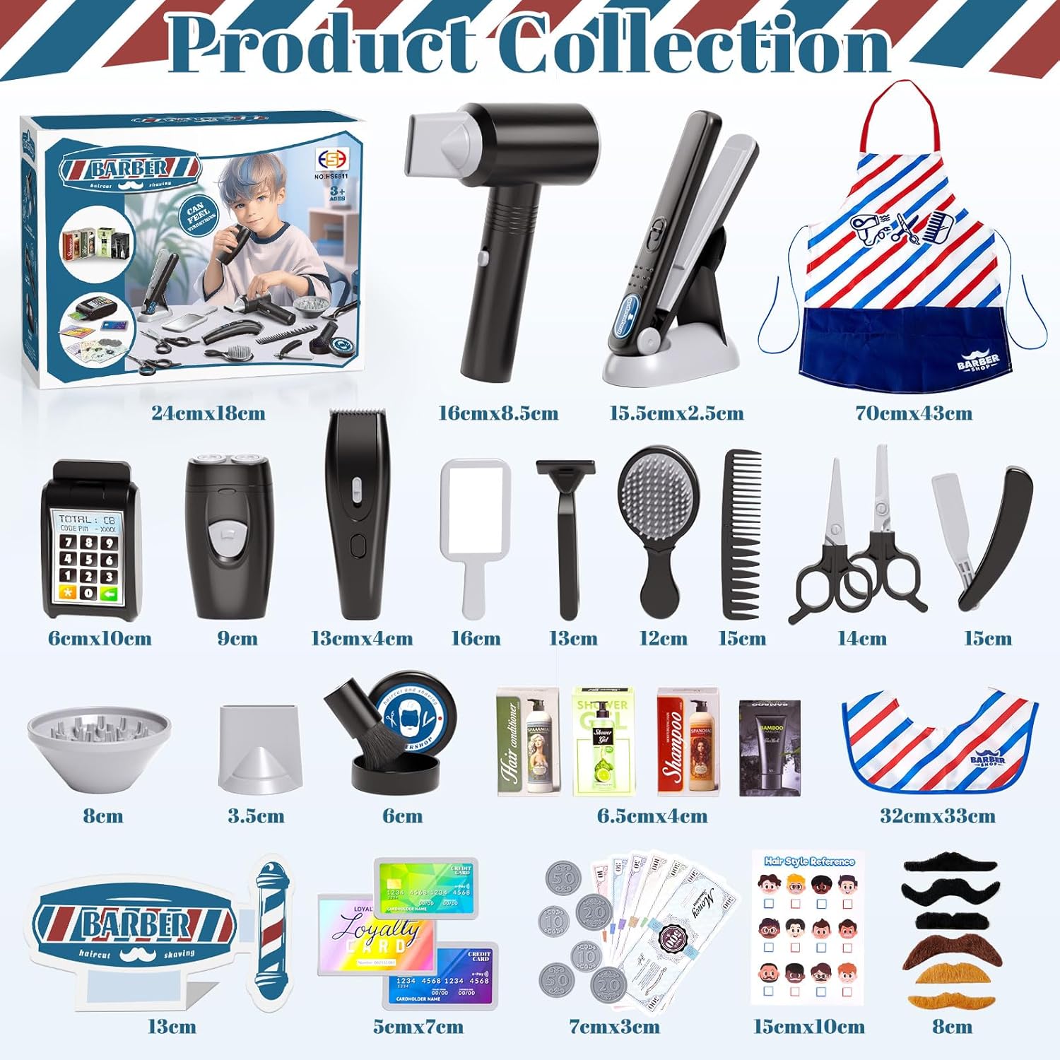 Set da parrucchiere per bambini: Questo gioco da parrucchiere per bambini include rasoii giocattolo, asciugacapelli, stropicciatori, specchio, spazzola, forbici da parrucchiere, grembiule da parrucchiere, attrezzatura da truccare, pennelli, falsi baffi. Include anche carte di credito, banconote, monete e una macchina da leggere le carte come giocattoli. Funzionalità reali: L'asciugacapelli alimentato da batterie (senza batterie) emette un vento freddo e un suono quando si preme il pulsante e ha due ugelli intercambiabili. Il rasoio elettrico emette un tono di vibrazione realistico quando si accende l'interruttore. Gioco da parrucchiere divertente: I bambini possono trasformarsi in costumi da parrucchiere professionali e creare un ampio spettro di look con l'abbondante set di accessori. Baffo regolabile per bambini e la maggior parte degli adulti, incluso l'attrezzatura per tagliare i capelli e l'attrezzatura per rasare. Gioco educativo: Il vostro bambino può avere non solo divertimento con questo set da parrucchiere, ma può anche migliorare abilità importanti come creatività, immaginazione, coordinazione mano-occhio e pensiero. Il set da parrucchiere per ragazzi è in plastica di alta qualità. Questo plastica resistente garantisce che i bambini possano giocare in modo sicuro con il set. Regalo ideale per i ragazzi: Il set di salone di bellezza per ragazzi ha bordi liscio e è molto sicuro per i bambini. Questo set di giochi è il regalo perfetto per i ragazzi e le ragazze tra i 3 e i 8 anni. Questo giocattolo è un ottimo regalo per i ragazzi per il compleanno, Natale, attività di classe e giochi di ruolo!