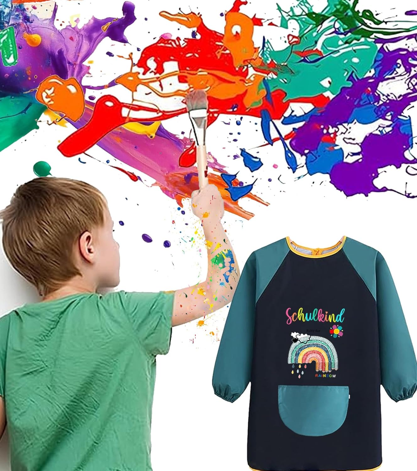 Protezione affidabile durante la pittura e il fai da te: il camice impermeabile protegge i vestiti da vernici, colla e sporco, ideale per lezioni di pittura, lezioni di bricolage e progetti scolastici. Facile da indossare e da togliere grazie alla chiusura in velcro. La pratica chiusura in velcro consente ai bambini di indossare autonomamente – particolarmente adatto come camice da pittore scuola 1. Classe per l'uso quotidiano. Adatto per bambini di 105-125 cm. La comoda vestibilità offre sufficiente libertà di movimento durante il lavoro creativo. Perfettamente adatto per bambini della scuola elementare e adatto come camice per la scuola elementare. I motivi ad arco piovoso ispirano la creatività: il motivo arcobaleno adatto ai bambini rende il camice da pittura una vera attrazione. I colori vivaci stimolano l'immaginazione e portano subito un buon umore durante la pittura o il fai da te. Regalo ideale per la scuola. Perfetto come regalo per ragazze e ragazzi: il camice colorato con motivo arcobaleno è ideale per la scuola, l'asilo o i pomeriggi creativi a casa.