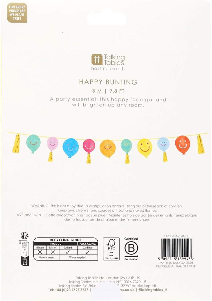 Talking Tables Ghirlanda di carta Riutilizzabile Faccina con palloncini Stamina lunga 3 metri (9,8 piedi) Decorazione colorata con faccine per ragazzi e ragazze Compleanno Baby Shower Giardino Ecologico Porta gioia ai compleanni o alle feste con la nostra ghirlanda con faccine felici. Con palloncini colorati con faccine sorridenti garantisce colore e divertimento. Lunghezza: 3 metri. ECOLOGICO: TUTTI i prodotti Talking Tables sono riutilizzabili o possono essere riciclati a casa. Questo vale sia per il prodotto che per la confezione! QUALITÀ - I nostri prodotti sono realizzati secondo i più alti standard di qualità e sono venduti in molti negozi di alta qualità nel Regno Unito e a livello internazionale. MARCHIO BRITANNICO: Talking Tables è diventato il marchio di prodotti innovativi, sostenibili e di design che aggiungono divertimento e stile ad ogni occasione.