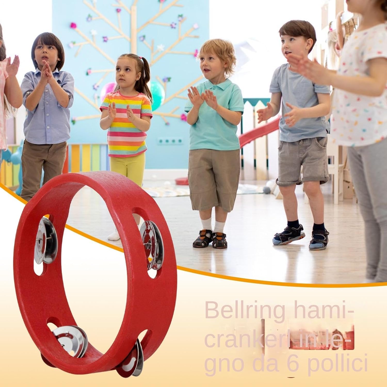 Migliorare le prestazioni divertenti: il design divertente del tamburello in metdei nostri bambini ispira i tuoi bambini a creare musica. Il suo melodioso suono tintinnante può aggiungere toni ricchi a qualsiasi scena musicale, migliorandone l'espressione musicale. Fai fluire la creatività di tuo figlio con il nostro prodotto. Per la maggior parte delle occasioni: aggiungendo un tocco di divertimento in più a concerti, giocattoli e altro ancora, questo tamburello per bambini è per feste e balli vivaci, incoraggiando stesso la passione per la musica e il ritmo. Suono chiaro: combinando legno di qualità e campane di metliscio, il tamburello dei nostri bambini produce un suono chiaro e piacevole che cattura l'attenzione dei giovani musicisti e migliora le loro capacità musicali, rendendolo la scelta perfetta per i principianti. Leggero e portatile: con un diametro di circa 6 pollici, questo tamburello è facile da tenere e trasportare, consentendo ai bambini di creare musica ovunque vadano. Multifunzione: il nostro tamburello per bambini, adatto a bambini dai 3 anni in su, è progettato per fornire un modo emozionante ed efficace per imparare la musica. Ottimo per la casa, gli asili e le aule di musica, è un eccellente sussidio didattico per bambini.