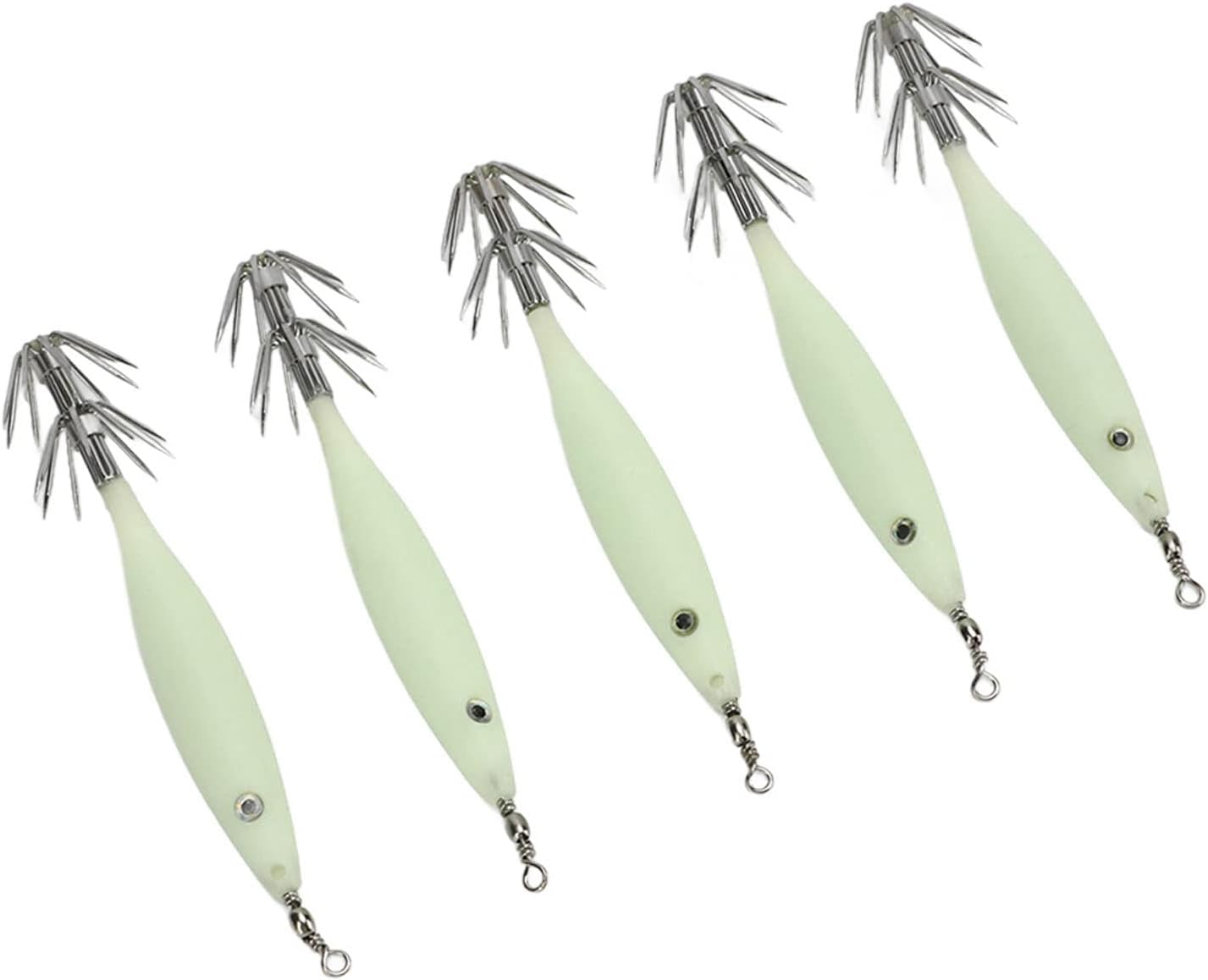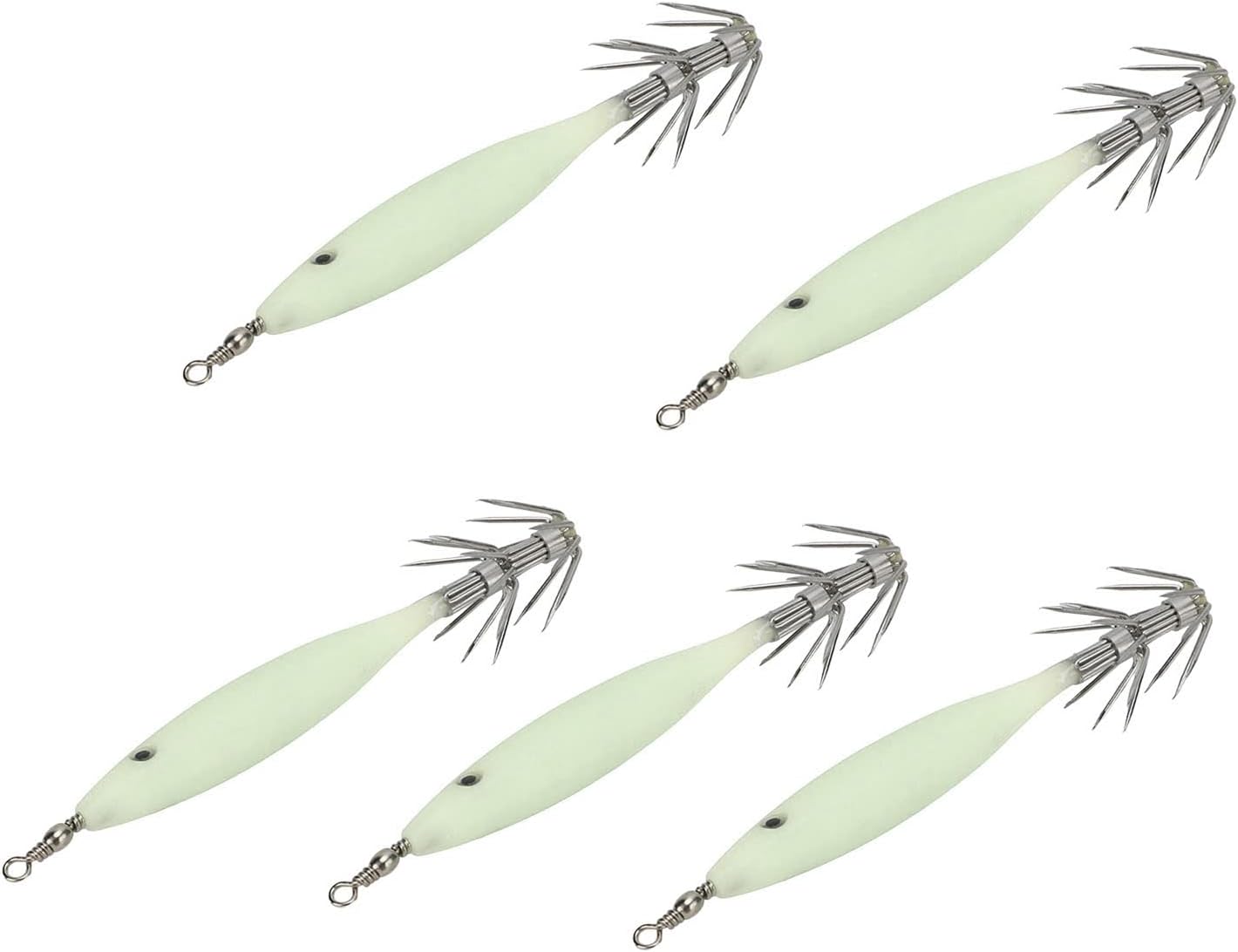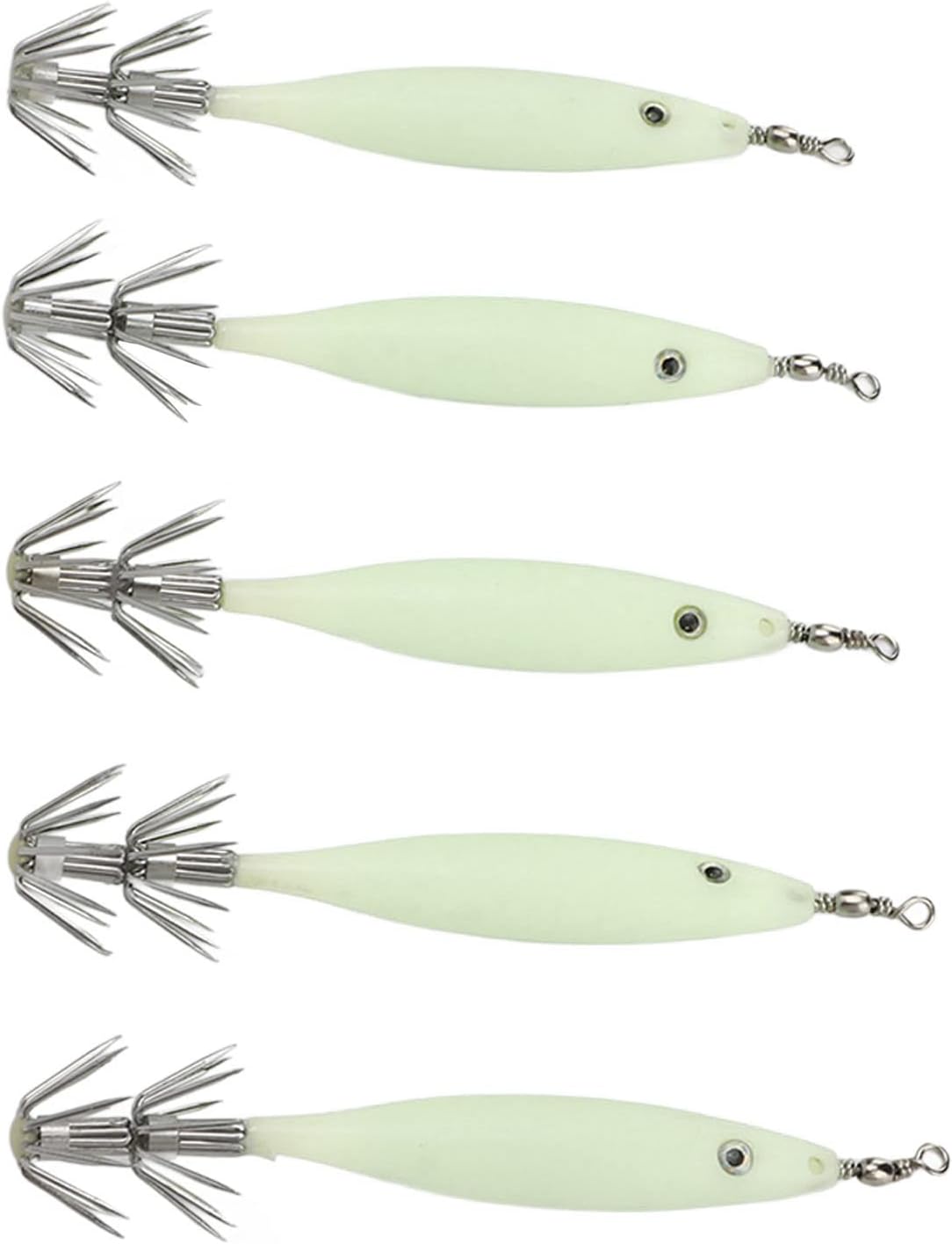 FORMA VIBRANTE: l'aspetto aerodinamico può ridurre efficacemente la resistenza al vento e l'aspetto simulato può attirare i pesci sull'amo. Amo da pesca conciso: mini esca con gancio in acciaio al carbonio, conciso e resistente, non sbiadisce né arrugginisce, migliora efficacemente il tasso di successo della pesca e impedisce la fuga dei pesci. FUNZIONE LUCE: lo speciale corpo dell'esca luminoso utilizzato per la pesca ha una buona visibilità. Dopo aver assorbito la luce, l'amo del calamaro può brillare al buio per attirare i pesci. LEGGERO E PORTATILE: il kit contiene 5 esche artificiali facili da usare e che non richiedono alcuna manipolazione particolare, rendendole facili da trasportare e adatte agli appassionati di pesca. OCCASIONE APPLICABILE: questa esca per calamari è ideale per la pesca in acqua salata e d'acqua dolce, può catturare pesci manica, calamari, calamari e calamari.
