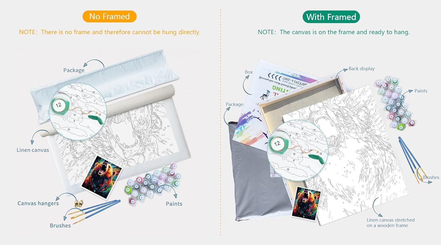 Come dipingere per numero? 1. Puoi decidere il turno di disegno secondo il tuo favore personale o a turno dei numeri. 2. Per la vernice bianca e altre parti di vernice di colore chiaro, le figure lasciate sulla tela possono essere viste, è possibile utilizzare due volte la vernice e cercare di coprire con la vernice spessa. 3. Utilizzare direttamente la vernice e non aggiungere acqua. 4. Basta abbinare il numero di colore e la figura sulla tela per completare il colore. 5. Se non fai attenzione a riempire un colore sbagliato, puoi aspettare che la vernice si asciughi e quindi coprire la parte sbagliata con il colore corretto. 6. Lavare il pennello in modo pulito quando si passa a un altro colore. 7. Per la parte più grande, è possibile utilizzare il pennello più grande per dipingere, e per la parte piccola, è possibile utilizzare il pennello più piccolo per dipingere. 8. Lavare il pennello in modo pulito ogni volta che si finisce di dipingere per il prossimo utilizzo. 9. Se vi capita di applicare la vernice sui vestiti, lavateli immediatamente. 10. Si prega di chiudere bene il coperchio della vernice quando non lo si utilizza, per evitare che il colore si asciughi. 11. Le figure sulla tela potrebbero non essere coperte completamente, spero che non ti dispiaccia. 12. La vernice che offriamo è sufficiente per un uso normale, si prega di non sprecarla in caso di carenza di vernice.