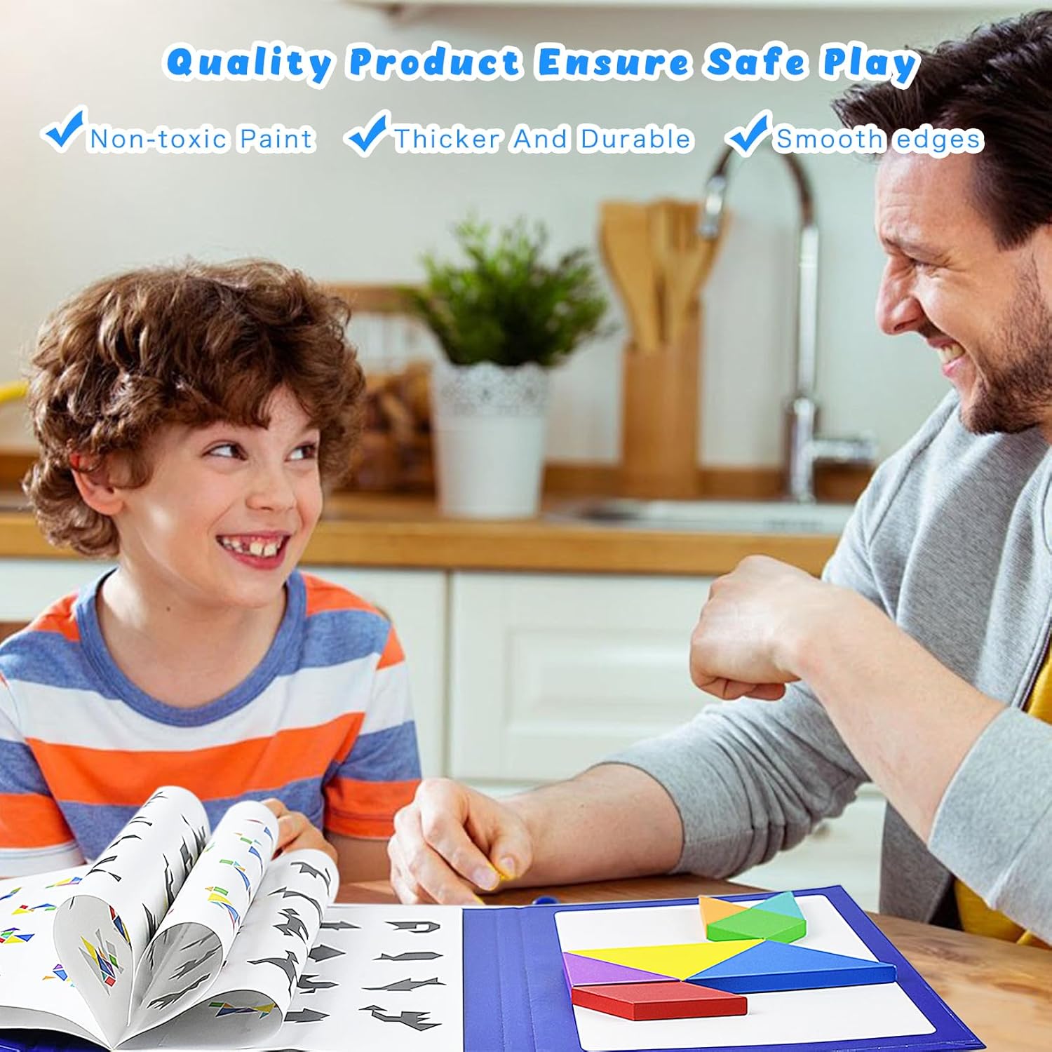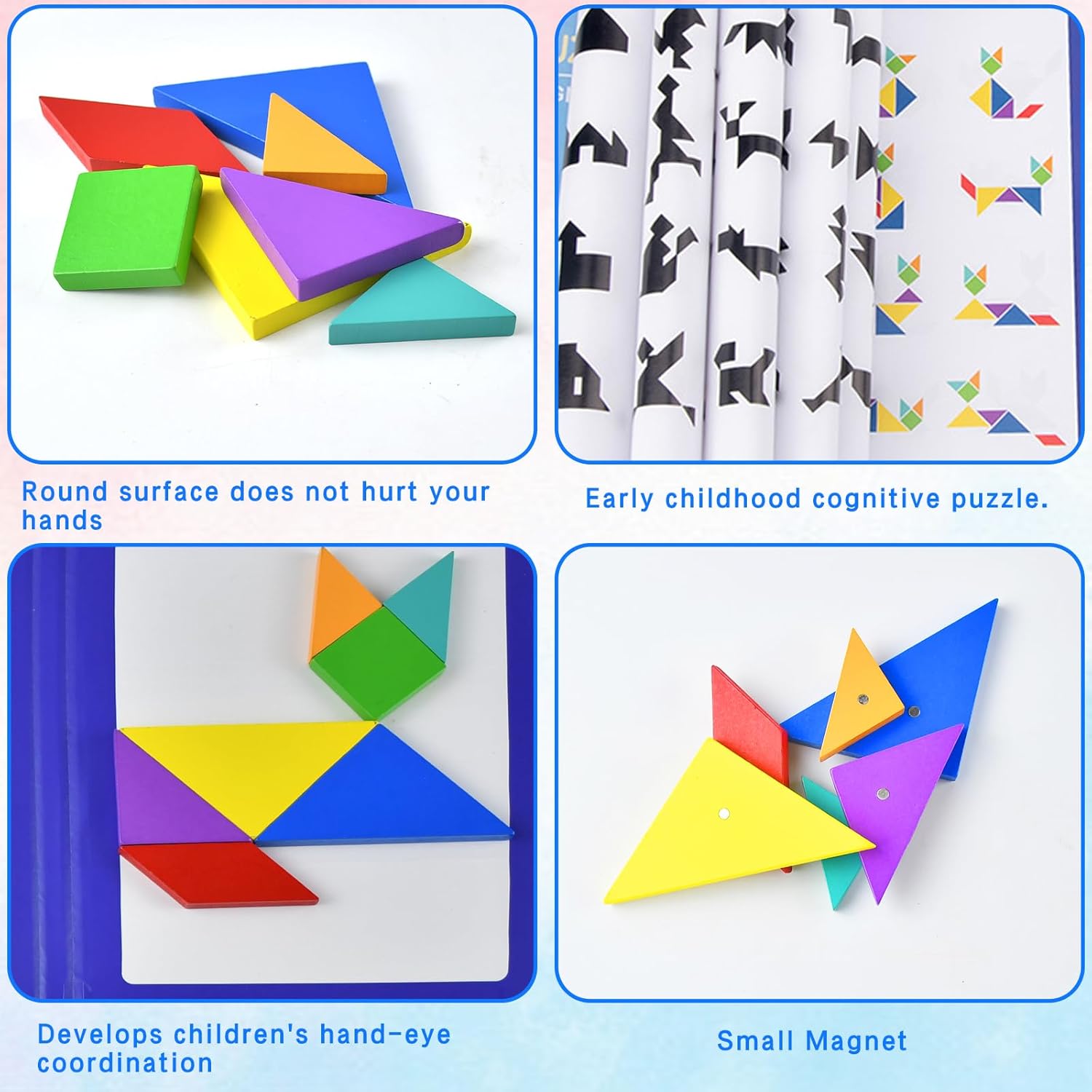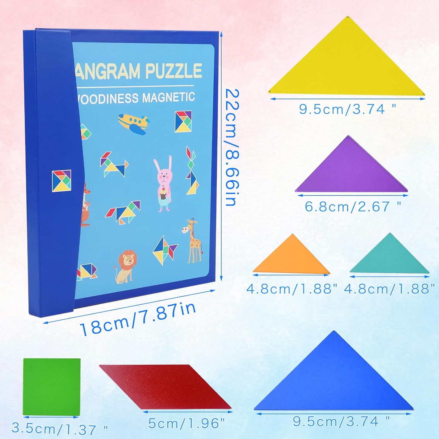 【Tangram】Scopri il divertimento educativo con questo tangram magnetico, un classico rompicapo reinventato per i più piccoli. Composto da 7 pezzi colorati e magnetici, è perfetto per sviluppare logica e creatività. Un tangram bambini ideale per imparare giocando. 【Tangram Magnetico】Ogni set include ben 96 diverse sfide con soluzioni incluse, pensate per stimolare il pensiero critico. Questi magnetic toys offrono ore di gioco creativo, permettendo ai bambini di costruire animali, personaggi, case e forme geometriche in modo divertente e coinvolgente. 【Tangram Bambini Magnetico】Grazie al potente effetto magnetico, i pezzi aderiscono facilmente a superfici metalliche, rendendo questo tangram magnetico sicuro, pratico e facile da riporre. Perfetto per manine piccole, sviluppa coordinazione occhio-mano e motricità fine in modo naturale. 【Tangram Gioco da Viaggio】Leggero e portatile, il tangram magnetico da viaggio è il compagno ideale per spostamenti, attese o pause. Si può giocare ovunque, a casa o in movimento, trasformandosi in un intrattenimento intelligente e sempre disponibile per i più piccoli. Tangram Gioco】I puzzle tangram sono realizzati in carta ecologica, inodore e innocua. I pezzi magnetici in legno del tangram hanno una superficie arrotondata e levigata che non graffia le manine dei più piccoli.