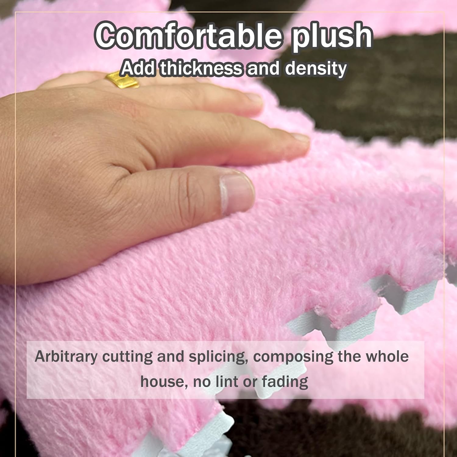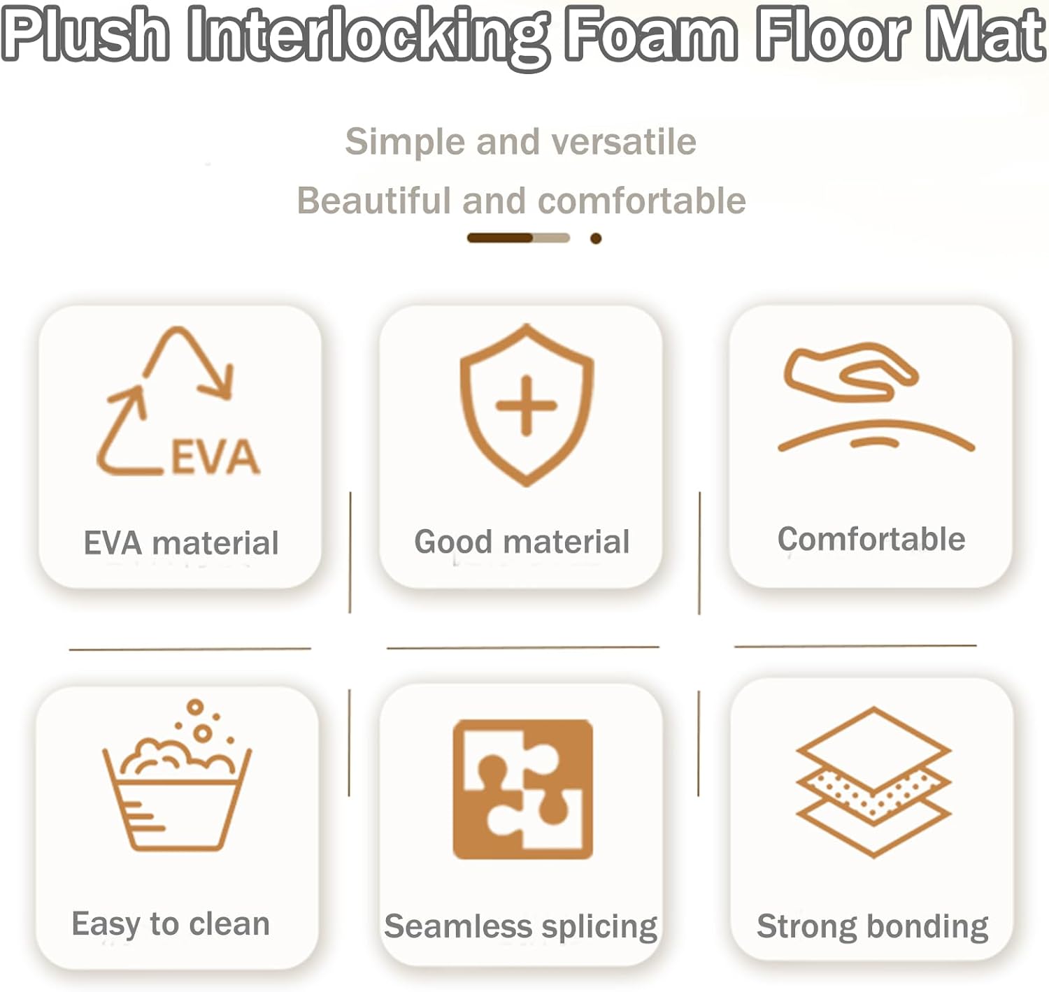 【Set personalizzato da 18 pezzi】 Include 18 piastrelle (12 x 12 pollici/30 x 30 cm, 0,4 pollici/1 cm di spessore) con bordi; mescola colori/tessuti per creare pavimenti personalizzati per sale giochi o camere da letto. 【Schiuma EVA morbida e felpata】 Il design a doppio strato con una parte superiore in peluche e una base in EVA resistente fornisce calore, riduzione del rumore e protezione del pavimento; resiste allo sbiadimento e allo spargimento per un uso a lungo termine. 【Installazione ad incastro senza attrezzi】Le piastrelle ad alta densità si bloccano saldamente in pochi minuti su qualsiasi pavimento duro; leggero e impilabile per un facile smontaggio e uno stoccaggio compatto. 【Creazione di modelli fai-da-te】Personalizza layout con disegni a strisce, a scacchiera o unici utilizzando tessere di colori diversi per abbinarli all'arredamento e allo stile personale. 【Funzionale e decorativo】Migliora la sicurezza e l'estetica nelle aree gioco, nelle camere da letto o negli spazi yoga; fornisce un'ammortizzazione morbida proteggendo i pavimenti da graffi e ammaccature.