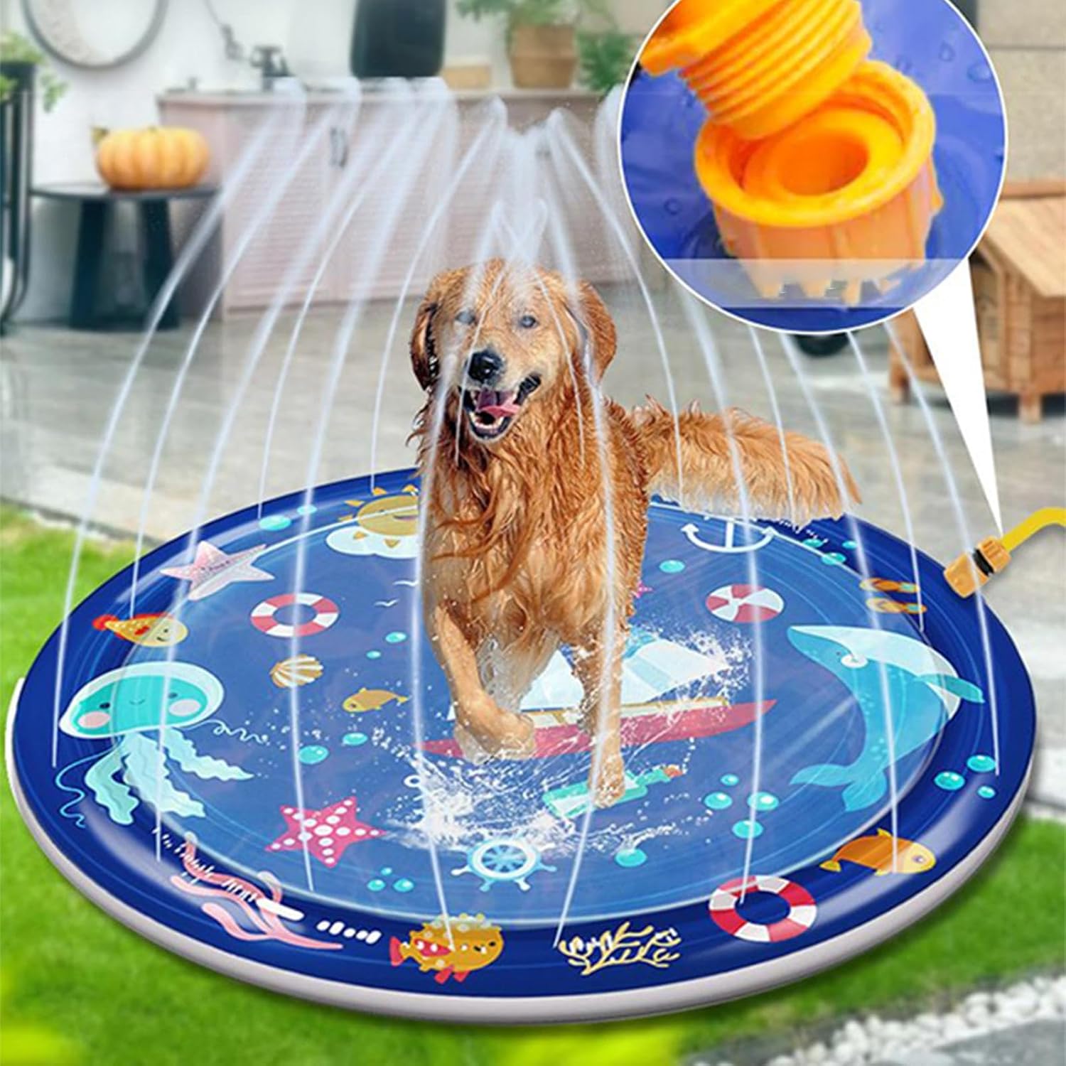 Flusso efficiente: Progettato per tubi standard da 1/2 pollice, abilita riempimento veloce e interazione costante con fontana circolare, amplificando la versatilità di gioco esterno per garantire coinvolgimento immediato e dinamico divertimento sul tappeto spruzzatore Materiale Robusto: Studiato per stabilità in giochi prolungati, caratterizzato da materiali resistenti a graffi e usura, tenuta stagna, potenziato dalla durabilità del PVC rinforzato, per affidabile divertimento all'aperto. Design Compatto:Leggero e facile da trasportare, permette di portarlo ovunque per giochi rinfrescanti senza ingombro aggiuntivo per i proprietari di animali Design Decorativo: Aggiungi un tocco decorativo al tuo giardino con tonalità vivaci a prova di sbiadimento e disegni realizzati con cura che massimizzano l'attrattiva visiva in modo naturale dalla Noia: Contrasta l'irrequietezza con getti d'acqua divertenti che rinfrescano i pet e aumentano la loro energia durante le attività all'aperto