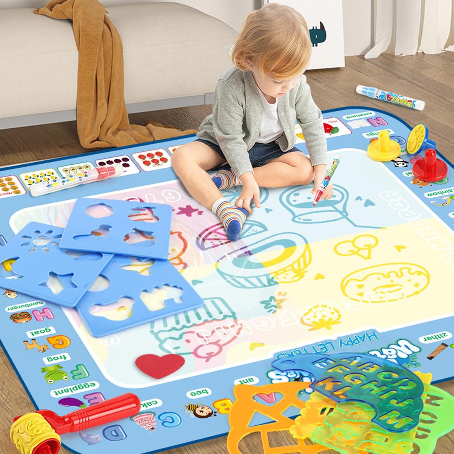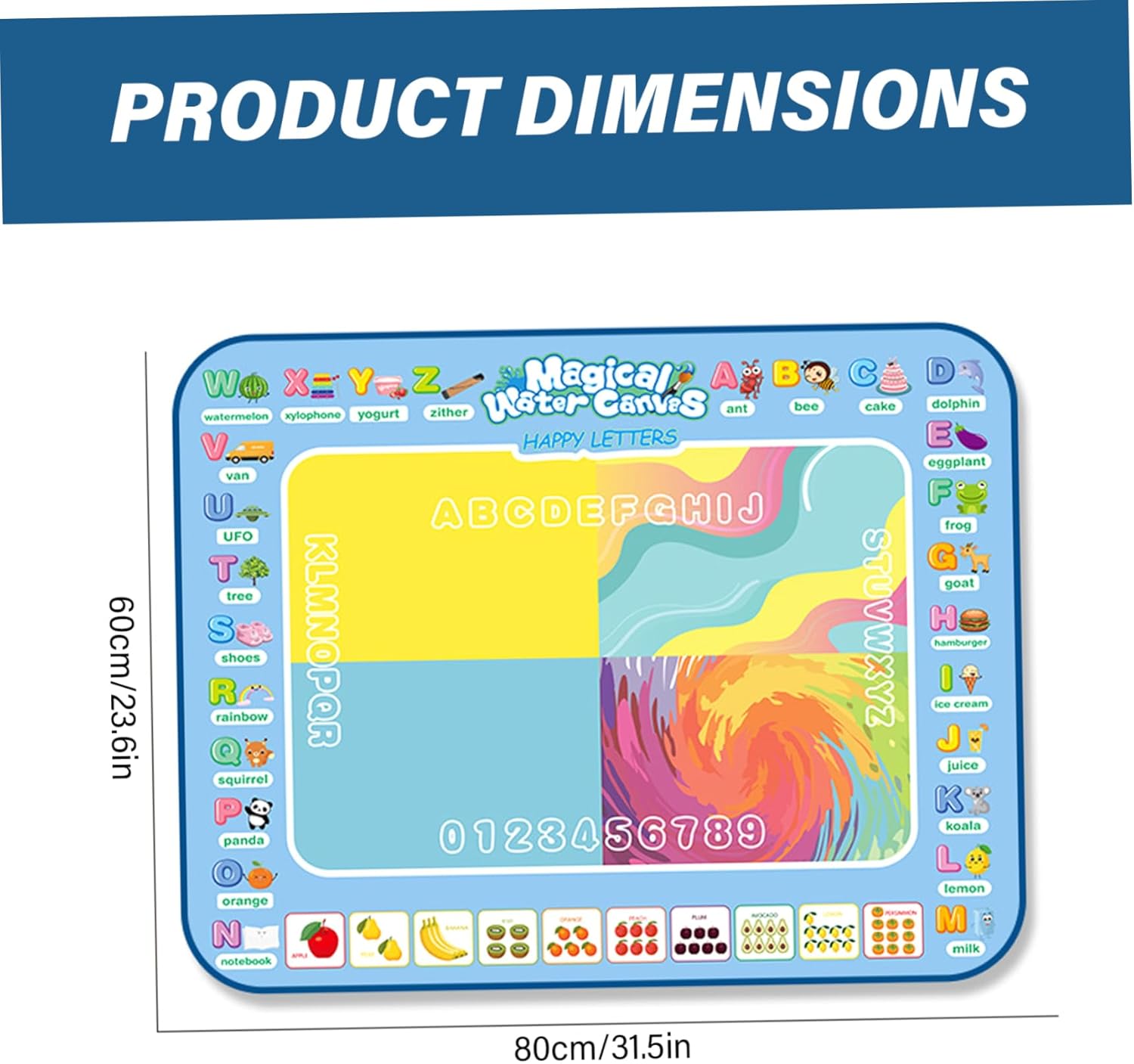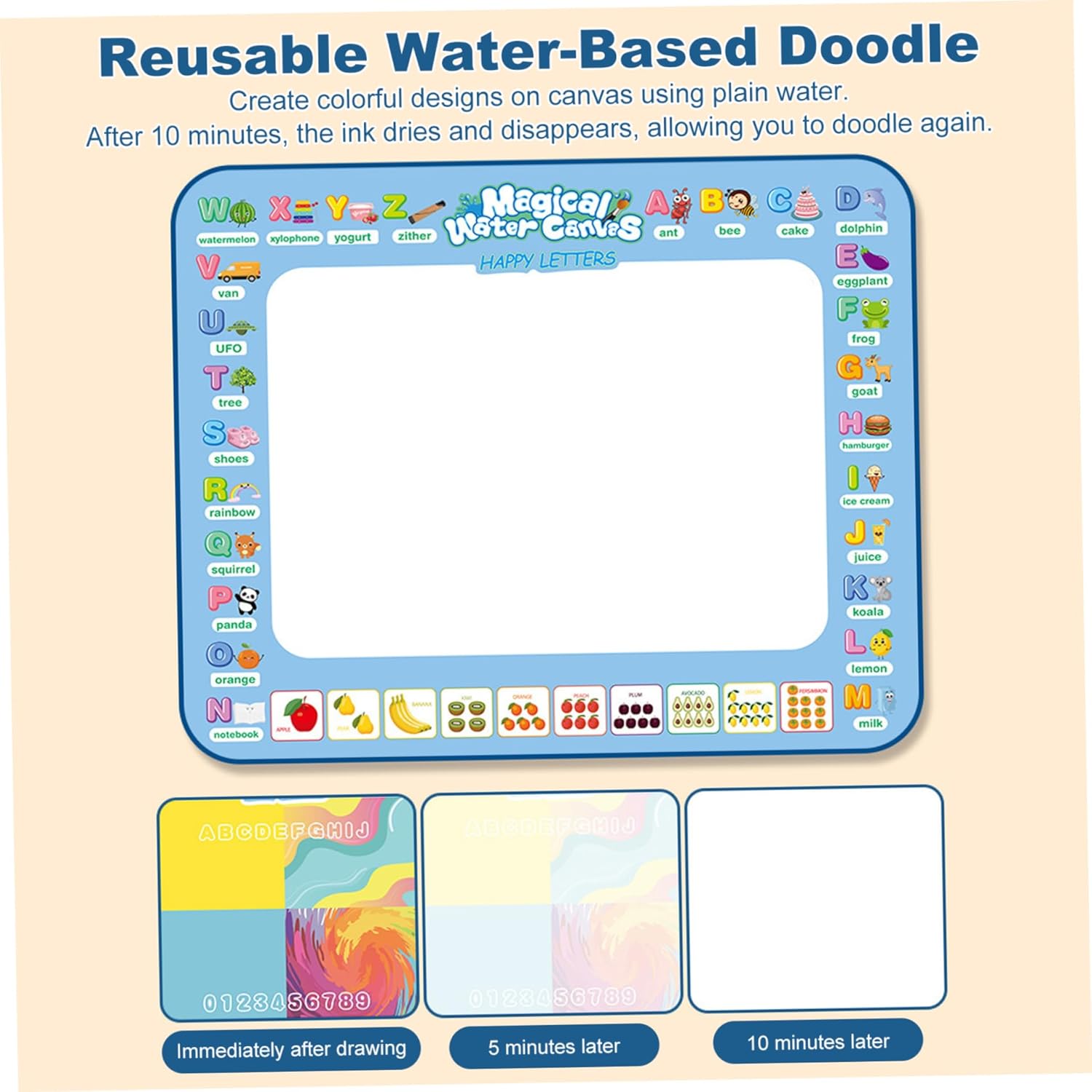 Tela magica riutilizzabile: il tappetino scarabocchio mostra magicamente i colori quando viene spazzolato con acqua, quindi svanisce in circa 10 minuti, pronto per nuovi capolavori ancora e ancora..Divertimento infinito, zero sprechi. Set da disegno completo: dotato di 3 penne attivate dall'acqua, 4 tavole da ricalco in plastica blu, 1 tavola da ricalco in EVA e 1 libro d'arte, questo set fornisce tutto ciò di cui i bambini hanno bisogno per imparare, ricalcare ed esplorare la creatività. Creatività senza disordine: questo tappetino per doodle ad acqua da 31,5x23,6 pollici consente ai bambini di liberare la loro immaginazione senza alcun disordine..Usando solo acqua, i piccoli artisti possono creare disegni vivaci e colorati in modo sicuro e pulito. Divertimento sicuro e portatile: realizzato con materiali ecologici, il tappetino è sicuro da usare per i bambini piccoli..Leggero e pieghevole, è perfetto per il gioco al chiuso o all'aperto, i viaggi o i momenti di legame familiare. Educativo e coinvolgente: il tema Frutta e lettera introduce i bambini alle forme, ai colori e alle lettere in modo divertente e interattivo..Migliora la coordinazione occhio-mano, le capacità motorie e lo sviluppo cognitivo mentre giocano.