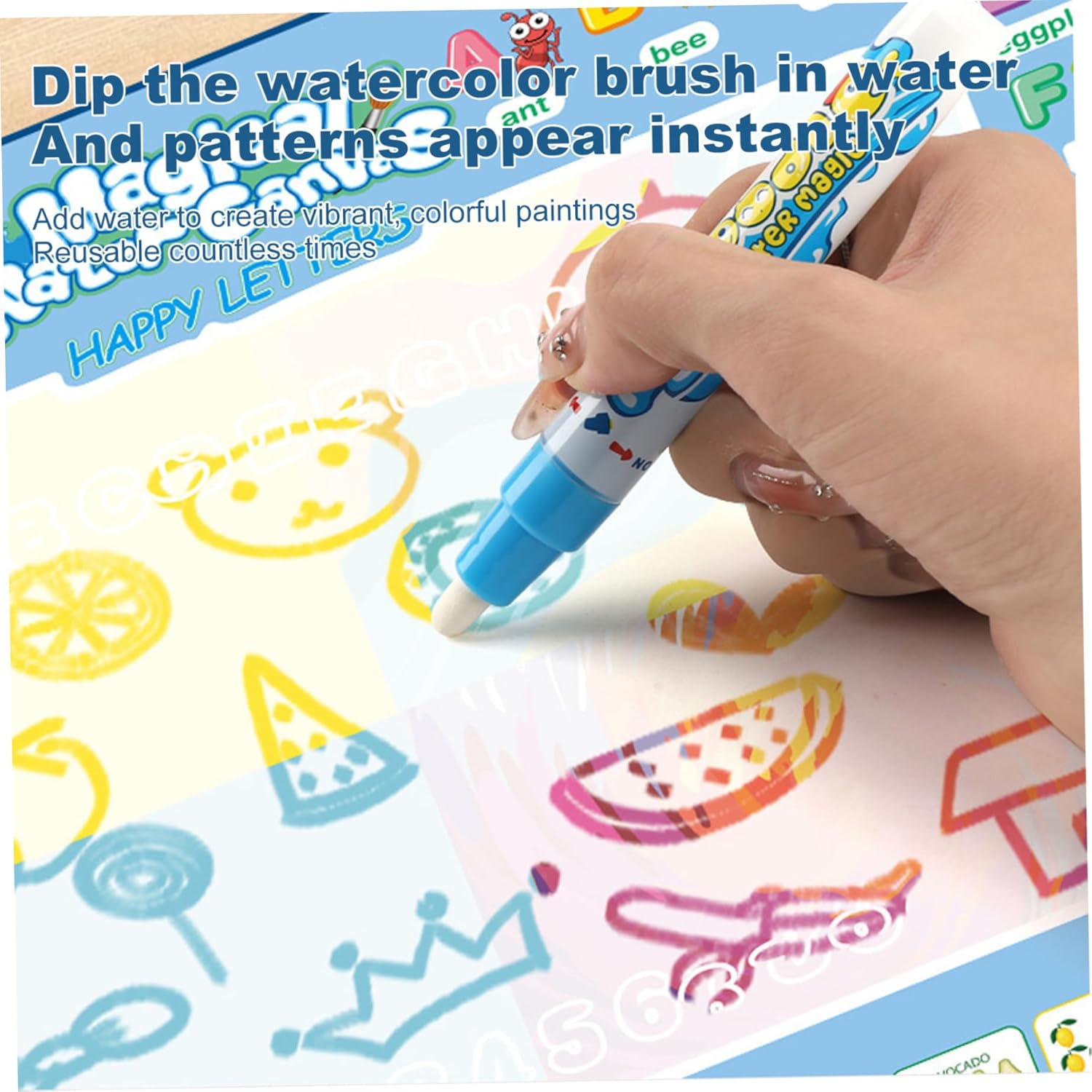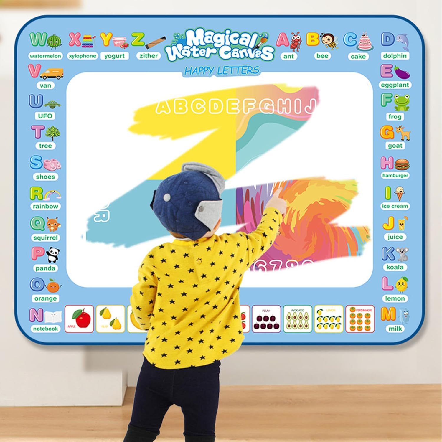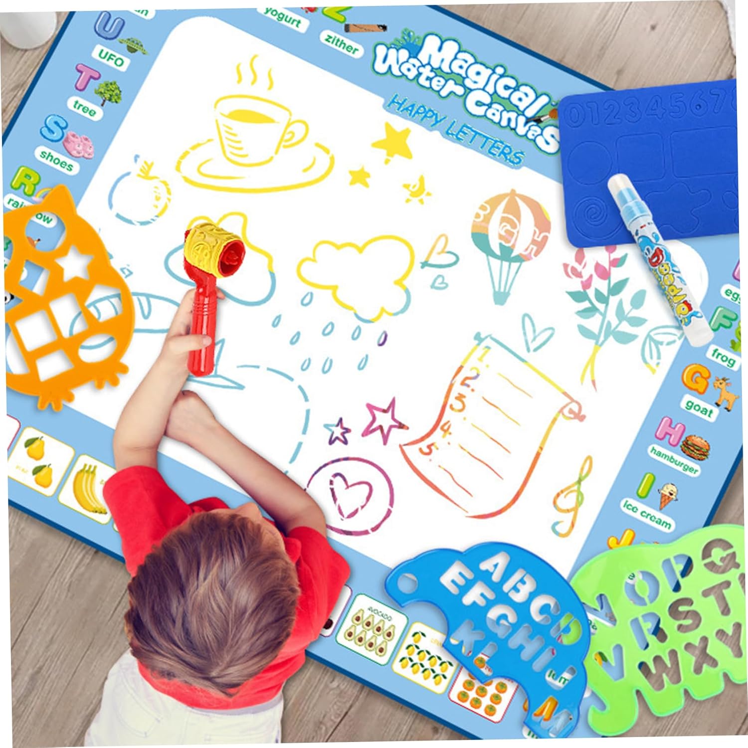 Tela magica riutilizzabile: il tappetino scarabocchio mostra magicamente i colori quando viene spazzolato con acqua, quindi svanisce in circa 10 minuti, pronto per nuovi capolavori ancora e ancora..Divertimento infinito, zero sprechi. Set da disegno completo: dotato di 3 penne attivate dall'acqua, 4 tavole da ricalco in plastica blu, 1 tavola da ricalco in EVA e 1 libro d'arte, questo set fornisce tutto ciò di cui i bambini hanno bisogno per imparare, ricalcare ed esplorare la creatività. Creatività senza disordine: questo tappetino per doodle ad acqua da 31,5x23,6 pollici consente ai bambini di liberare la loro immaginazione senza alcun disordine..Usando solo acqua, i piccoli artisti possono creare disegni vivaci e colorati in modo sicuro e pulito. Divertimento sicuro e portatile: realizzato con materiali ecologici, il tappetino è sicuro da usare per i bambini piccoli..Leggero e pieghevole, è perfetto per il gioco al chiuso o all'aperto, i viaggi o i momenti di legame familiare. Educativo e coinvolgente: il tema Frutta e lettera introduce i bambini alle forme, ai colori e alle lettere in modo divertente e interattivo..Migliora la coordinazione occhio-mano, le capacità motorie e lo sviluppo cognitivo mentre giocano.