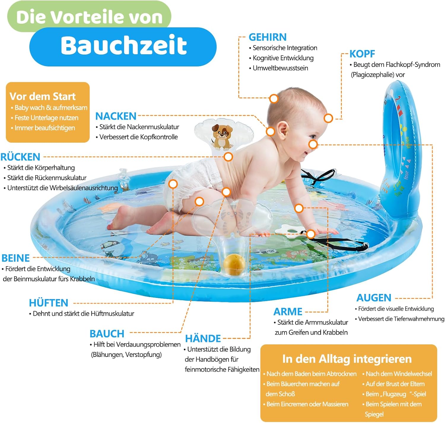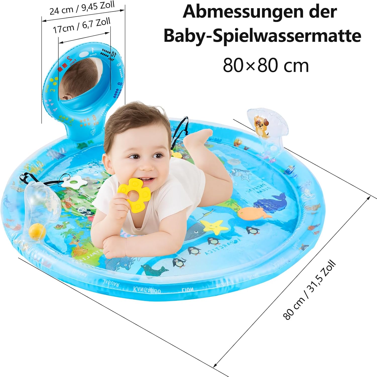 Giocattolo 4 in 1 per la promozione precoce: il nostro tappetino da gioco per la posizione prona è progettato con una mappa della fauna selvatica, che mostra nomi di animali dalla A alla Z, numeri da 1 a 9, colori, forme semplici e mappe del mondo. Contiene tutti gli elementi stimolanti per lo sviluppo del cervello della prima infanzia: specchi a prova di bambino, massaggiagengive, sonaglio/squittii e figure marine galleggianti. Un regalo ideale per i genitori che vogliono godersi la pancia insieme al bambino. 【Vantaggi dello specchio per bambini】La visualizzazione dell'immagine speculare favorisce la visione del bambino, assicura intrattenimento e allena le abilità motorie come puntare e afferrare. Inoltre, aiuta a riconoscere i volti, tracciare i movimenti e concentrarsi sugli occhi. 【2 massaggiagengive – un must have per i bambini dentizioni】 Nella confezione sono inclusi due massaggiagengive rimovibili e due nastri lunghi 40 cm per fissare gli anelli ai lati del tappetino. I massaggiagengive a forma di stella e fiore sono privi di BPA, morbidi, flessibili e appositamente progettati per alleviare il dolore durante la dentizione. Giocattolo sicuro per bambini: la sicurezza del tuo bambino è una priorità assoluta: questo giocattolo è atossico, certificato CPSC e inodore. I nostri tappetini ad acqua sono inoltre più grandi e più spessi del 95% dei modelli sul mercato, per la massima durata e comfort. 【Qualità e servizio】Contenuto della confezione: 1 tappetino per giochi d'acqua, 1 specchio per bambini, 2 massaggiagengive e 2 nastri di fissaggio da 40 cm, 1 manuale di istruzioni (lingua italiana non garantita). Se non siete soddisfatti entro 6 mesi dall'acquisto, offriamo un rimborso o una sostituzione gratuiti, senza problemi.