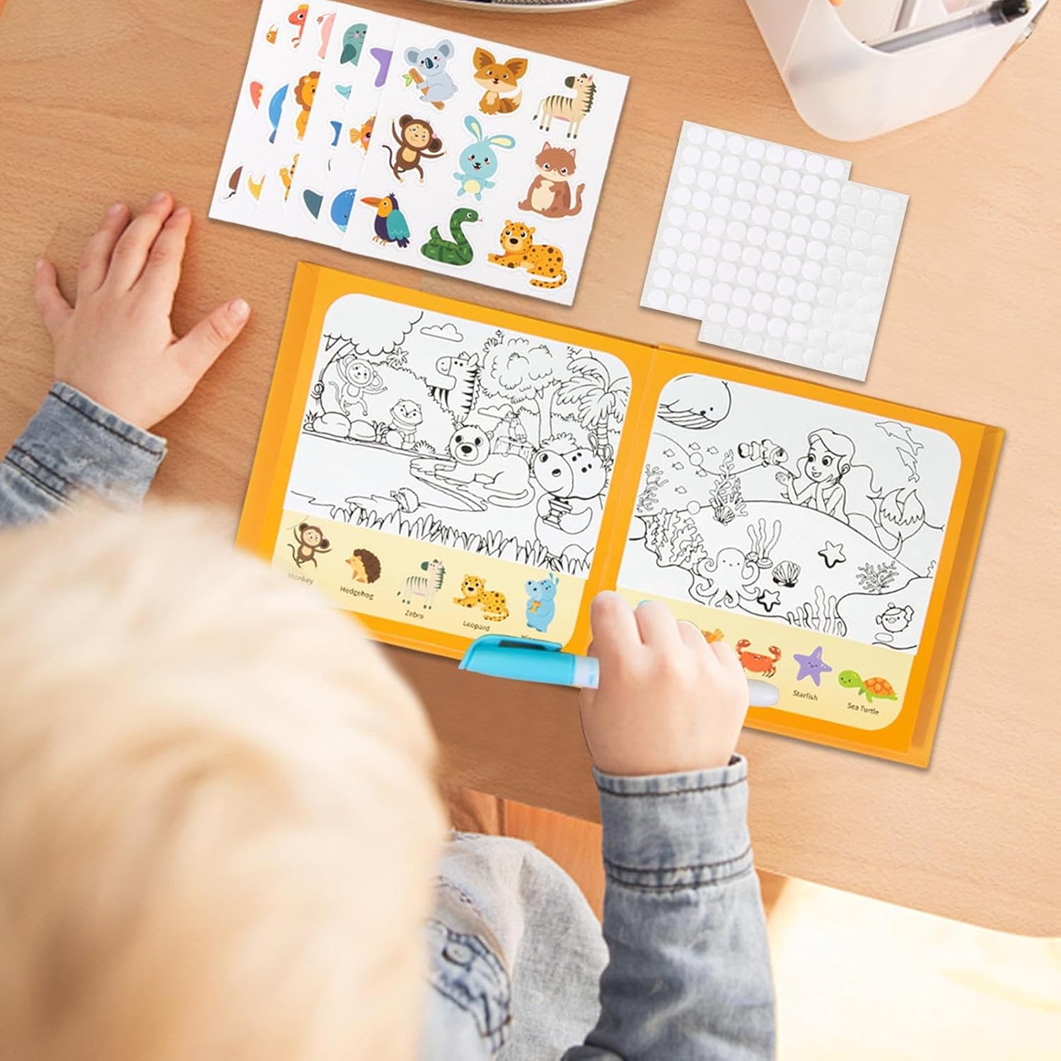 Tappetino Sviluppo Sensoriale: Progettato per stimolare la creatività, il tappetino magico ad acqua utilizza accattivanti inclusi animali e veicoli, promuovendo l'immaginazione e la crescita cognitiva nella prima infanzia, offrendo un modo divertente per i bambini di imparare attraverso l'esplorazione pratica e il gioco sensoriale, adatto per uso domestico o scolastico. Design Sicuro e Riutilizzabile: Realizzato per essere delicato sulle piccole mani, il tappetino per disegnare con acqua garantisce un'esperienza sicura ed emozionante con il suo libro di adesivi riutilizzabile, permettendo ai bambini piccoli e in età prescolare di sviluppare le capacità motorie fini attraverso il ripetuto posizionamento di adesivi e l'esplorazione artistica con l'acqua, in un contesto di gioco sicuro e stimolante per la crescita. Utilizzo Comodo e Pratico: Questo tappeto per disegnare con acqua combina un morbido velluto a peluche corto con chiusure a strappo sicure, offrendo il divertimento del disegno a base d'acqua i design appaiono magicamente e scompaiono quando si asciugano, supportando una maggiore creatività a casa o durante i viaggi in famiglia, con un design riutilizzabile e adatto per attività creative e ricreative. Esperienza di Gioco Coinvolgente: Il tappetino da disegno ad acqua supporta la coordinazione occhio-mano e affina la percezione dei colori integrando lezioni giocose su animali e trasporti, che catturano l'attenzione e un'atmosfera di apprendimento rilassante durante l'uso ricreativo, offrendo un'esperienza educativa e calmante per i bambini in diverse situazioni. Design per Bambini: Con una penna ad acqua progettata specificamente per le mani dei bambini, facile da tenere e operare, questo tappeto da disegno ad acqua permette ai piccoli di riempire la punta, aggiungere acqua e richiudere con semplicità, garantendo ore di divertimento artistico senza versamenti o macchie in qualsiasi setting, come a casa, in giardino o durante le attività ricreative.