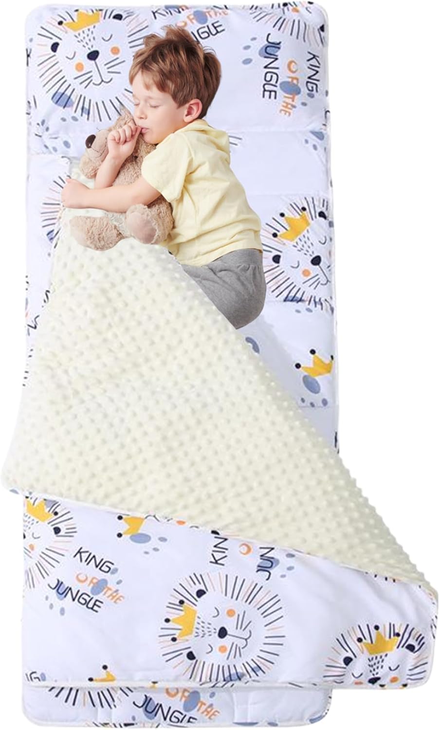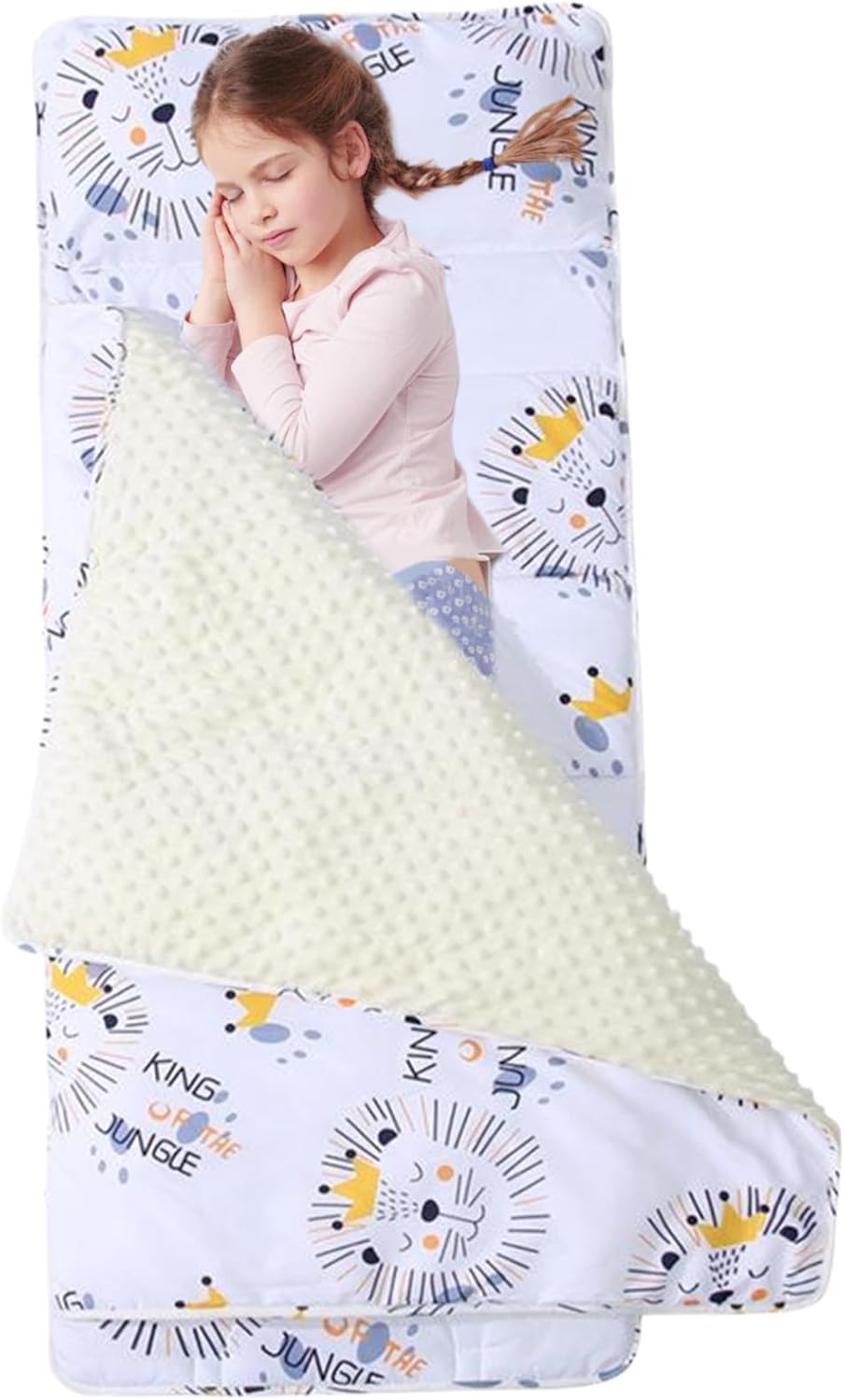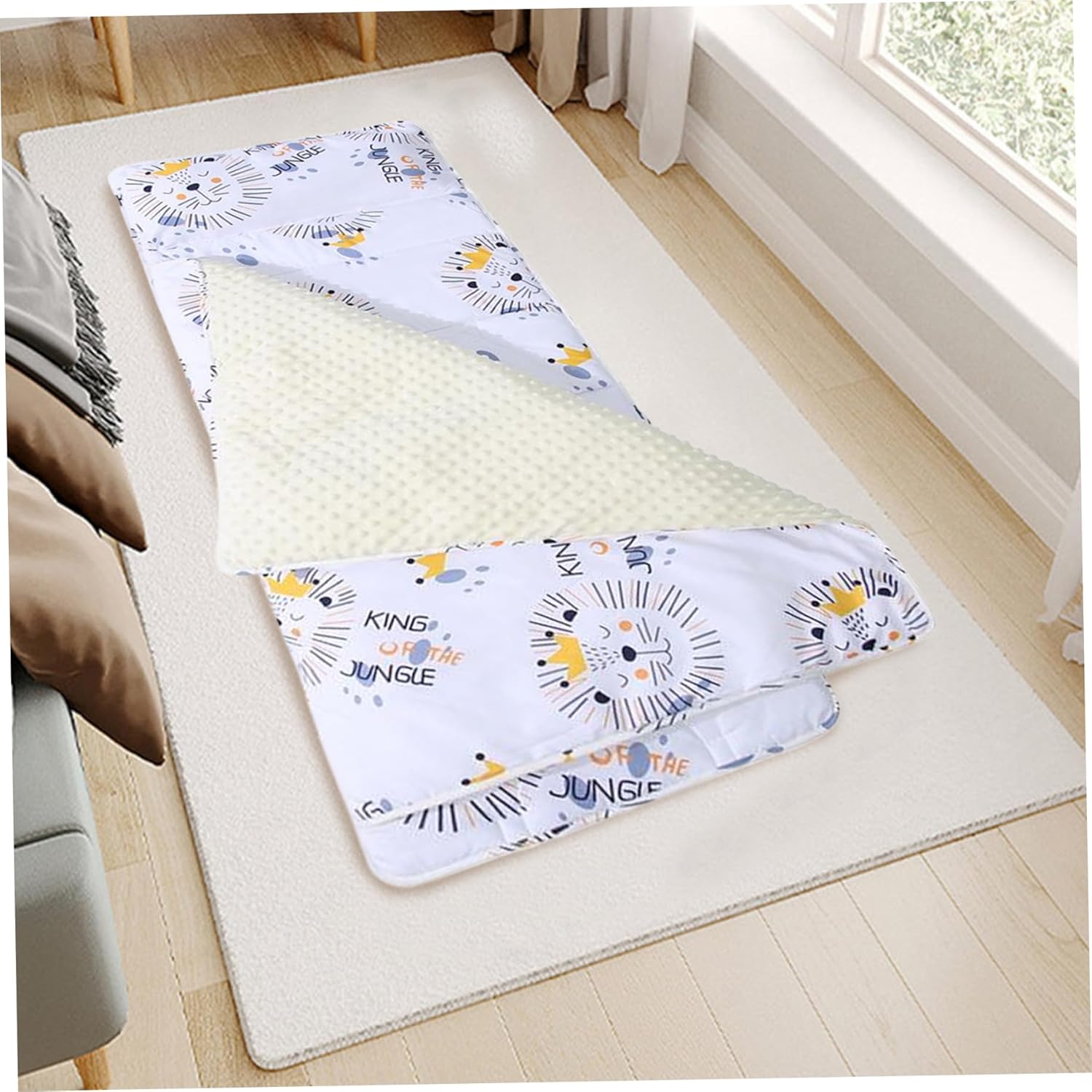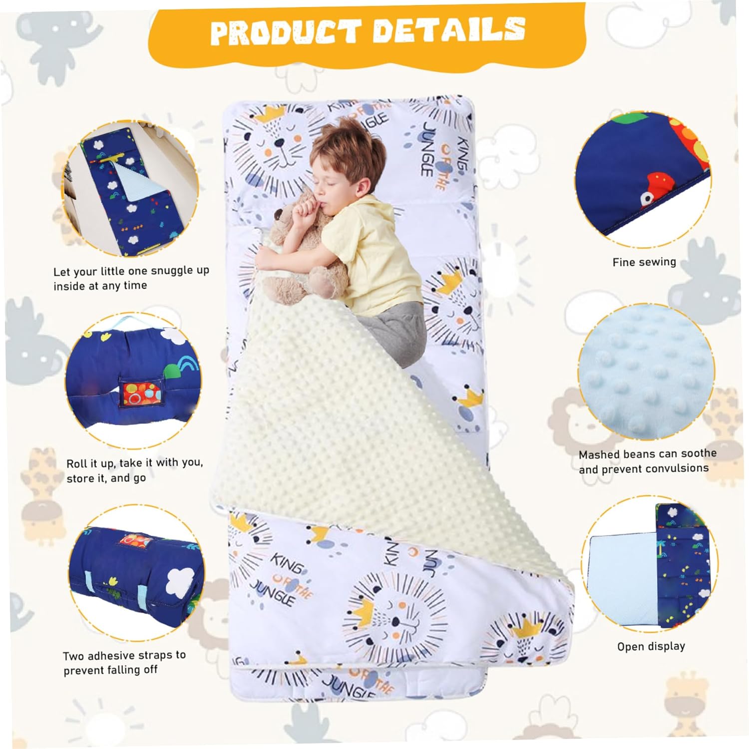 Modelli divertenti per i bambini: decorato con motivi deliziosi e giocosi che i bambini adoreranno, questo tappetino per il pisolino aggiunge ulteriore divertimento al pisolino, rendendolo perfetto per l'asilo nido, la scuola materna o anche le avventure in campeggio. Design a copertura totale: questo sacco nanna per bambini presenta un design onnicomprensivo, con una coperta che può essere infilata sotto il tappetino per evitare che il bambino lo calci via e raffreddi mentre dorme. Tessuto lenitivo: realizzato in fibre sintetiche, la trama con punti in rilievo fornisce un effetto calmante e confortante, garantendo che il tuo bambino rimanga accogliente durante il pisolino. Portatile e comodo: misura circa 49x20 pollici, questo materassino per dormire è di dimensioni generose per adattarsi a bambini di varie dimensioni..Il design avvolgibile, completo di cinghie di sicurezza e maniglia, consente un facile stoccaggio e trasporto. Uso versatile: ideale per una varietà di ambienti, tra cui l'asilo nido e la scuola materna, questo tappetino per il pisolino per bambini è uno spazio confortevole per un pisolino..È perfetto anche per pigiama party, viaggi in campeggio o per l'uso in stanze climatizzate, fornendo calore e comfort ovunque sia necessario.