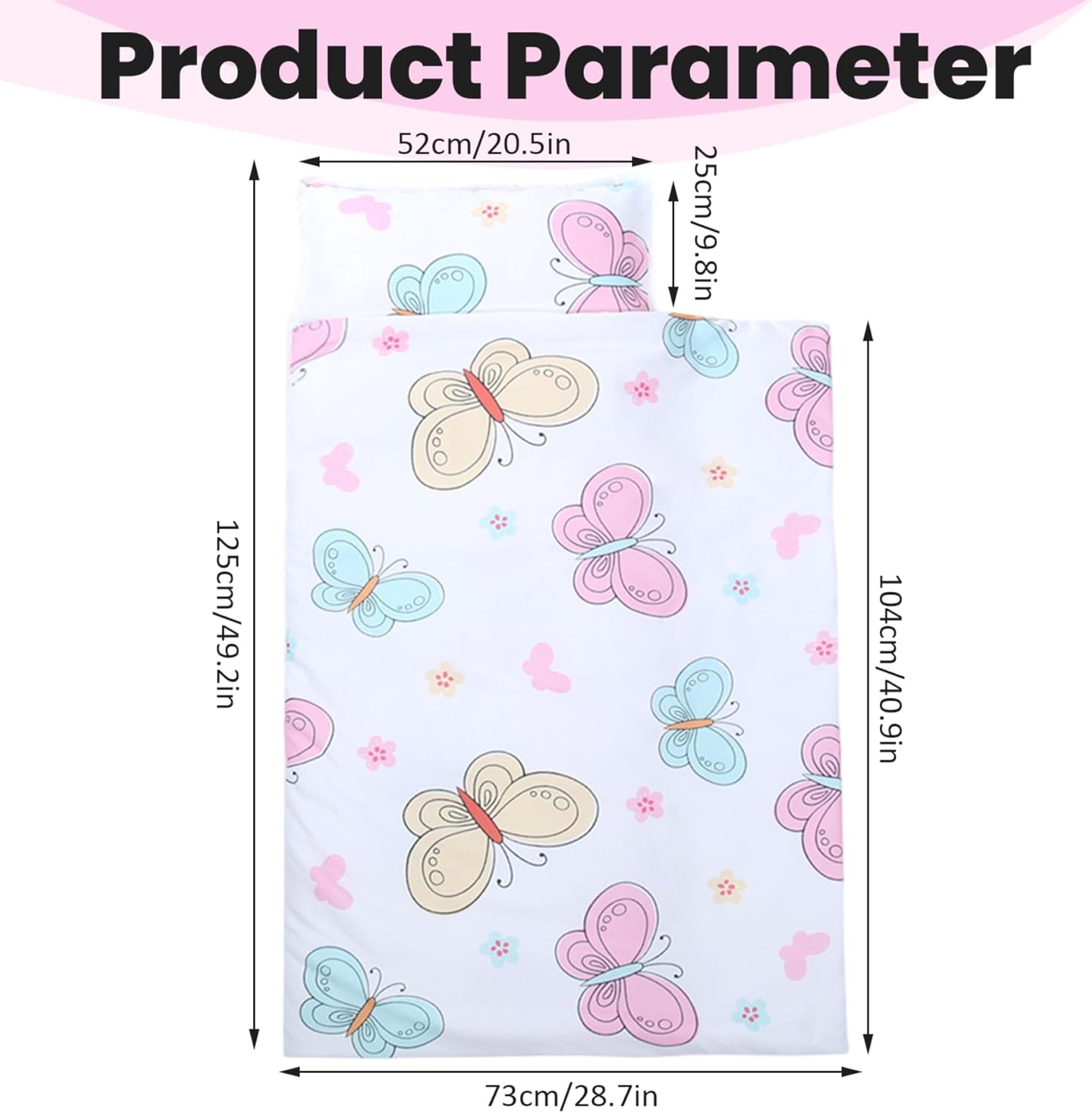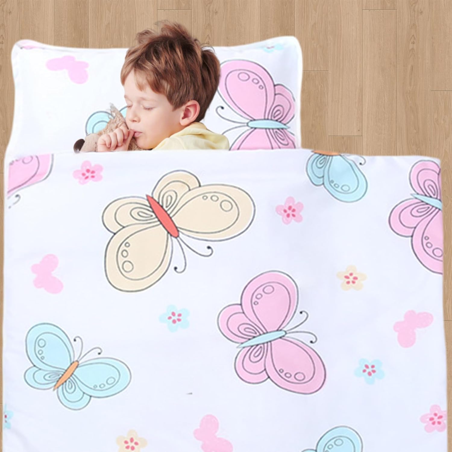 Stampa a farfalla: realizzata in misto cotone e poliestere con vivaci motivi a farfalla, combina resistenza e stile giocoso per coinvolgere i più piccoli Facile da trasportare e riporre: progettato con una comoda maniglia e un design arrotolabile, questo tappetino per il pisolino è leggero e compatto per essere trasportato e conservato senza problemi a casa o a scuola Design comodo e accogliente: caratterizzato da una superficie morbida e imbottita con cuscino e coperta rimovibili, questo tappetino per pisolini per bambini garantisce sonnellini riposanti e confortevoli per l'uso in età prescolare e all'asilo Caratteristiche sicure e anti-calcio: il design del sacco a pelo anti-calcio mantiene i bambini comodi e sicuri, prevenendo lo spostamento della coperta e garantendo sonnellini ininterrotti Versatilità multiuso: perfetto per l'uso all'asilo nido, all'asilo o a casa, questo materassino per sacco nanna per bambini soddisfa varie esigenze, fornendo calore e comfort in tutti gli ambienti