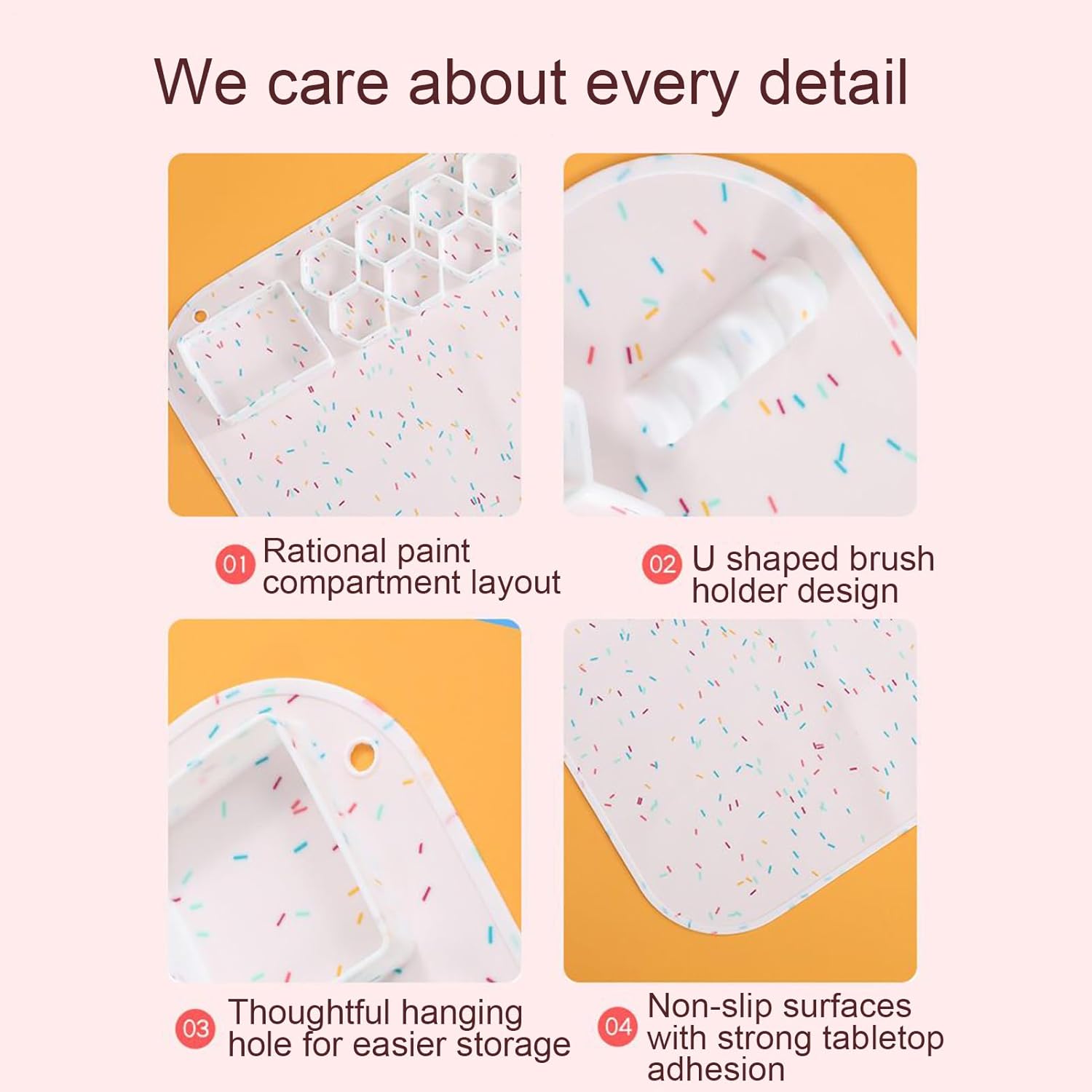 Portatile e salvaspazio: il tappetino per pittura in silicone pieghevole offre un design compatto e portatile per riporlo in modo ottimizzato in termini di spazio in uno zaino o a casa, perfetto per studenti d'arte e professionisti in viaggio con un uso pratico Stazione di miscelazione dei colori: tappetino per pittura in silicone multifunzionale con speciali zone di miscelazione dei colori e superficie lavabile. Consente una facile miscelazione dei colori e un lavoro organizzato durante le attività creative a scuola o a casa. Migliore accessibilità dei colori: questo tappetino da pittura in silicone per bambini è dotato di un portaspazzole a forma di U e dettagli attenti all'utente, consente un facile accesso agli strumenti con uno spazio di lavoro organizzato, rendendo i progetti artistici per i più giovani più divertenti ed efficienti. Superficie priva di residui: la superficie in silicone di alta qualità del tappetino per verniciatura resiste allo stiramento e alle rughe e offre una durata costante con una consistenza fine che risulta confortevole sotto la mano. Previene deformazioni e sgualciture, garantendo una concentrazione ininterrotta su qualsiasi attività, dallo schizzo al progetto completo. Ordine quando si dipinge: la base antiscivolo offre una presa salda sul tavolo, impedisce lo scivolamento e protegge dagli schizzi di vernice, perfetta per attività di pittura e progetti di disegno con bambini o da soli