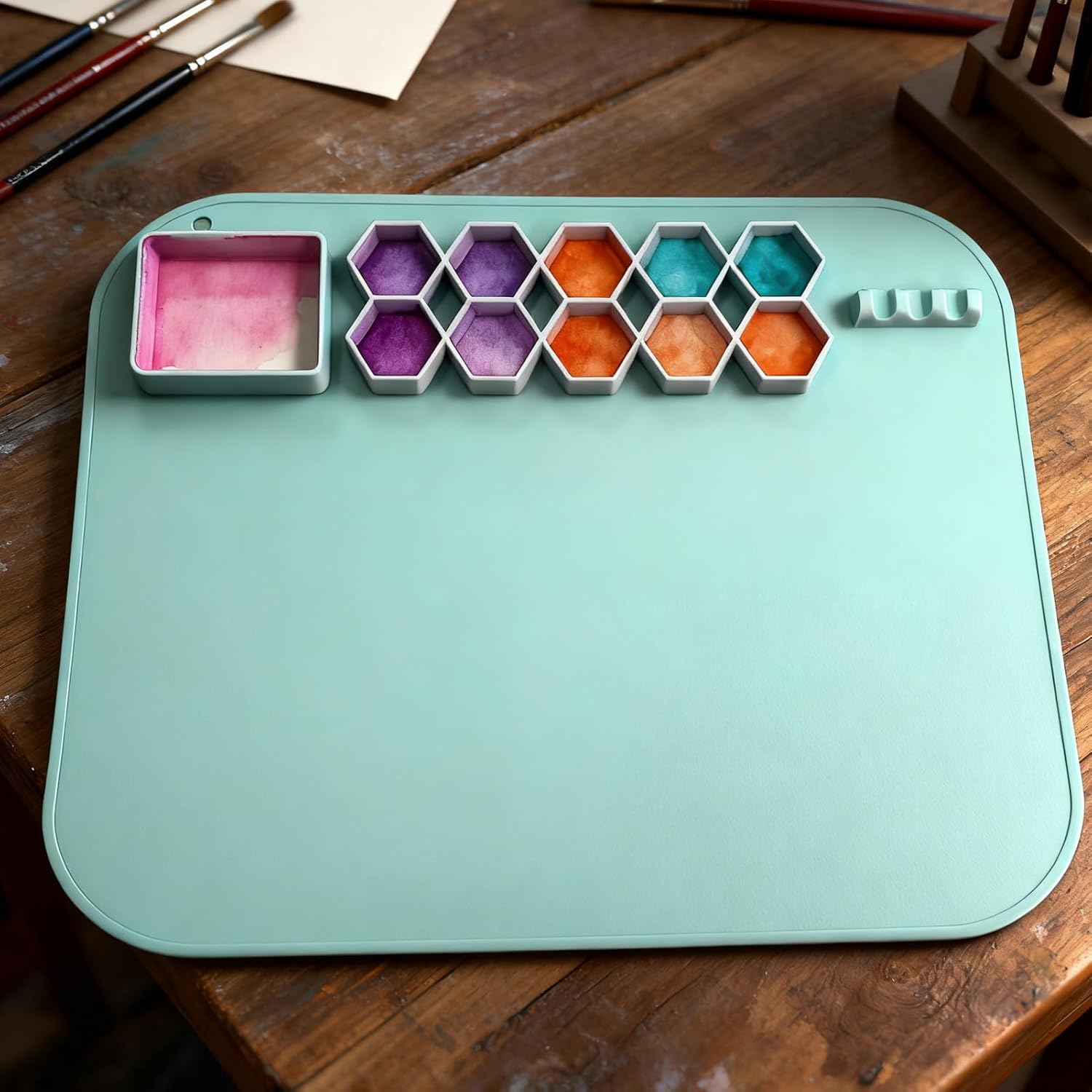 Tappetino per pittura adatto ai viaggi: la struttura pieghevole di questo tappetino per pittura in silicone migliora la portabilità e semplifica lo stoccaggio, ideale per gli artisti durante il lavoro sul campo o come accessorio complementare per gli studi domestici. Soluzione multifunzionale in tessuto per pittura: questo tappetino per pittura in silicone funge allo stesso tempo da superficie di pittura e tavolozza di colori. La superficie lavabile e riutilizzabile con zone di miscelazione dei colori integrate semplifica la pulizia. Perfetto per gli studenti d'arte in classe o nei progetti domestici. Organizzazione intelligente del colore: il tappetino da pittura in silicone per bambini organizza attentamente la pittura per colore e presenta un design ad accesso rapido per gli strumenti, creando uno spazio artistico intuitivo in cui i bambini possono immergersi in progetti fantasiosi senza distrazioni. Resistente allo stiramento e alle pieghe: realizzato in silicone di alta qualità, questo tappetino per pittura resiste efficacemente allo stiramento e alle pieghe, mantenendo la sua forma a lungo e fornendo una superficie morbida e delicata senza segni di rughe. Supporta la creatività senza soluzione di continuità sia nei progetti artistici professionali che nei progetti fai-da-te. Ordine quando si dipinge: la base antiscivolo offre una presa salda sul tavolo, impedisce lo scivolamento e protegge dagli schizzi di vernice, perfetta per attività di pittura e progetti di disegno con bambini o da soli
