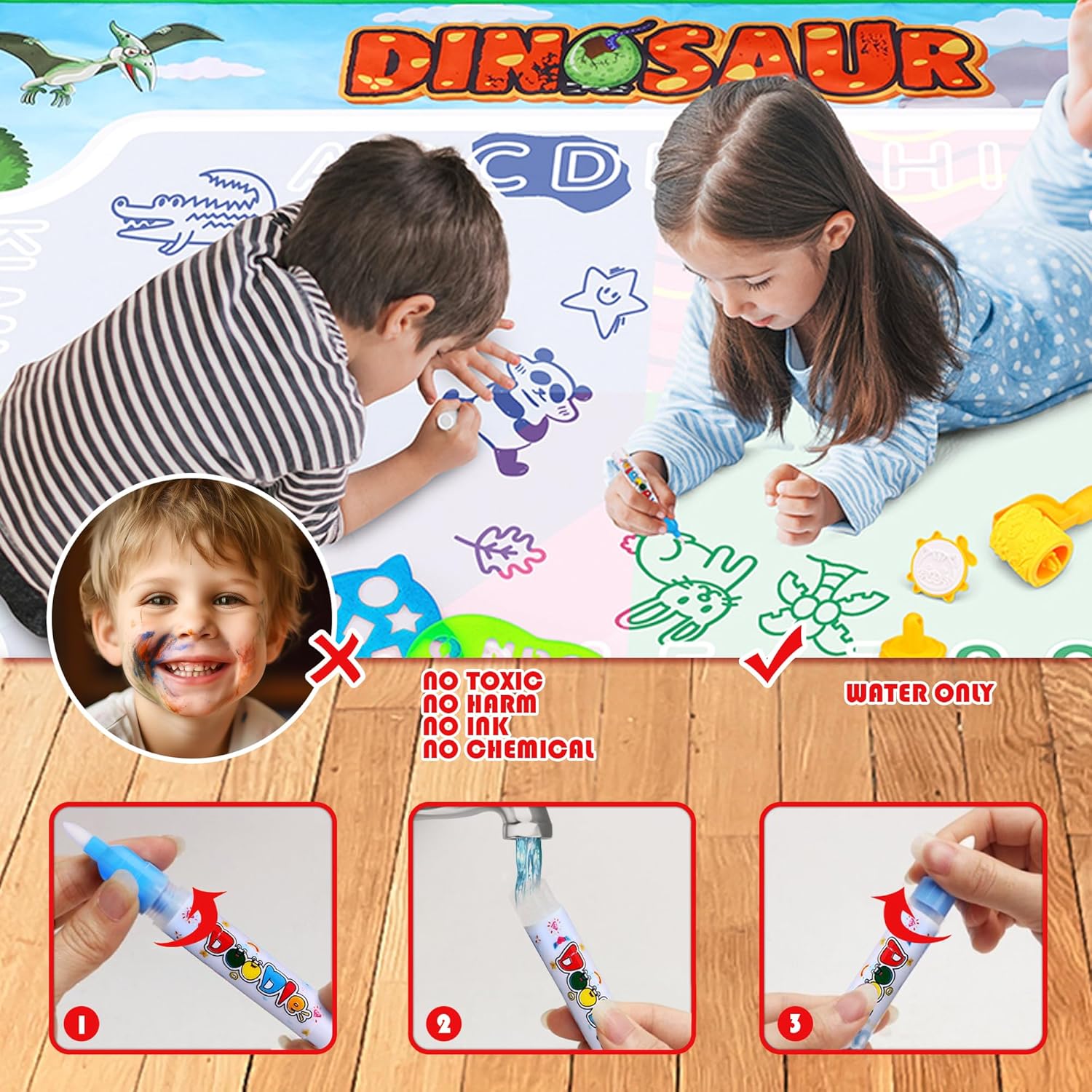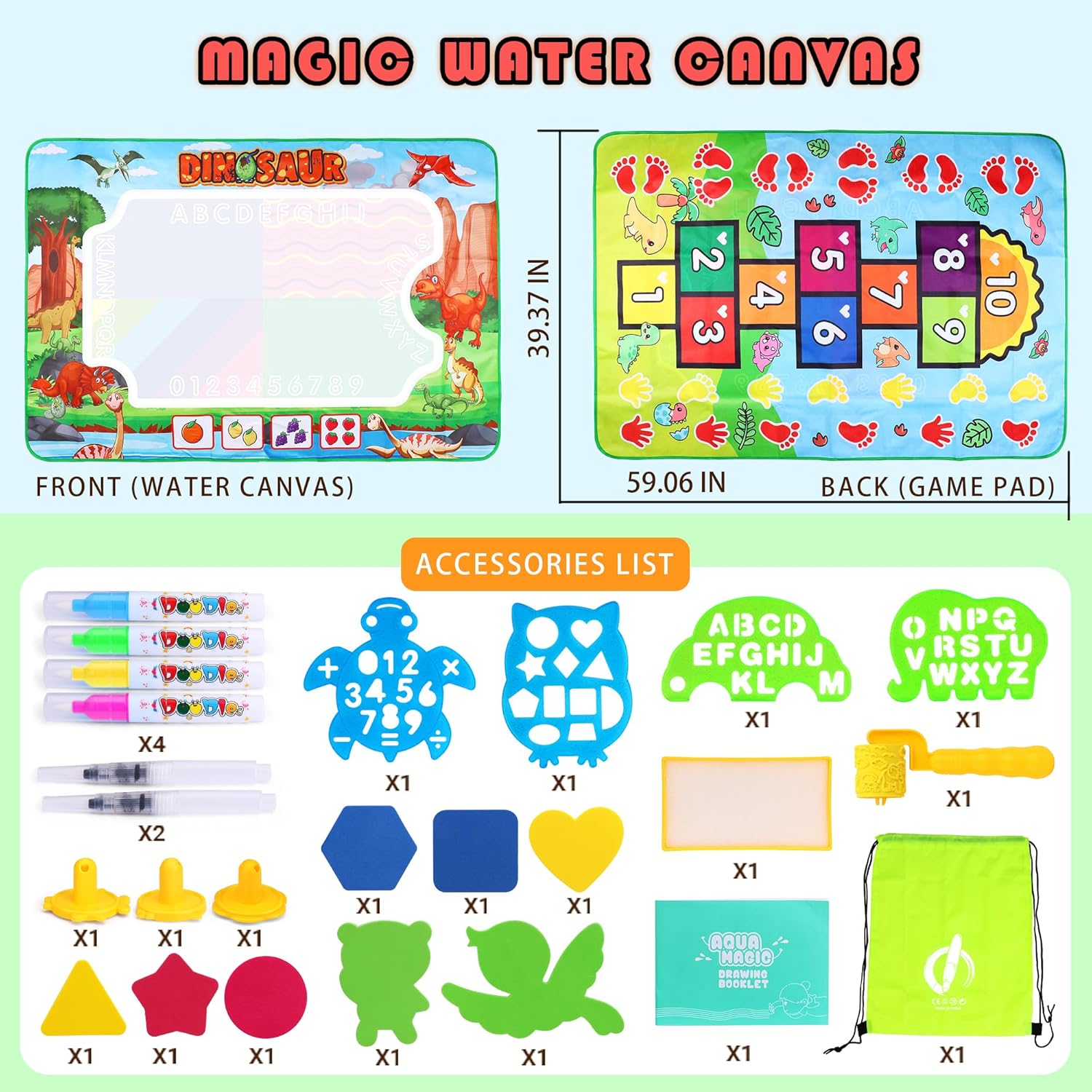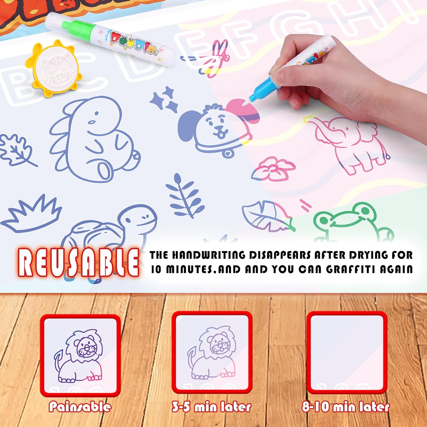 【Kit da colorare completo per bambini da 26 pezzi】 Questo bellissimo tappetino da gioco viene fornito con 1 tappetino per scarabocchi ad acqua, 2 pennelli per matita, 4 matite magiche (arancione giallo blu verde), 8 forme di spugna, 4 tavoli da disegno traforati, 1 cuscinetto a rulli, 3 timbri, 1 pannello assorbente per l'acqua, 1 libro illustrato di cartoni animati, 1 borsa. Basta versare l'acqua nella matita magica e iniziare a disegnare sul tappetino per scarabocchi ad acqua, che è sufficiente per consentire a 3-4 bambini di disegnare e scarabocchiare allo stesso tempo. 【Grandi graffiti d'acqua magici opachi】 Utilizza la matita a base d'acqua al 100% per dipingere! Il magico tappetino per graffiti sull'acqua può stimolare la creatività e l'immaginazione dei bambini. Allena la coordinazione occhio-mano e la percezione del colore. Il tappetino per scarabocchi ad acquerello contiene 26 lettere e dieci numeri. Permette ai bambini di imparare forme, colori, lettere e numeri disegnando, promuove lo sviluppo dell'apprendimento precoce nei bambini, giocattolo educativo molto adatto per bambini dai 3 anni in su. 【Giocattoli per bambini con tappetino per doodle sicuro】 Il tappetino per doodle di acqua magica è realizzato in tela impermeabile. Nessun inchiostro, nessuna vernice, rispettoso dell'ambiente, il che fa bene alla salute dei bambini piccoli. Il tappetino per scarabocchi ad acqua è leggero e facile da riporre. Occupa poco spazio, è portatile e adatto per l'esterno o in viaggio. Può essere utilizzato per molti anni e regala ai tuoi figli un'infanzia felice. 【Grande giocattolo divertente ed educativo】 Dimensioni super grandi, il tappetino da disegno Water Doodle misura 120x90 cm. Offre un'ampia area da disegno per tenere occupati e divertiti i tuoi bambini per ore. I genitori possono disegnare con i bambini per godersi il tempo in famiglia. I bambini possono invitare i loro amici a disegnare con loro, rendendolo un giocattolo perfetto per i bambini a cui piace scarabocchiare o disegnare. 【Regali per bambini dai 3 agli 8 anni】 Questo tappetino magico per scarabocchi è un buon giocattolo educativo per i bambini piccoli, per sviluppare il cervello dei bambini, le capacità motorie e le abilità sociali, per sviluppare le prime capacità di scrittura e lettura e per sviluppare l'applicazione cognitiva di colori e forme. Questo giocattolo è adatto a bambini di età compresa tra 3,4,5,6,7 e 8 anni.