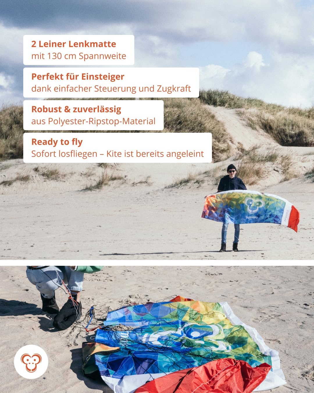 APERTURA ALI: Tappetino direzionale a due linee - Maggiore è l'apertura alare, maggiore è la potenza di trazione dell'aquilone acrobatico MATERIALE: Realizzato in materiale poliestere ripstop - Il materiale robusto perdona atterraggi ancora più duri SCEGLI LA TUA TAGLIA: L'Airtwister 1.3 ha un'apertura alare (area) di: 130 cm (0,6 mq) / Età minima: 8 anni PRONTO PER VOLARE: L'aquilone viene consegnato già legato ed è quindi pronto Pronto a volare subito, non potrebbe be easy TUTTO INCLUSO: viene fornito con un pratico zaino e anelli di volo: divertimento in volo per tutta la famiglia